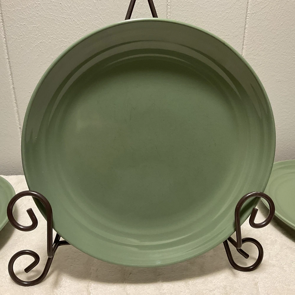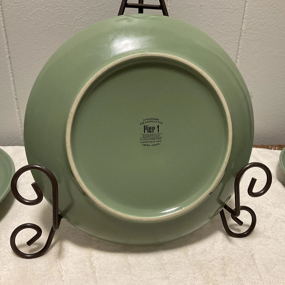 DUE TO RESIDING ON THE EAST COAST AND HIGH SHIPPING COSTS AT THIS TIME THESE ITEMS ARE NOT AVAILABLE TO RESIDENTS RESIDING IN THE WEST COAST STATES, HAWAII, PUERTO RICO Here is a 3 piece set of Salad (Lunch, Desert) Plates by Pier 1 Imports Elemental Earthenware Moss Green These Plates were made especially for Pier 1. This brand is known for its high quality products They are approximately 8” in diameter and are 1 1/4” tall. They are dishwasher and microwave safe. These plates are in good used condition. They are free of chips and cracks Photos are of the exact items you will receive ( PLATES ONLY! STAND NOT INCLUDED ) Please ZOOM IN on ALL the photos as they are part of the description and provide detail views of the condition of these plates. I strive to ship my items within 24 hours after payment received Thank you for shopping with me!