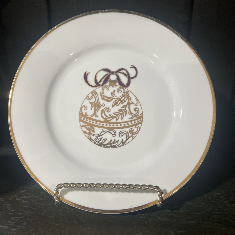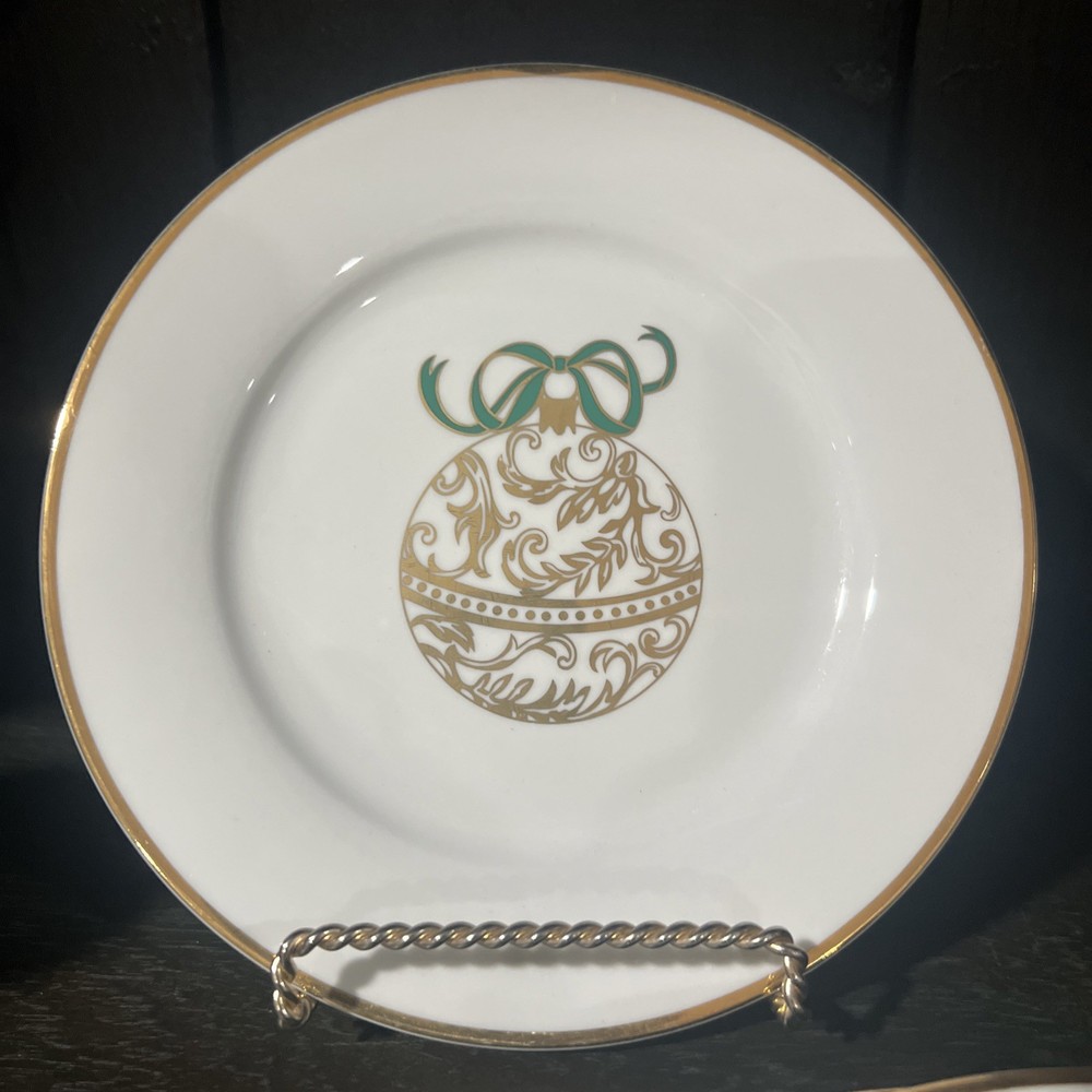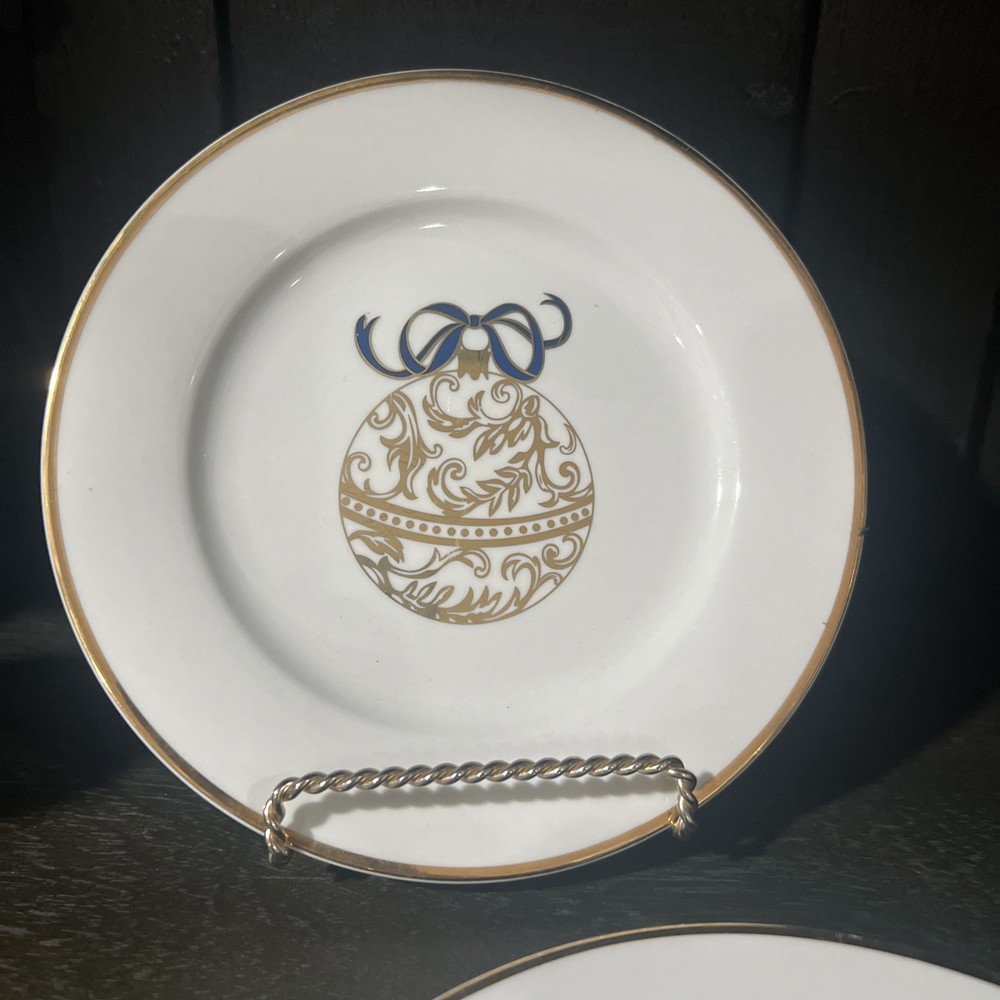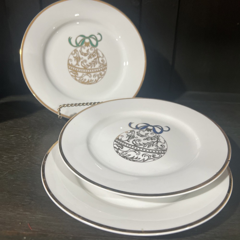 These plates measure 7.5 inches in diameter and feature a beautiful ornament pattern in a glossy finish. These plates are perfect for any occasion, including Christmas, and are sure to impress your guests. The plates are made of high-quality porcelain and are decorated with a classic style that is both timeless and versatile. They are easy to clean and maintain, and are hand wash only. Displayed only and never used. Each ornament is embellished with a different color bow (navy, burgundy and green)