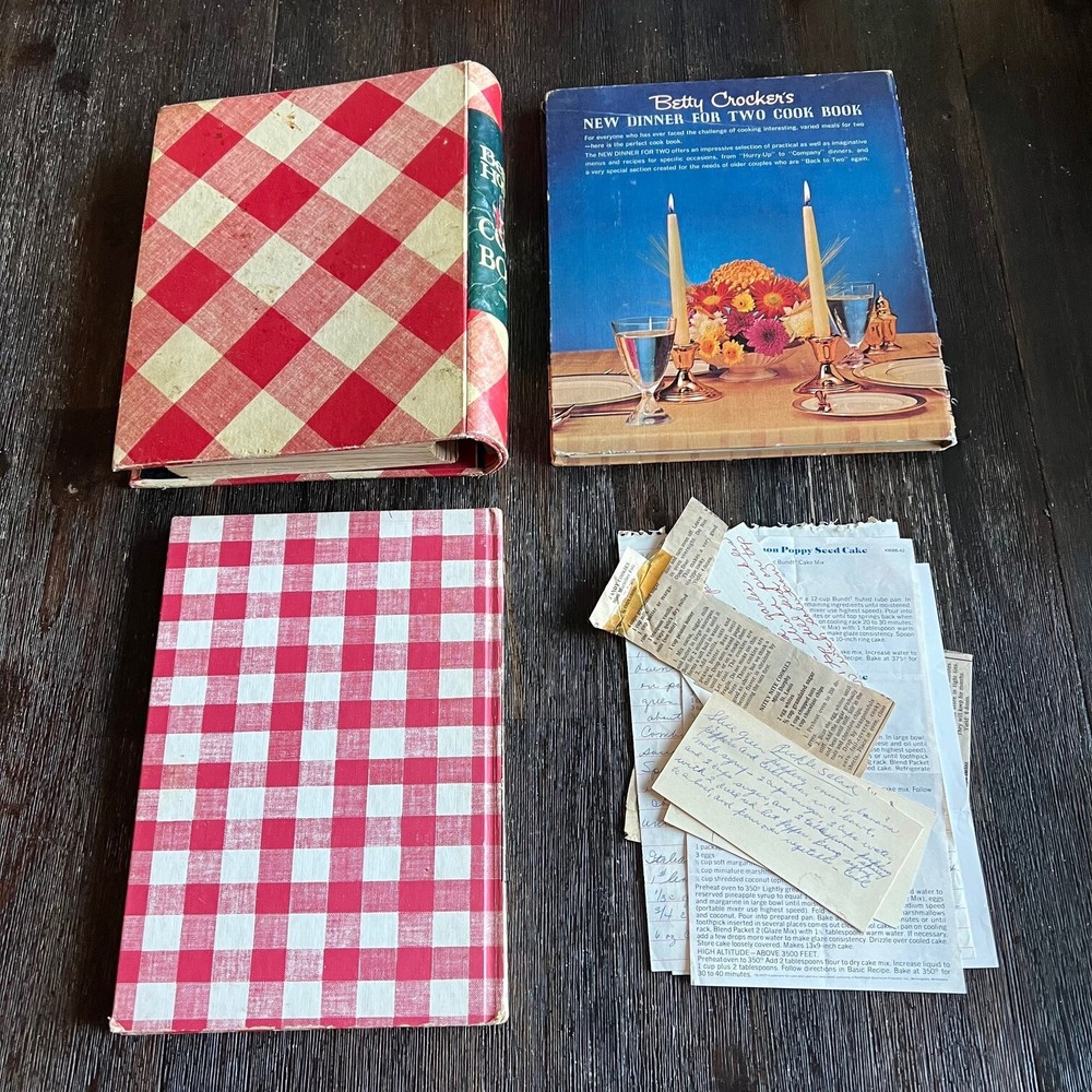 **While I believe this description to be accurate, this item is being sold as-is with no returns** You will receive three vintage cookbooks and a few recipes from someone's personal collection (from the newspaper, hand written, etc.). You will receive the following: Better Homes and Gardens New Cook Book - fair condition; binder version; based on our research, we believe this to be a 1971 printing. I have flipped through the book a couple of times and it appears to be missing five pages -- the title page (no recipes, but it did contain the copyright information, so I don't know what printing this copy might be), page 33/34 (33 is a picture, 34 is recipes), page 65/66 (65 is a picture, 66 is recipes), page 141/142 (141 is a picture, 142 is recipes), and page 151/152 (contains recipes); you WILL receive printed black and white printed copies of these missing pages (I have another copy, so I scanned and printed the pages). The spine has a small area that looks it melted (see picture). The covers have some staining and some wear. Some of the pages have stains, but all the recipes are completely readable. Better Homes and Gardens Junior Cook Book for the Hostess & Host of Tomorrow - good condition; hardcover; Revised Edition, First Printing, 1963. No missing pages. There are a small number of pages with small stains, but for the most part, the pages are in nice shape. The front cover has a small scuff. The front and back covers have some light wear and light smudging. Betty Crocker's New Dinner for Two Cook Book -- Golden Press, Fourth Printing, 1964-- good condition; hardcover, spiral bound. Not missing any pages, but the last page (155/156) has come loose from the binding (see picture). One page has an area where it looks like there may have once been a paperclip. A couple of pages have some smudging near the top edges, but for the most part it looks like the pages escaped any serious stains. The covers have some wear, especially on the spine and near the edges. Miscellaneous recipes - you will also receive someone's personal recipes that were tucked into some of these books. They could be hidden gems - who knows! You will receive 2 pieces of paper with hand written recipes on them, there is one notecard and two smaller cards that have hand written recipes on them, a couple of newspaper clippings with cookies recipes, and 3 Bundt cake recipes that look like they were some kind of Pillsbury publication. **While I believe this description to be accurate, this item is being sold as-is with no returns** See pictures for more details. If you have any questions, please let me know. Thanks for looking!