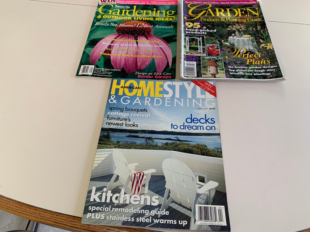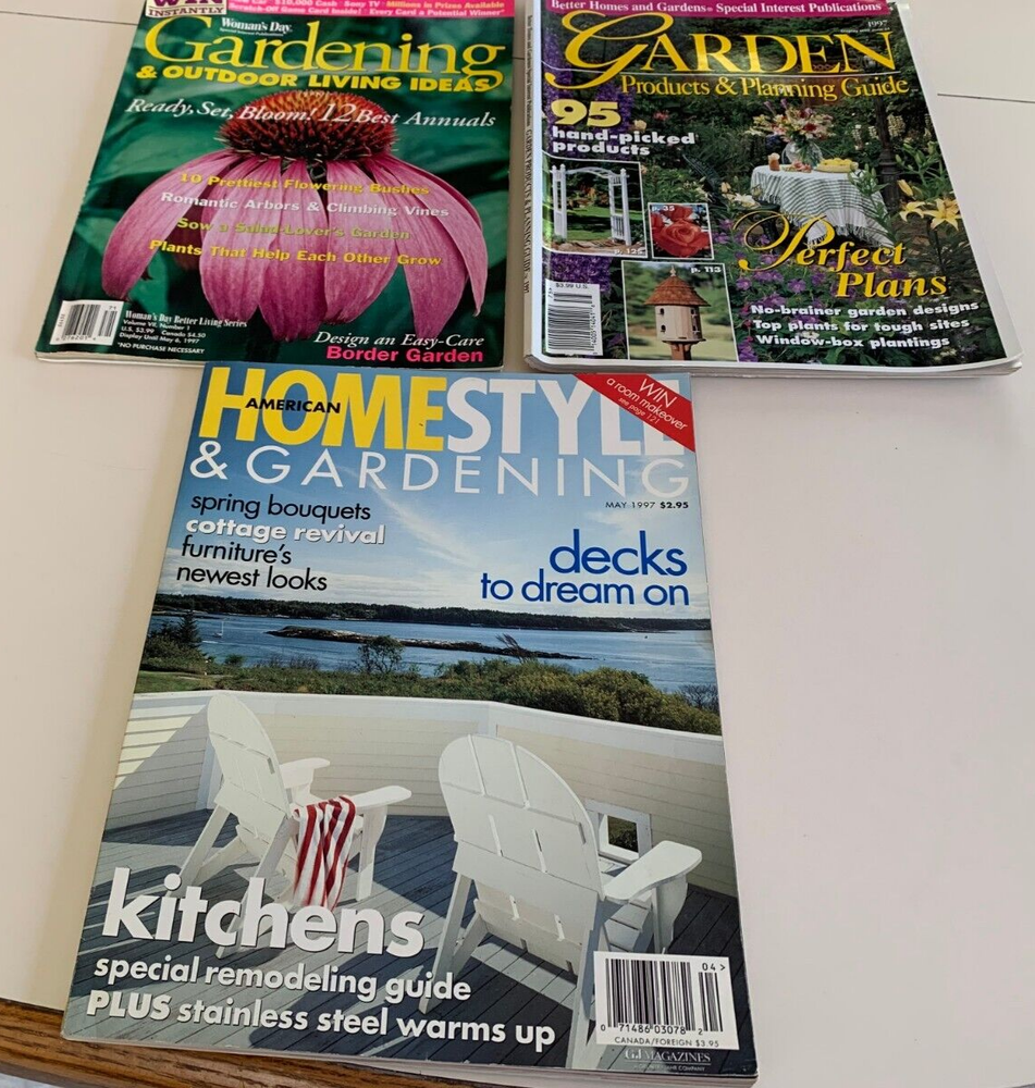 Take a step back into outdoor living and gardens of 1997. There is one magazine each of Woman's Day, Better Homes and Gardens and American Homestyle and Gardening. They were purchased when we were remodeling our home and are like new no tears or writing.