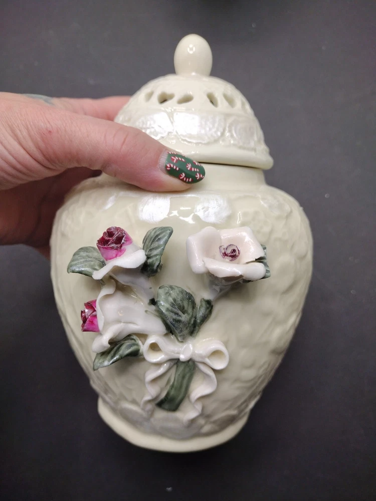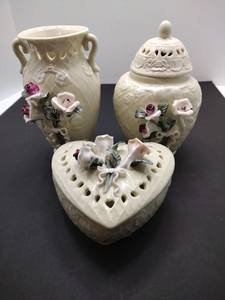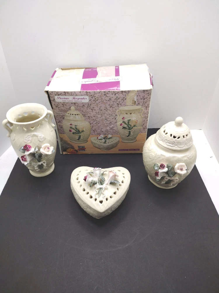 3 Vtg Jay Import precious Keepsake Trinket Boxes with roses 1 is a vase, read!. 1 chip is hard to see on lidded round one, flowers are very delicate but I saw no other chipping. These are very feminine. Will be packed in a different box, this one is not in best of condition. But will be included. We try to source items that are in great shape , unless other wise noted above. This item will be in good used condition with no major defects. All used items will show wear , expect minor marks / wear to fabric and friction surfaces. All Textiles will have odors from previous Owners,Storage and Thrift Stores Etc. Thank you for considering our items