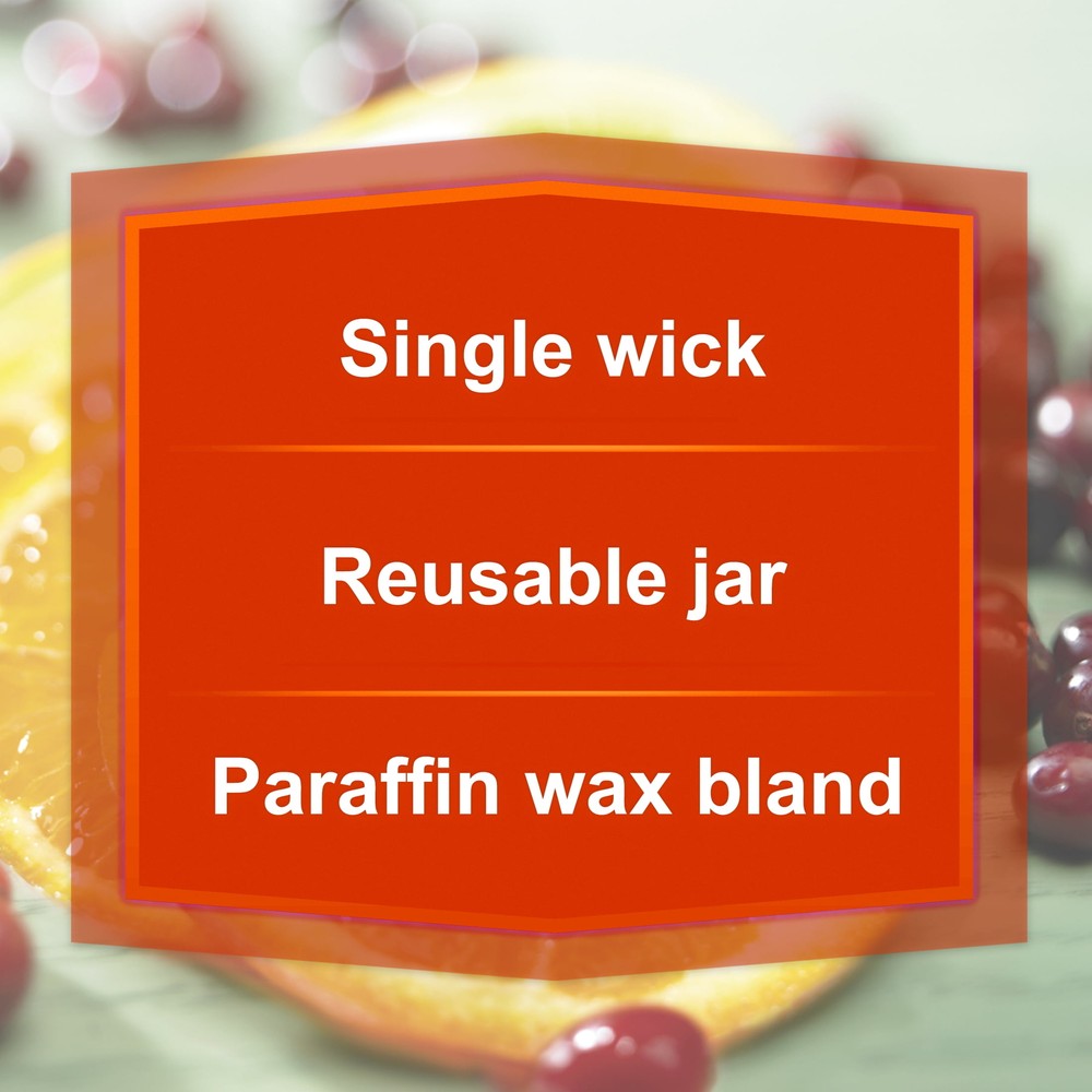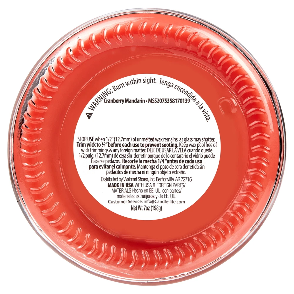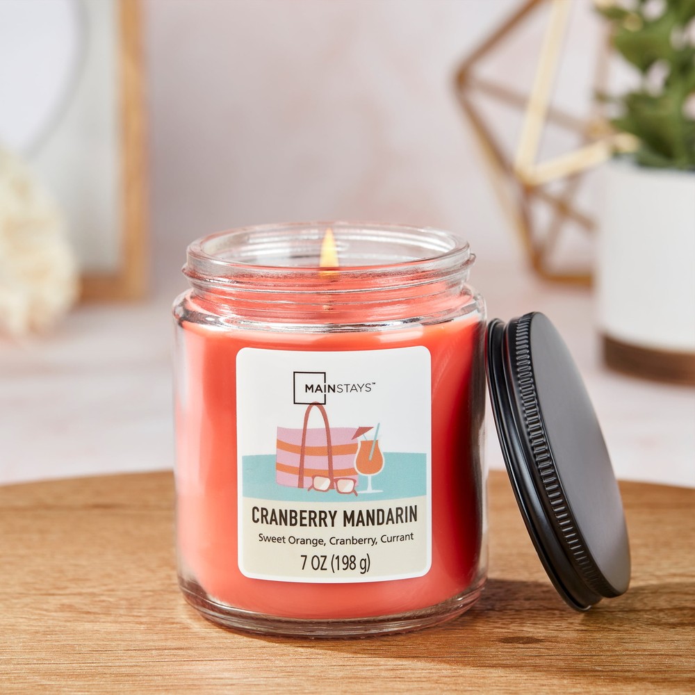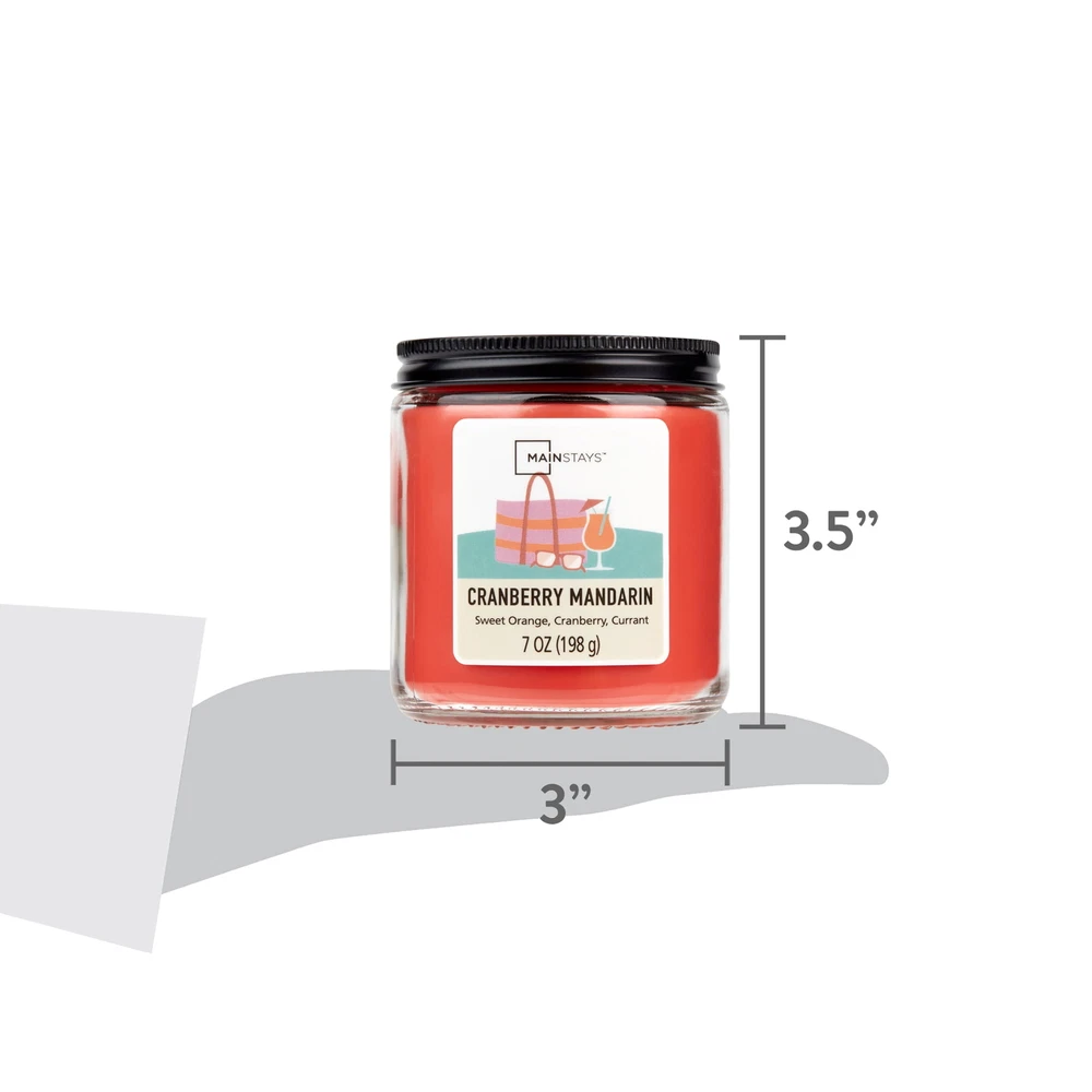 Product details Introduce a soothing aroma into your living space with the Mainstays Cranberry Mandarin Scented Single-Wick Twist Jar Candle. Mainstays scented candles are highly fragranced and provide a clean and even burn that will fill your home with beautiful and enticing seasonal aromas. Place this candle in the kitchen, living room or dining room where you can enjoy it when entertaining guests or anytime you want to relax. Trim the wick periodically to promote even burning. Mainstays offers a wide selection of candle scents to explore and enjoy. Shop all of our Mainstays scents online and in-store. Treat yourself to the enticing scent of the Mainstays Cranberry Mandarin Scented Single-Wick Twist Jar Candle. Mainstays Cranberry Mandarin Scented Single-Wick Twist Jar Candle, 7 oz Cranberry Mandarin features fragrance notes of sweet orange, cranberry, and currant The single-wick design provides just the right amount of illumination in a sleek and modern design with a black screw top lid The scent of this candle allows for a relaxing environment without becoming overpowering Size: 2.9 in x 3.5 in Mainstays Cranberry Mandarin Scented Single-Wick Twist Jar Candle, 7 oz Cranberry Mandarin features fragrance notes of sweet orange, cranberry, and currant The single-wick design provides just the right amount of illumination in a sleek and modern design with a black screw top lid The scent of this candle allows for a relaxing environment without becoming overpowering Size: 2.9 in x 3.5 in Mainstays Cranberry Mandarin Scented Single-Wick Twist Jar Candle, 7 oz Cranberry Mandarin features fragrance notes of sweet orange, cranberry, and currant The single-wick design provides just the right amount of illumination in a sleek and modern design with a black screw top lid The scent of this candle allows for a relaxing environment without becoming overpowering Helps improve concentration, mood, and positive thinking Size: 2.9 in x 3.5 in Mainstays Cranberry Mandarin Scented Single-Wick Twist Jar Candle, 7 oz Cranberry Mandarin features fragrance notes of sweet orange, cranberry, and currant The single-wick design provides just the right amount of illumination in a sleek and modern design with a black screw top lid The scent of this candle allows for a relaxing environment without becoming overpowering Helps improve concentration, mood, and positive thinking