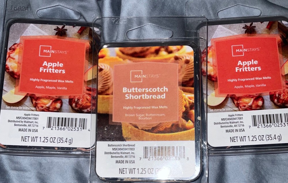 1W New in package 1.25 oz each pack 6 cubes each package 3 Total Packages Two Pkgs Scent - APPLE FRITTERS One pack of BUTTERSCOTCH SHORTBREAD by Mainstays...