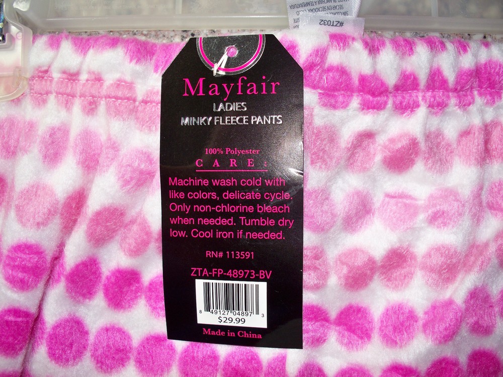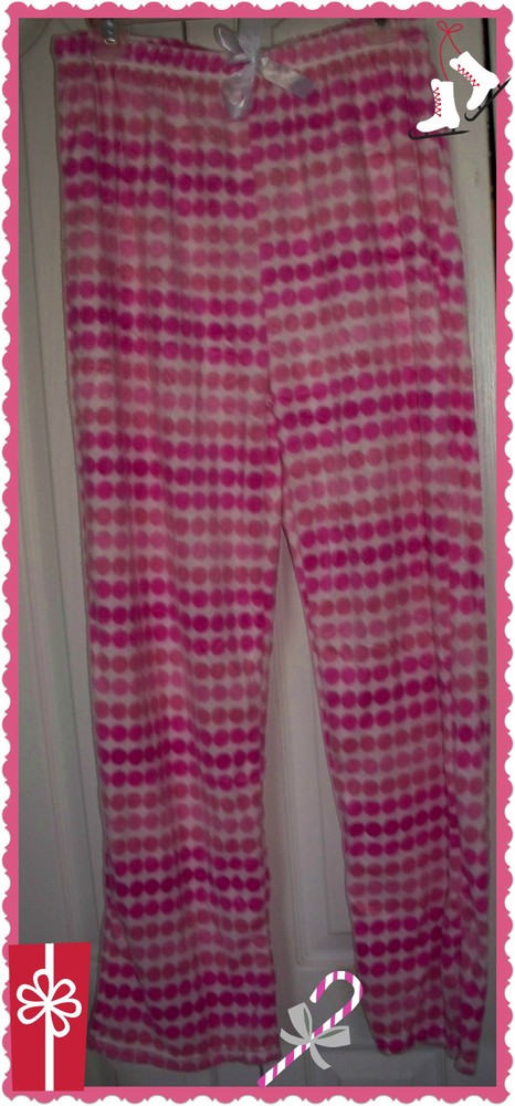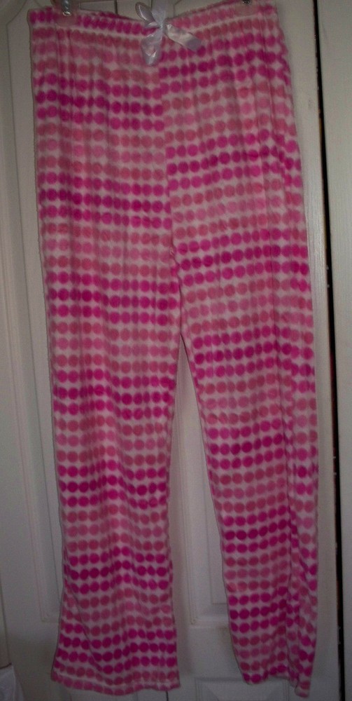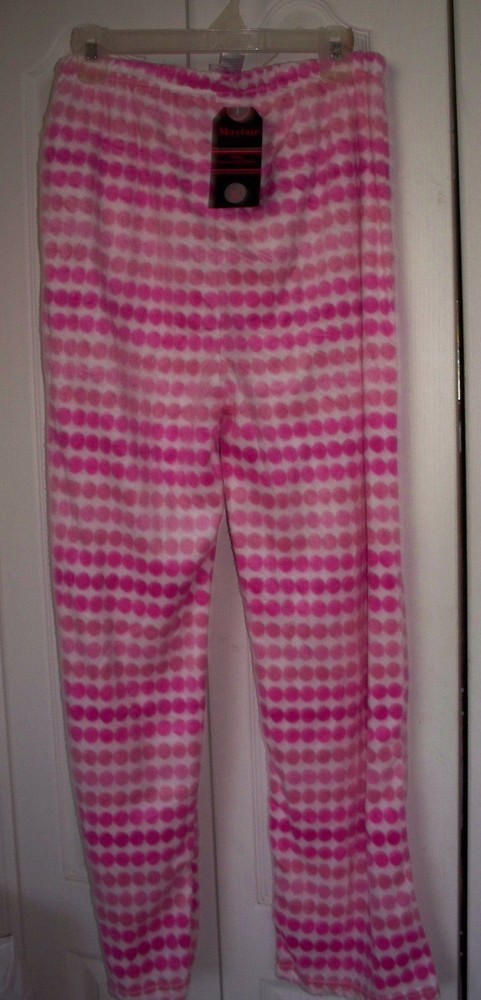 $30 Large L Soft Womens Pink Polka Dot MAYFAIR Cozy Comfort Minky Fleece Pants New with Tags. Mayfair 1-piece Pull on pants - Pink with White Print Soft and plush. The size is marked Large. - ONLY ONE AVAILABLE. Mayfair. 100% polyester. Machine wash Tumble Dry . See photographs for details of item for sale. Will receive exactly what in pictures. Shipping includes tacking information. Email questions MAYFAIR Pink Dot Fleece Pant Cabinet-423-1