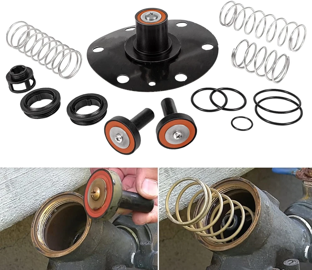 Scope of application: This Repair set fits for model 3/4 Inch to 1 Inch 975XL and 975XL2 reduced pressure principle backflow preventers. Set combination: Repair Kit components include two Check Seat O-Rings, two Check Seats, two Retaining Bolts, two Seal Ring Retainers, two Seal Rings, two Poppets, one #1 Check Spring, two Cover O-Rings, one #2 Check Spring, one Relief Valve Stem O-Ring, one Relief Valve Seat O-Ring, one Relief Valve Seat, one Spring, one Retaining Bolt, one Seal Ring Retainer, one Seal Ring, one Lower Plunger, one Diaphragm, and one Upper Plunger,and one Waterproof tape. Material: made of materials with excellent performance and longer service life, it has strong durability, corrosion resistance and rust resistance. High quality materials make it long-term use.