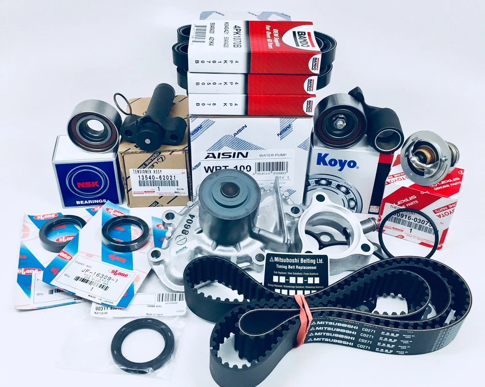 NEW! Toyota 3.4L/V6 Timing Belt Kit Complete 14 piece timing kit. Everything you need to properly service your timing belt. Includes select matched parts from OE/OEM manufacturers. These are the same parts used and trusted by Toyota, Lexus and Technicians world-wide. Meets or exceeds Toyota original equipment specifications. ATTN. BUYERS: AISIN has an agreement with TOYOTA/LEXUS to grind off the TOYOTA logo on their pumps that are sold to suppliers not affiliated with Toyota or Lexus. These are the exact same pumps that are sold at dealership parts departments, but merely have this cosmetic change. Feel free to contact Aisin directly to confirm this fact. --- This kit fits these vehicles WITH an oil cooler --- 1996-2002 Toyota 4Runner 1994-1998 Toyota T100 1995-2004 Toyota Tacoma 2000-2004 Toyota Tundra All Models with 3.4 Liter / V6 / 5VZFE Includes The Following Brand New Parts and CRANK BOLT (#90119-16006): Quantity Part Manufacturer Part Number 1 Timing Belt Mitsuboshi CD271M or TB271M 1 Idler Roller NSK 13503-62040 1 Tensioner Roller Koyo 13505-62070 1 Front Crankshaft Seal TOYOTA 90311-40022 2 Front Camshaft Seals Stone/NOK 90311-38051/JF163091 1 Water Pump WPT-100 Aisin 16100-69398-83 1 Water Pump Gasket Aisin Included 1 Hydraulic Tensioner Toyota 13540-62021 1 Thermostat (82°c) Toyota 90916-03075 1 Thermostat Gasket Aisin 16325-62010 1 Air Conditioning Belt Bando 4PK-0870 1 Alternator Belt Bando 4PK-1050 1 Power Steering Belt Bando 4PK-1070 Parts Are In-Stock and Ship Within 1 Business Day. Shipping to United States (50 States, PO Box, PR) and Canada Only toyo34+tb+kit+aisin
