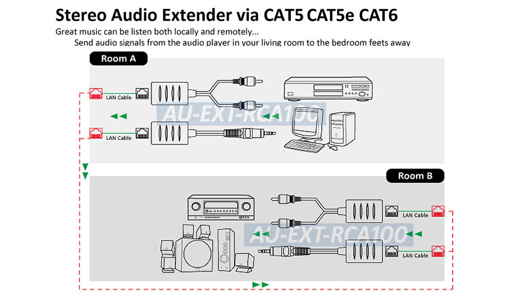 Stereo RCA Audio Balun Extender Over Cat5 Cat5E Cat6 Cable Stereo 3.5mm Audio Balun Extender Over Cat5 Cat5E Cat6 Cable This stereo audio over Ethernet cable kit allows you to send stereo L/R channel or mono sound up to 250 feet or 75 meters using a low-cost Cat5/Cat5e/Cat-6 twisted pair Ethernet cable. This stereo audio extender kit is used in pair. Each pack consists of one transmitter and one receiver plus the RCA to 3.5mm adapter cables. It allows users to connect from a stereo or mono audio source to speaker, audio receiver, stereo amplifier at distance through using Ethernet network cable. [Note]: the Ethernet cable used in the setup can not be mixed with networking equipments together. It needs dedicated Ethernet cable for point-to-point hookup. Perfect and cost-effective solution for extending audio signal for longer distance transmission and for a nice and neat setup , which is a must for all professional installers. This audio balun/extender fits with various applications such as: Public audio/audio broadcasting such as air ports, train stations, retail stores Information kiosks or administrative consoles for control rooms and multimedia centers Tradeshows, hospitals, auditorium and command rooms Classrooms, training center and conference room Live stage events Easy Setup The installation of this audio extender kit is super easy. It is all just plug and play by connecting Cat5, Cat5e or Cat6 cable between transmitter and receiver unit No setting or configuration needed and no external power supply needed. Long Range Audio Transmission This stereo audio extender can transmit standard analog audio signal for over 250-feet(75m) cable run while maintaining audio integrity with the same clear and sharp sonic quality outputs all the way. No signal loss, no noise and no signal degrading quality after the long cable run. Low-Cost Cable Solution Cat5/Cat6 twisted pair cables are widely popular, resulting in lower cost due to the mass production. These types of cables are also easily to be customized at various length as needed, eliminates logistics problems of having custom length of audio cables made in advance. Comprehensive Audio Hookup Support This audio extender kit supports both RCA to RCA hookup and RCA to 3.5mm stereo mini hookups. Maximum Flexibility CAT-5 and CAT-6 twisted pair cables are more flexible than regular coax and RCA cables. They are easier to hide away in offices, buildings and behind walls for ultimate flexibility. Nice and neat setup is also a must for all professional installers. Perfect and cost-effective audio signal extension solution for transmitting composite audio signal and power over long distance using low-cost CAT-5, CAT-5e or CAT-6 network cable. Ethernet cables are easier to install and more flexible than other audio cables. Maximum signal transmission distance up to 250 feet or 75m . Twisted pair network cabling provides added protection against outside interference and increases overall signal transmission distances. Audio sonic quality will be retained all the way the same as the original audio input. No signal loss and no degradation after the long cable run . Supports both RCA to RCA hookup and RCA to 3.5mm stereo mini hookups. Passive circuitry with self bus-powered so no external power supply needed for the operation in both transmitter unit and receiver unit. Fully plug and play. Supports both stereo and mono audio. Audio Input Connector: RCA male x 2 Or 3.5mm male x 1 via using the adapter cable included for L/R channel Audio Out Connector: RCA male x 2 Or 3.5mm male x 1 via using the adapter cable included for L/R channel RJ45 Connector: 2 ( 1 for transmitter and 1 for receiver unit) Max Transmission Distance: 250 feet Bandwidth: 10 Hz to 50 kHz +/-3 dB Operating Temperature: -10C ~ +50C Environment Humidity: 0 ~ 95% Wire Type: Category 5, 5e, or 6 of twisted pair type Operating Temperature: -10°C to 70°C Dimension: 0.5"(L)x0.5"(W) x1"(D) Stereo audio transmitter + receiver 2 of RCA L/R female to 3.5mm audio adapter cable