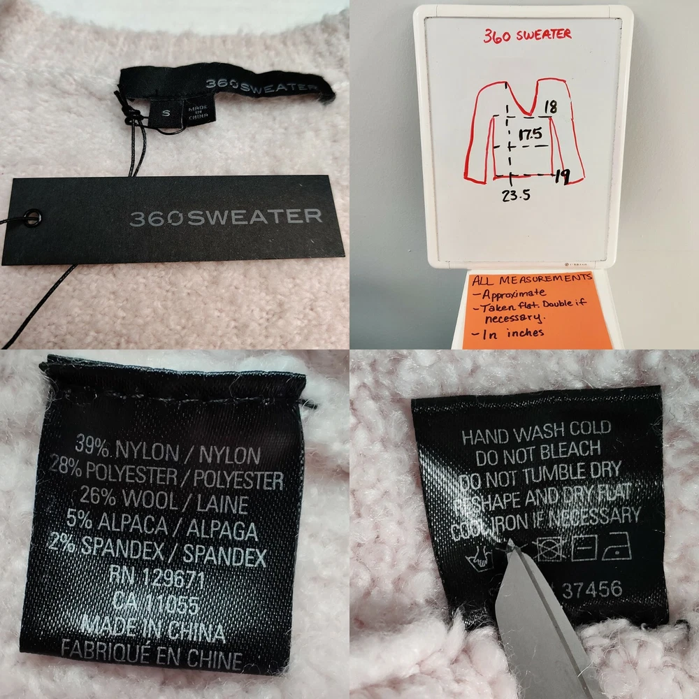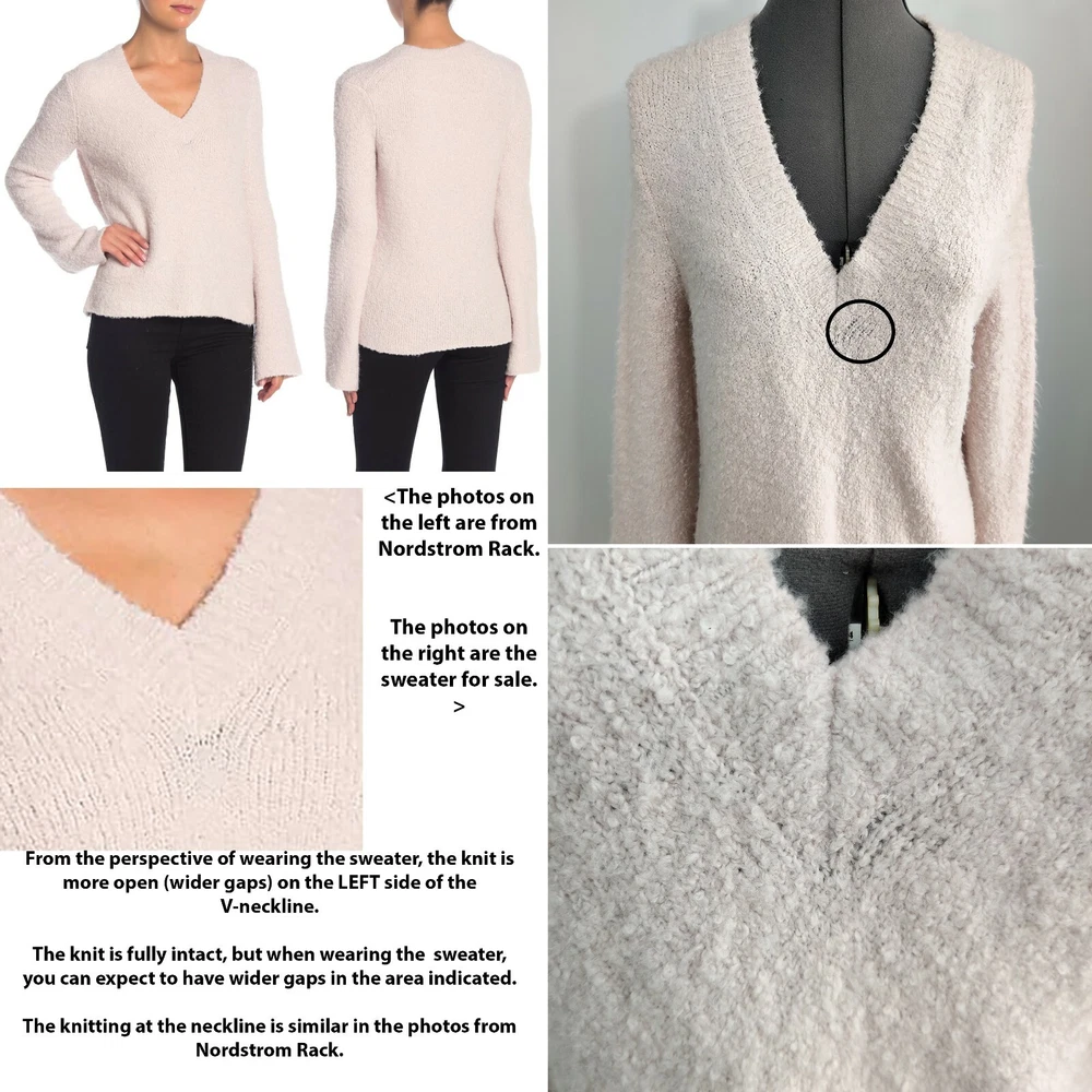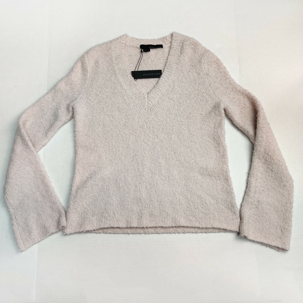 360 Sweater MSRP $288 -V-neck -Long slightly flared sleeves -39% nylon/28% polyester/26% wool/5% alpaca/2% spandex Super soft & squishy, oh-so-cozy, marshmallow-y, cloud-like dream of a sweater! Color: Quartz, an off-white cream color with a subtle hint of pink. The color has an overall beige appearance. As always, please allow for slight color variation. Small Condition: New with tags. Note slightly larger gaps in knit to left of V-neckline as shown/described. This seems to be simply how it was made as the provided stock photos look similar. However, I am listing it as new with defects to account for this. -About Us- You've bought things on eBay, but have you bought things on eBay . . . from a cat? My name is Salem, and my mom Emily helps me sell my wares on eBay. We have been selling since May 2017. Mom packs your items with care, and we ship within one business day. We are a smoke-free but cat-friendly household. Interested in more than one item? I'm happy to give you my best price. Just send me a message. Thank you for visiting our store! Other info: Please remember to view all photos. We typically post several. Unless otherwise noted, all photos are taken by us and are of the item you will receive. However, any props/décor seen in photos do not come with the item. We provide measurements for all clothing items. In most cases, measurements are taken with the garment flat and are not doubled. All measurements are approximate and taken with the garment unstretched. If the measurements are missing or if you would like a measurement we have not taken, we would be happy to help in providing this information. Please use these measurements, and compare them to your own similar clothing to best estimate fit. If you have any other questions regarding the description of an item, please do not hesitate to send us a message. Thank you in advance for your business! -- soft cozy squishy marshmallow dreamy cloud-like woolen wool blend v-neck cream sweater