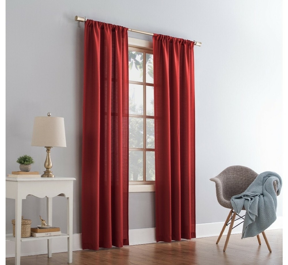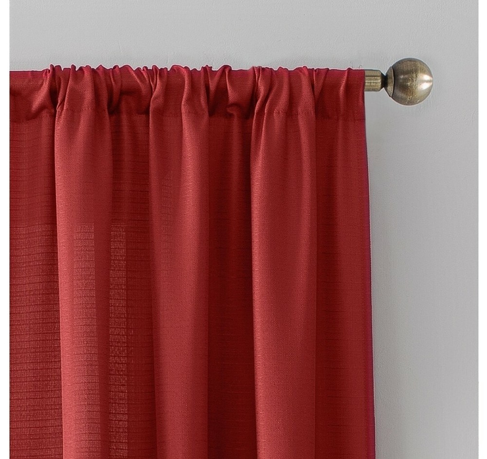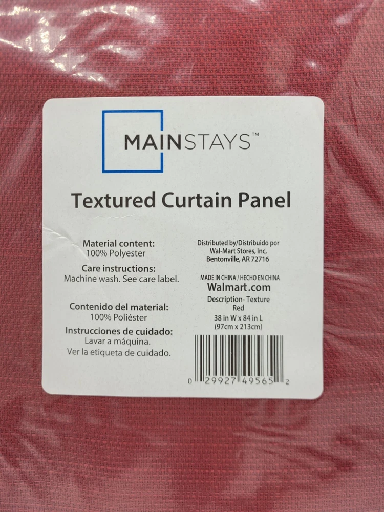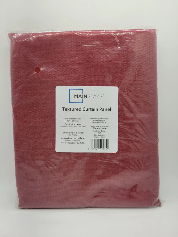 Color: Red Number of Panels in Packaging: 1 Dimensions (Overall): 84 in L x 38 in W Accommodates Pole Size: 1.5 inches Indoor/Outdoor: Indoor Required, Not Included: Rod Hanging Style: Rod Pocket The Mainstays Textured Solid Curtain Panel is the perfect update for any room! It features an all-over slub texture for a relaxed and casual look. Hang on its own or layer with the Mainstays Textured Prints and Solid Valance for a fully coordinated look. Valance and curtain panels sold separately. Dress up your window with the Mainstays Textured Curtain Panel Layer with the coordinating valance or the Mainstays Textured Solid Curtain panel for a fully coordinated window Includes 1 single rod pocket curtain panel made from machine washable material 100 percent polyester Rod pocket fits a standard curtain rod up to 1.5" for easy hanging Curtain rod not included. Double rod may be needed for layering. Curtain rod not included. Double rod may be needed for layering.