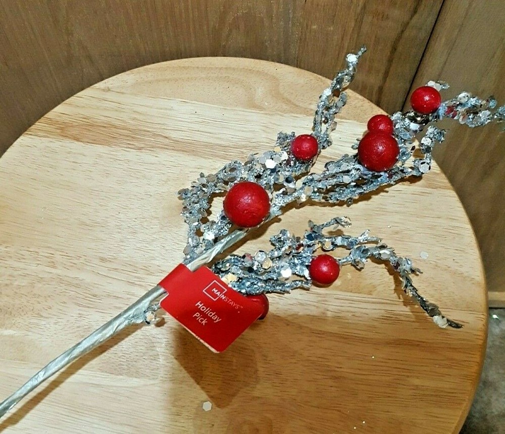 Product Information Artificial 14" L (including pick) Each leaf is approx. 8" There are 3 branches Features silver sequin & artificial cherries...