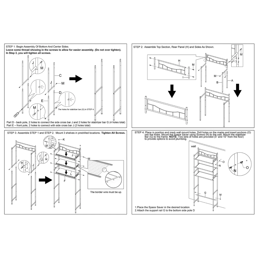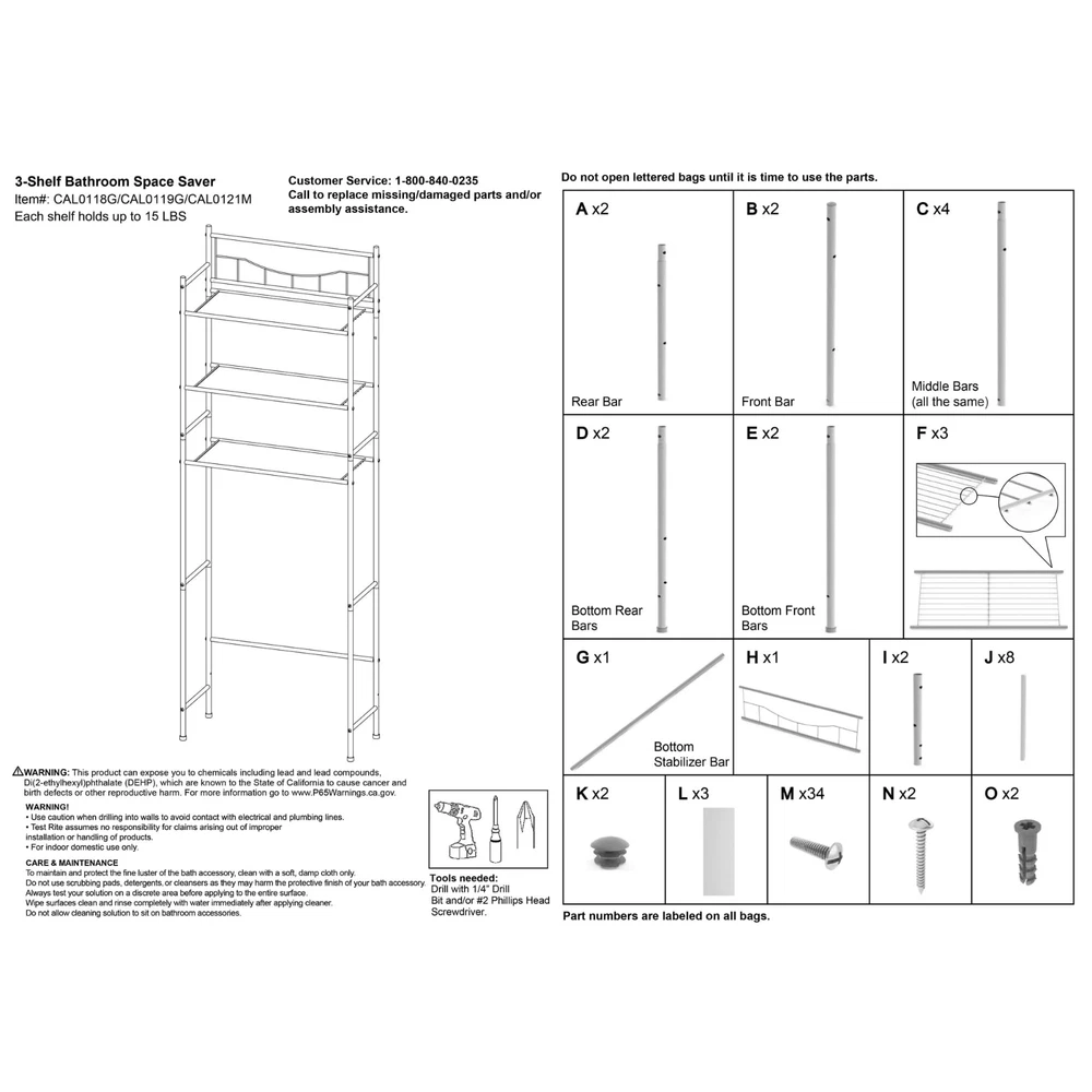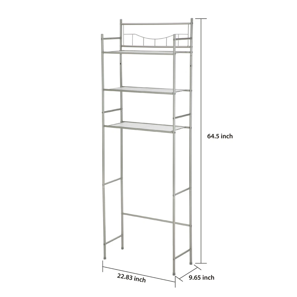 Make the most of your bathroom space with the Over-the-Toilet 3-Shelf Bathroom Space Saver. It has a sleek satin nickel finish and a modern design. It adds three storage shelves to help keep your bathroom clutter free. The slim design fits over most standard toilets, while the satin nickel finish adds a touch of style to your space. Each of the three Steel shelves can hold up to 10 pounds The package includes a detailed instruction manual. It has numbered parts and assembly steps. All necessary hardware is also included for easy assembly by adults. This Over-the-Toilet Space Saver is a smart way to maximize your space in a bathroom. Recommended for Senior, Adult and Teen Age Groups. Dimensions: 22.83"L x 9.65"W x 64.5"H Bathroom space saver with 3 shelves Fits over most standard toilets Holds up to 10 lbs. per shelf Ideal for adding additional storage and contemporary design to your bathroom Bottom shelf is 36.96" from the floor Stabilizer bar is 10.59" from the floor Distance between each shelf is 9" Satin Nickel finish (Silver color) Assembly required Hardware included Also available in an Oil Rubbed Bronze finish For questions or issues with this item, call 800-840-0235 before returning.