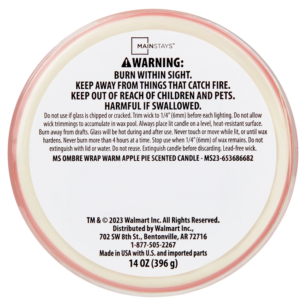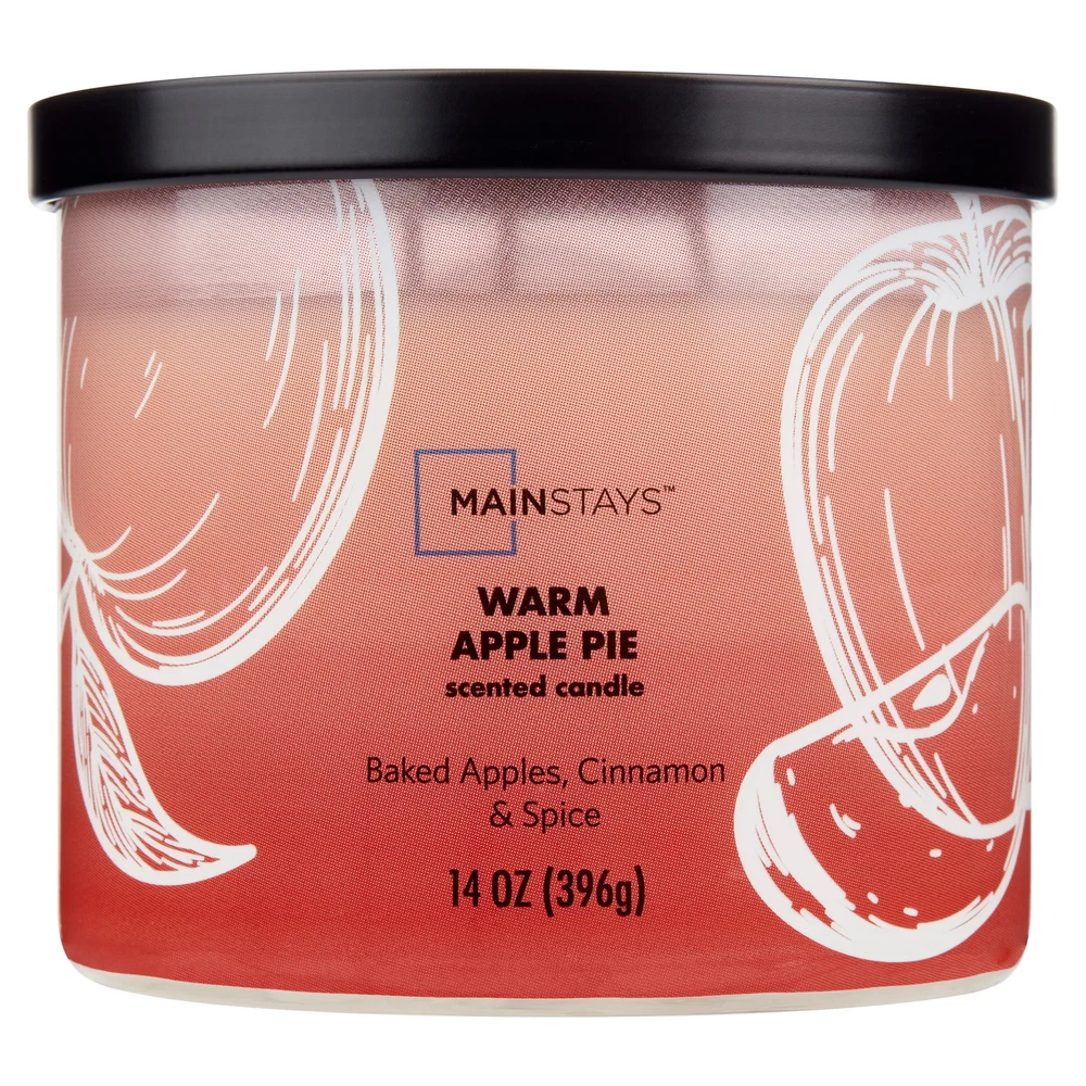 Warm Apple Pie - This scented 3-wick wrapped candle from Mainstays is a highly fragranced candle that is poured with a premium wax blend that allows for a smooth, consistent burn. These Mainstays scented candles are packaged in a decorative glass jar with metal lid in a variety of fragrances and designs that will go well with all your current home decor. The candles have a lead-free wick and are poured in the USA. Follow these tips for the perfect burn: Always trim wick to ¼ inch before lighting and keep debris out of wax pool Do not burn more than 3 hours at one use, and allow wax to harden before relighting, touching or moving. Set candle on a heat-resistant surface and keep out of drafts. Always burn within sight and extinguish before leaving room. Do not burn near things that can catch fire, and keep away from children and pets. Do not extinguish with water. No assembly required Perfect for any room in your home Recyclable vessel Great for gift giving or keep for yourself