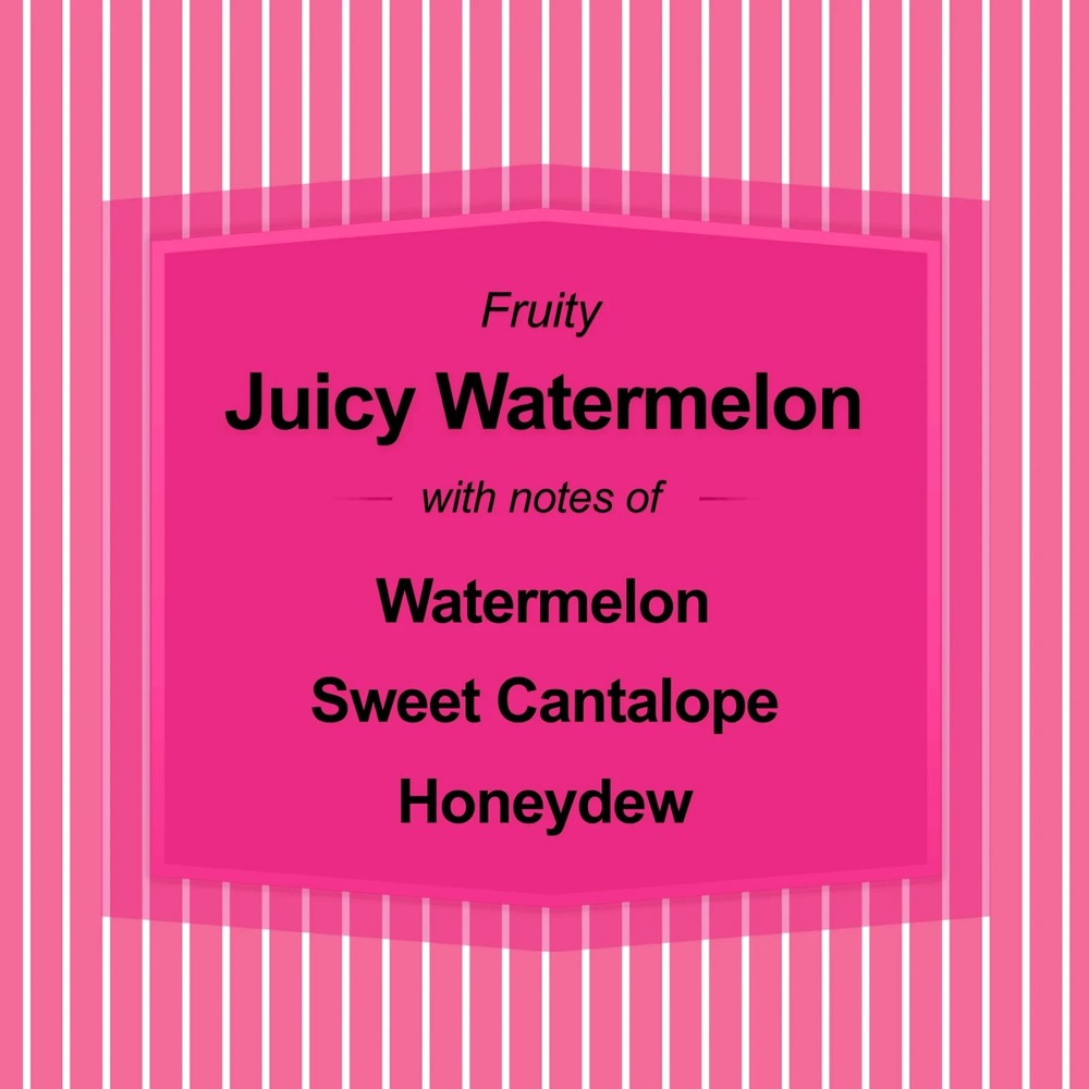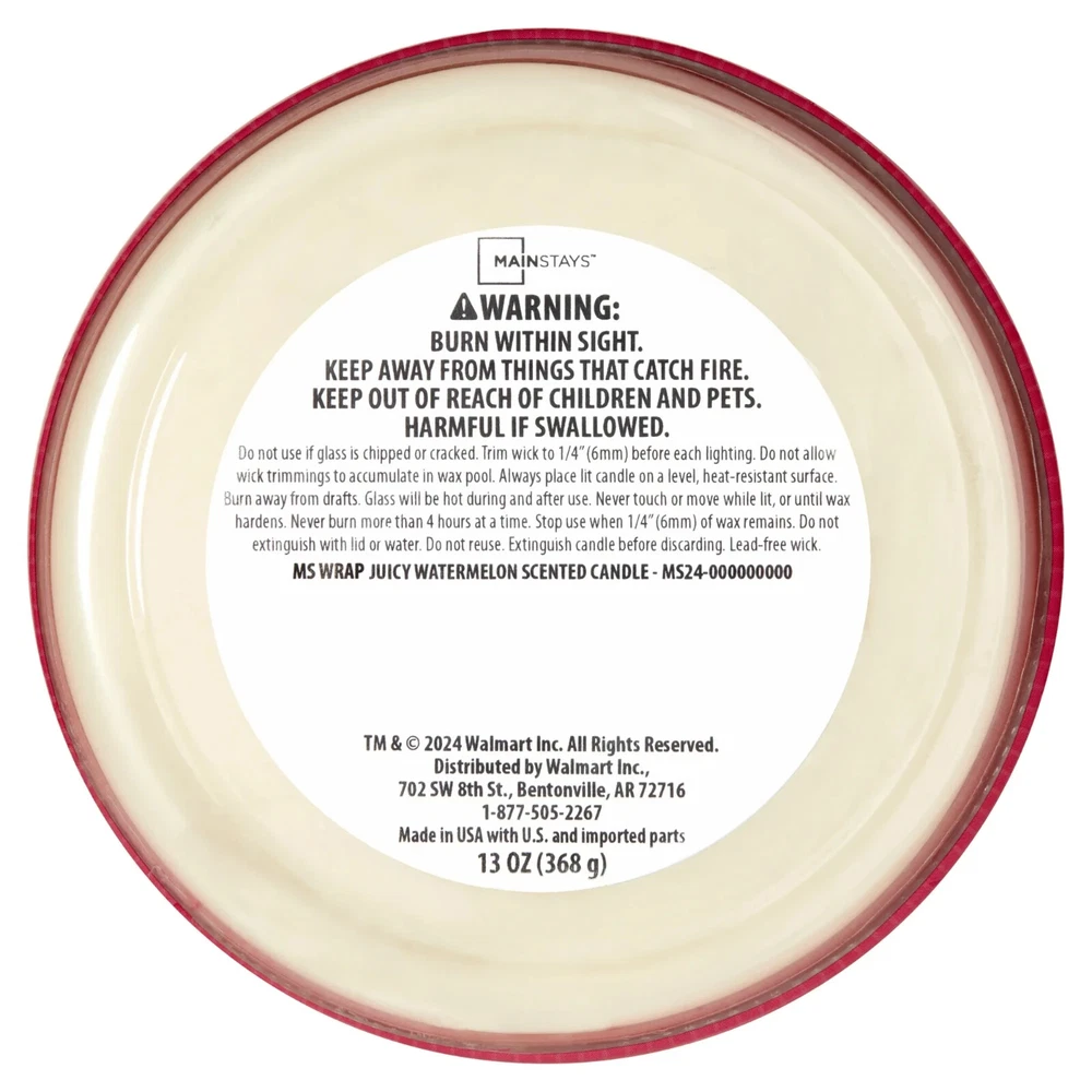 Mainstays 3-Wick Textured Wrapped Juicy Watermelon Scented Candle, 14 oz About this item: Mainstays 3-Wick Textured Wrapped Juicy Watermelon Scented Candle, 14 oz Consistent and smooth burn 3-wick with decorative wrap and attractive metal lid Highly fragranced candle Fragrance notes of honeydew, sweet cantaloupe, and watermelon Mainstays 3-Wick Textured Wrapped Juicy Watermelon Scented Candle, 14 oz Consistent and smooth burn 3-wick with decorative wrap and attractive metal lid Highly fragranced candle Fragrance notes of honeydew, sweet cantaloupe, and watermelon Experience the lush aroma of Juicy Watermelons with this 3-wick scented candle, expertly crafted to fill your space with a fruity fragrance that's both refreshing and comforting. The vibrant red color adds a pop of brightness to any room, complementing the lush watermelon scent that promises to enliven your home. This 14-ounce candle is made with a premium paraffin blend wax designed for a long-lasting burn time of up to 65 hours. The textured wrapped design ensures an elegant presentation that fits seamlessly into any decor. Whether you're setting the mood for a spa day at home or simply want to add a touch of indulgence to your daily routine, this candle is a perfect choice.