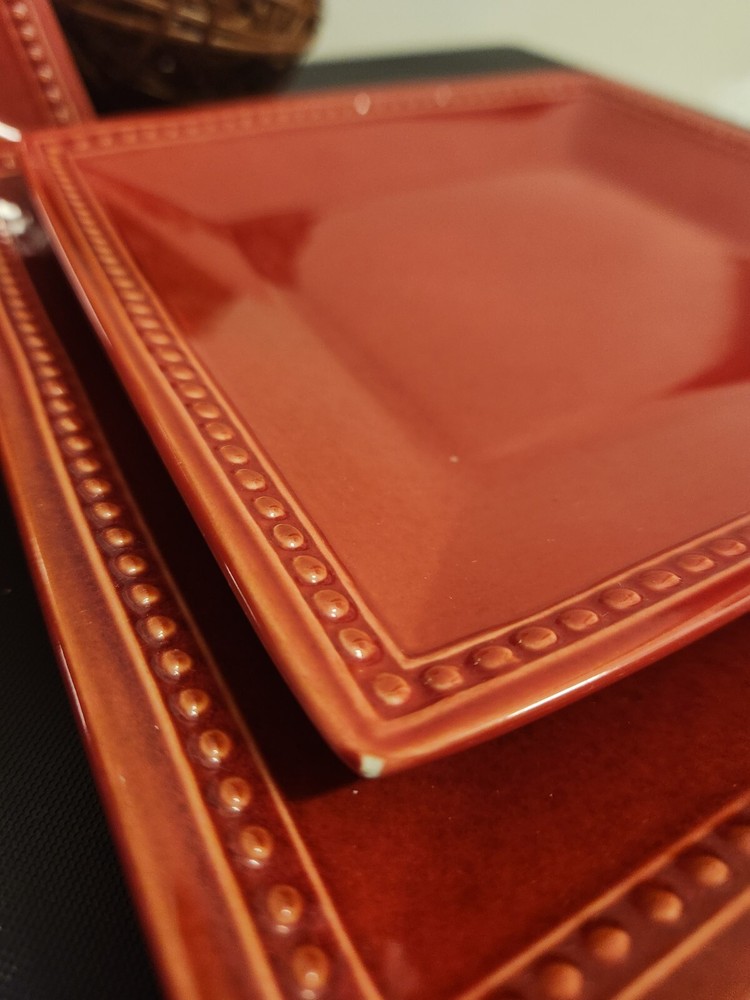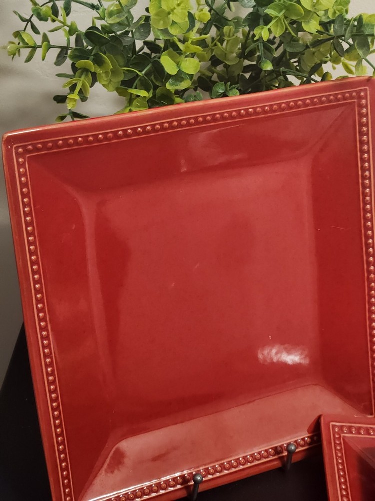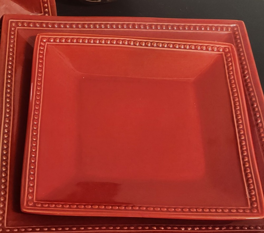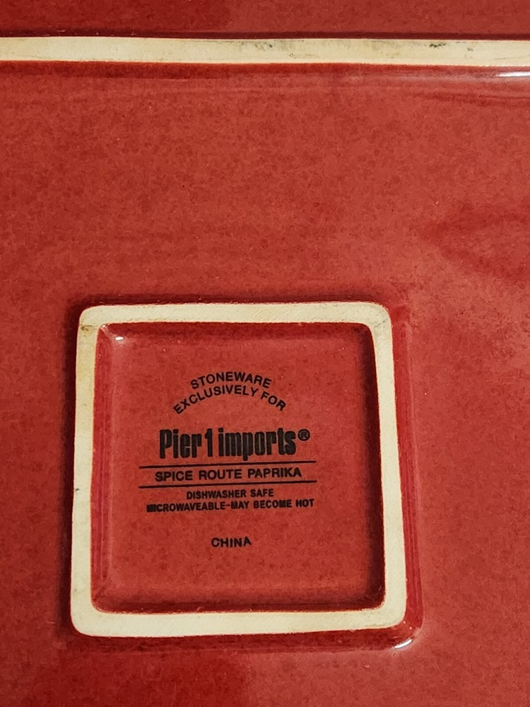 3pc Pier 1 Spice Route Paprika Beaded Square 1 Salad 8⅜", 2 Dinner 10½"Plates 1 The salad plate has a tiny chip on 1 corner. See pics. Everything else is in very good pre-owned condition. I will not separate.
