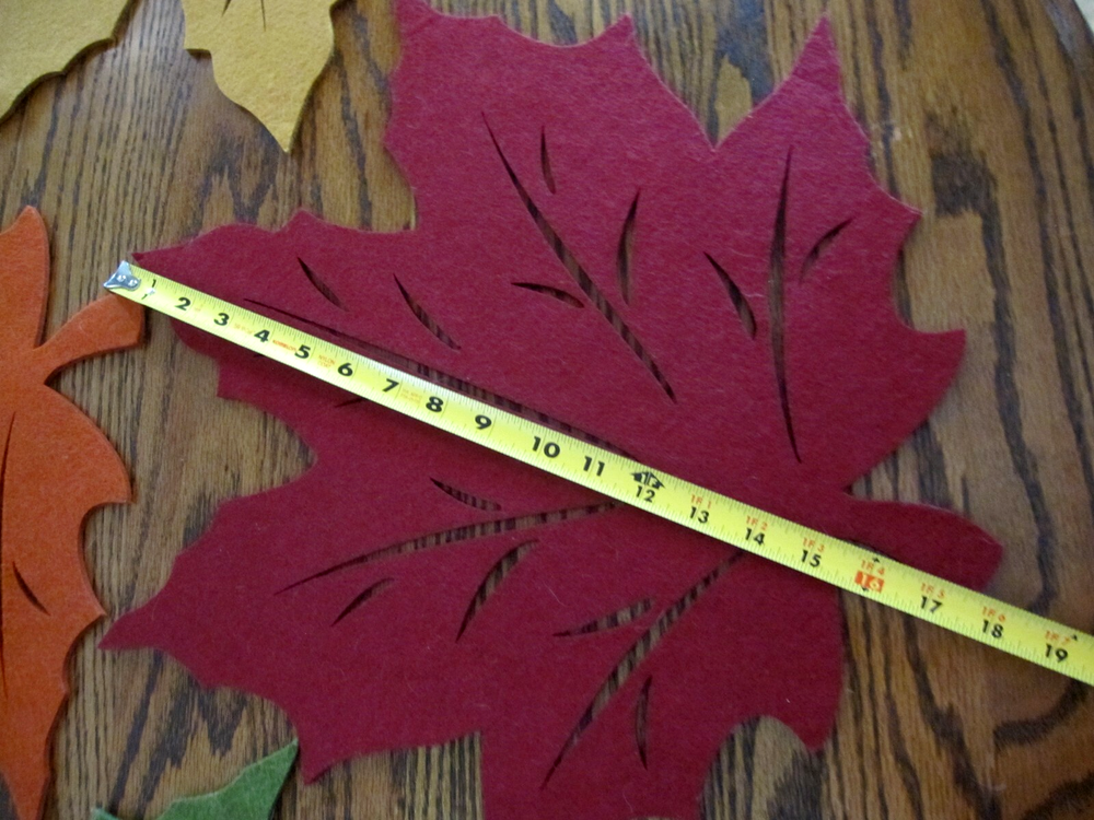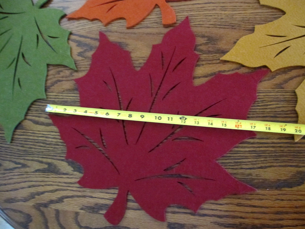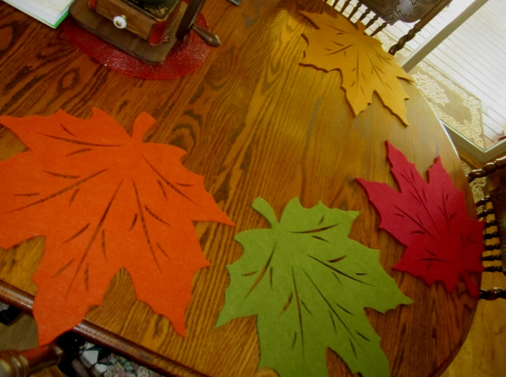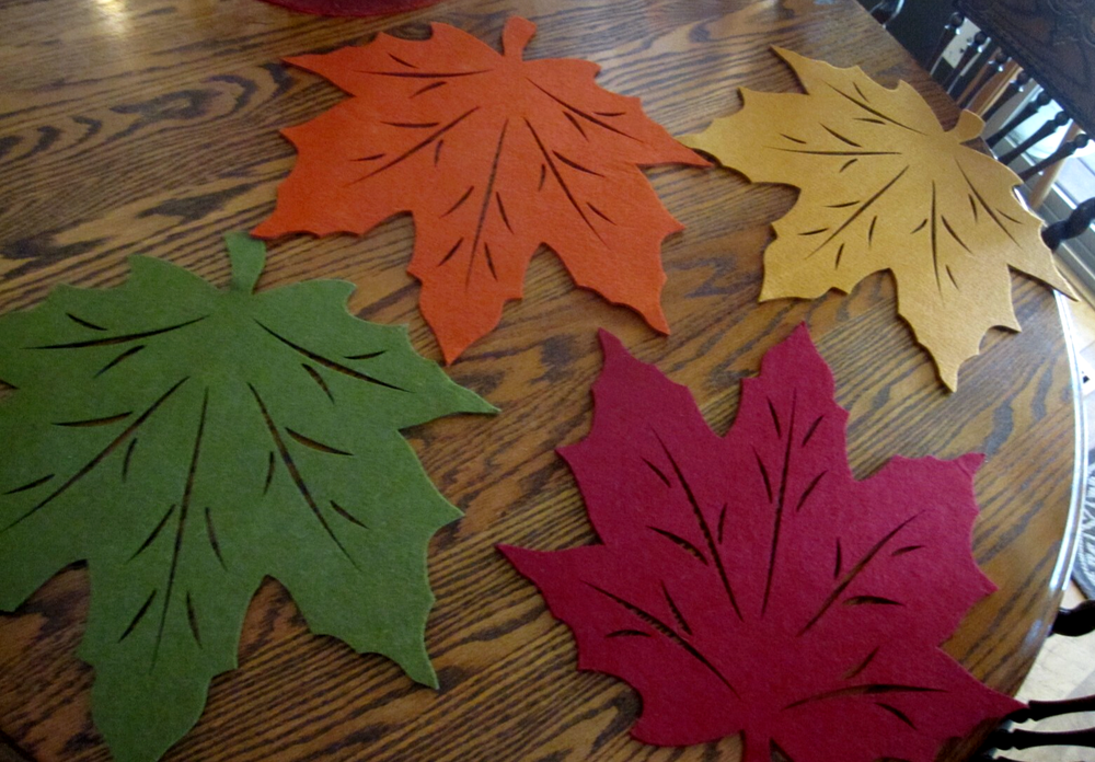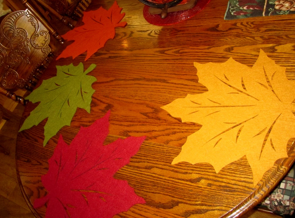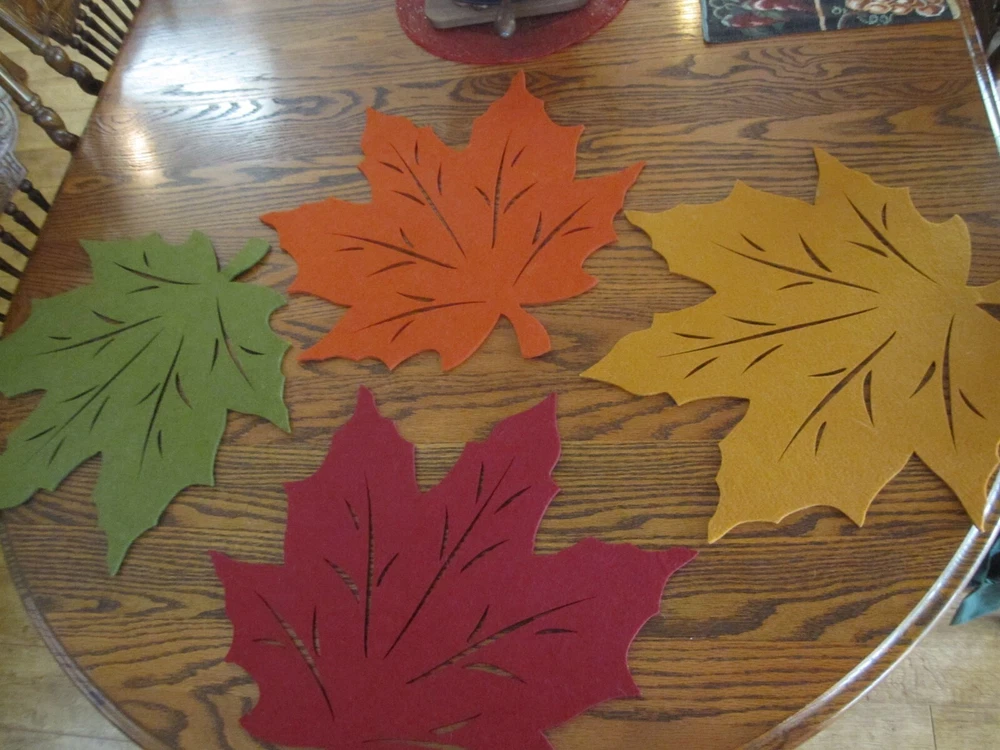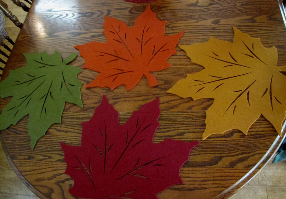 This product is a set of 4 thick felt place mats featuring autumn leaves in various colors such as yellow, burgundy, green, and orange. The mats are designed with an autumn leaf pattern and theme, making them perfect for autumn, fall, Halloween, and Thanksgiving occasions. Each placemat measures 17-1/2 inches in length and width, and they are from the brand Pier 1. These decorative mats add a touch of autumn and fall to your dining table while also providing protection for your table.