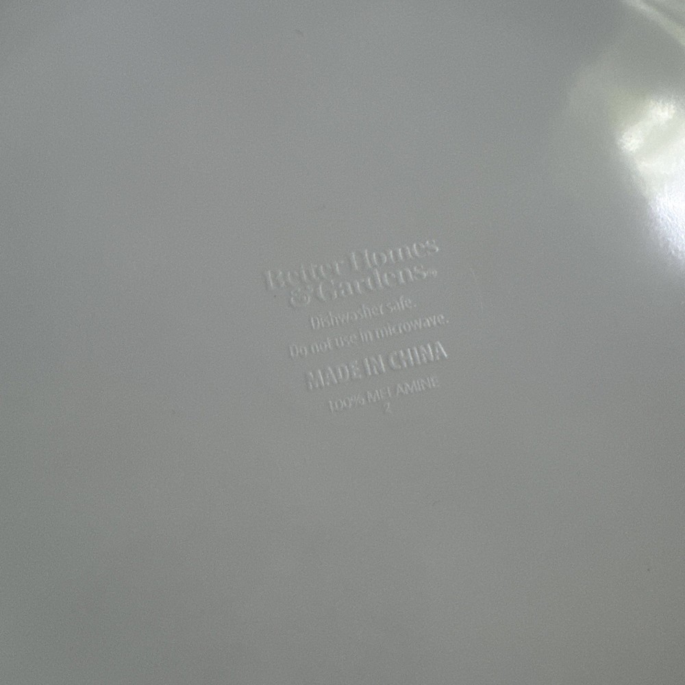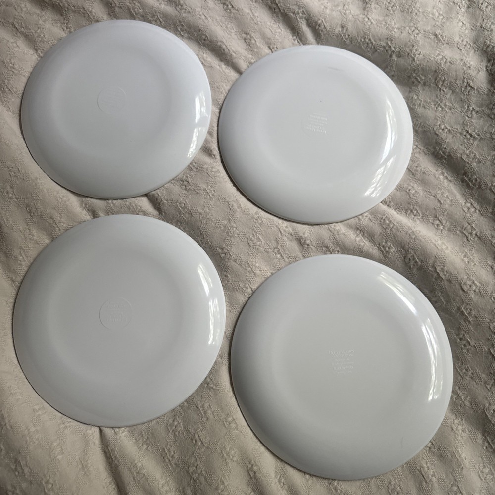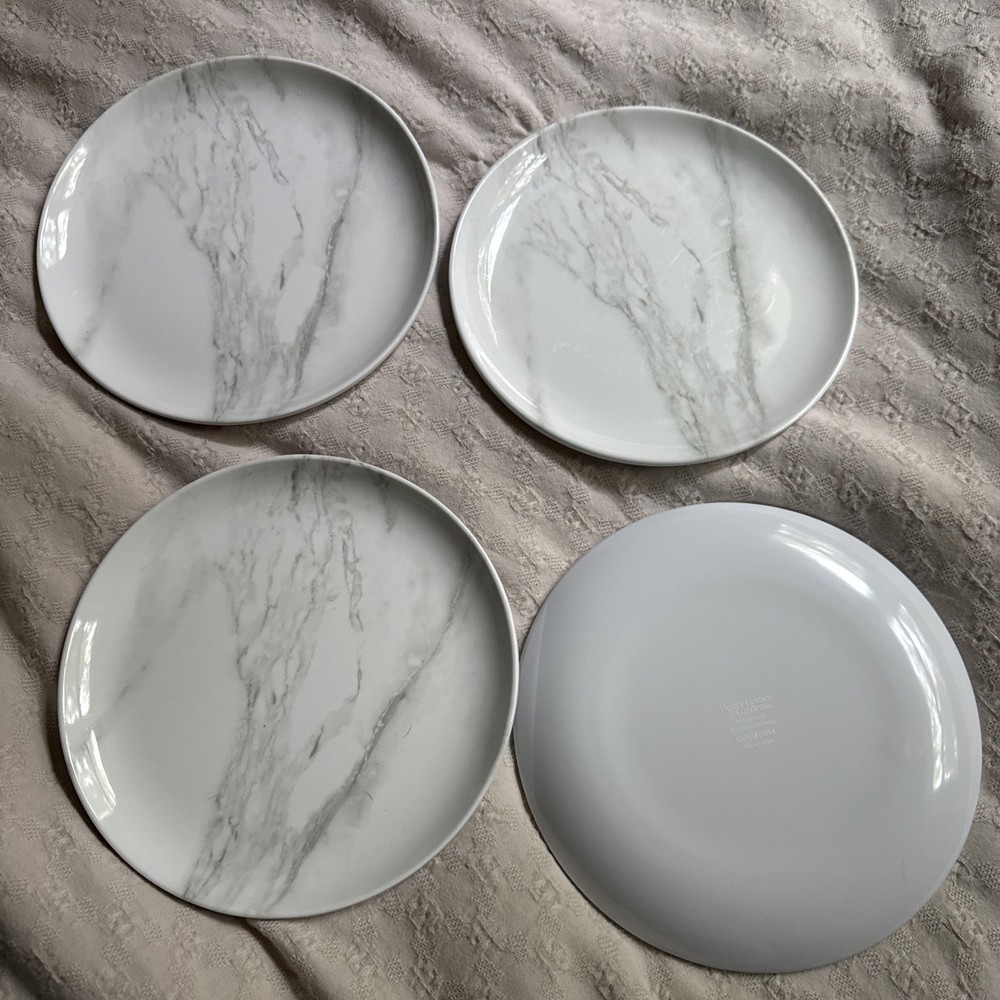 4 BETTER HOMES & GARDENS MELAMINE salad Plates White Gray Marbled about 8 1/2 inches some scratches but nothing that stands out Not microwave safe safe...