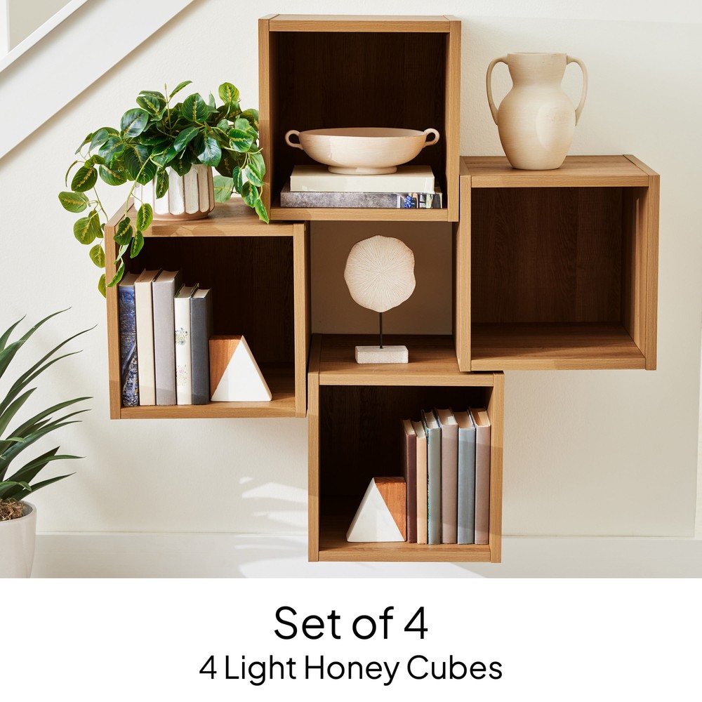 4 Cube Wall Mounted Storage Organizer Bin for Vinyl Records Albums Books Art Elevate your space with a set of four Better Homes & Gardens Modular Floating Cube Shelves. Each set includes four individual cube style shelves designed to hang on the wall. These wall-mounted shelves are a space-saving solution that help keep surfaces free of clutter by maximizing wall space. You can group them together or spread them out around your house. You can use them as subtle accents or statement pieces that add a pop of color to almost any room. Both stylish and practical, the set of four Better Homes & Gardens Modular Floating Cube Shelves are perfect for showcasing your favorite décor, organizing essentials, or creating a personalized storage solution. Set of four wall-mounted cube storage shelves with closed back panels Includes four cubes in a warm Light Honey wood grain finish Compatible with Better Homes & Gardens Cube Storage Bins (sold separately) Interior dimensions: 13" W x 15" D x 13" H Assembled dimensions (each cube): 14.69" W x 15.56" D x 14.75" H (10.34 lbs) Includes wall mounting template and hardware for attachment to multiple surfaces Each cube can support up to 20 lbs. Materials: manufactured wood Easy to assemble with included instructions (hammer & Phillips head screwdriver required) Package size: 33.39" x 7.44" x 18.11" (47.08 lbs.) Shipping/Fulfillment We offer FREE shipping to most States except for the following: California, Connecticut, District of Columbia, Massachusetts, Louisiana, Maryland, Mississippi, Tennessee, Washington, New Mexico, Illinois We use a selection of shipping services such as but not limited to: UPS, FedEx, USPS, DGM SmartMail Expedited, etc. We only ship to the lower 48 states, no APO/FPO addresses, or PO Boxes allowed. Local pickups and combined shipping options are not provided at this time. ORDER FULLFILLMENT Most items are forwarded to our supplier for processing, which will then be fulfilled through a distributor that is closest to your location. Th ese distributors may be names you recognize or sourced from smaller local operations. Return You can return a product for up to 30 days from the date you purchased it. Any product you return must be in the same condition you received it and in the original packaging. Payment We accept payment by any of the following methods: PayPal, GPay, Venmo, Visa, Mastercard, American Express, and Discover Feedback Customer satisfaction is very important to us. If you have any problem with your order, please contact us and we will do our best to make you satisfied. Contact Us If you have any queries, please contact us via eBay. We usually respond within 24 hours on weekdays. Please visit our eBay store to check out other items for sale! Thank you for shopping at our store.