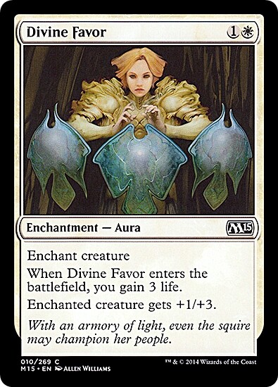 4 DIVINE FAVOR from M15 Magic 2015 Your purchase includes {4} Magic The Gathering cards as titled. Condition: Unplayed - a very nice Near Mint or Better Language : English Picture is a stock image Visit our eBay store for more information about Cyclopean Trader , current promotions, discounts, and more! USA Shipping International Shipping Payment Returns NO TRACKING There is no tracking for trading card orders under $15. These will ship in Card Savers or Toploaders in a Stamped Envelope. It's quick, cheap, and reliable but there is no status updates to check upon. PAY FOR TRACKING During checkout, you can choose to pay for First Class Package or Priority Mail. Either of these options will provide tracking. FREE TRACKING All orders that total $15 or higher ships with FREE tracking. ALL large or bulky items (books, dice, etc) ship with FREE tracking. Any order that includes over 30 trading cards will ship with FREE tracking regardless of total. Shipping rates to Canada vary as there is a $7usd difference in a flexible envelope (first class mail) vs a rigid envelope (first class package). If purchasing multiple items you can request a total which may save you a few dollars. The maximum you will pay to ship trading card singles and play sets (x4) to Canada is $10usd. This max shipping cost EXCLUDES all non-trading card items and all bulk 'lot' trading cards. Paypal is preferred within 7 days of first purchase Please contact us if you need more time as the non-payer process is automated We ship same or next business day of cleared payment to confirmed addresses. Address errors (missing apartment numbers, etc) will delay shipping. US Postal Holidays and Weekends are not business days Combined payments are greatly appreciated and required to qualify for discounts or FREE stuff. Returns are handled on a case-by-case basis as we don't accept returns on all items. Any item returned is subject to 20% restocking fee. Buyer pays return shipping cost. If we made a mistake on an order then none of the above applies.