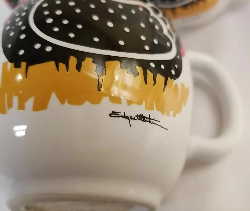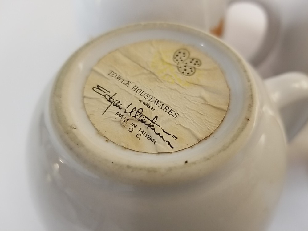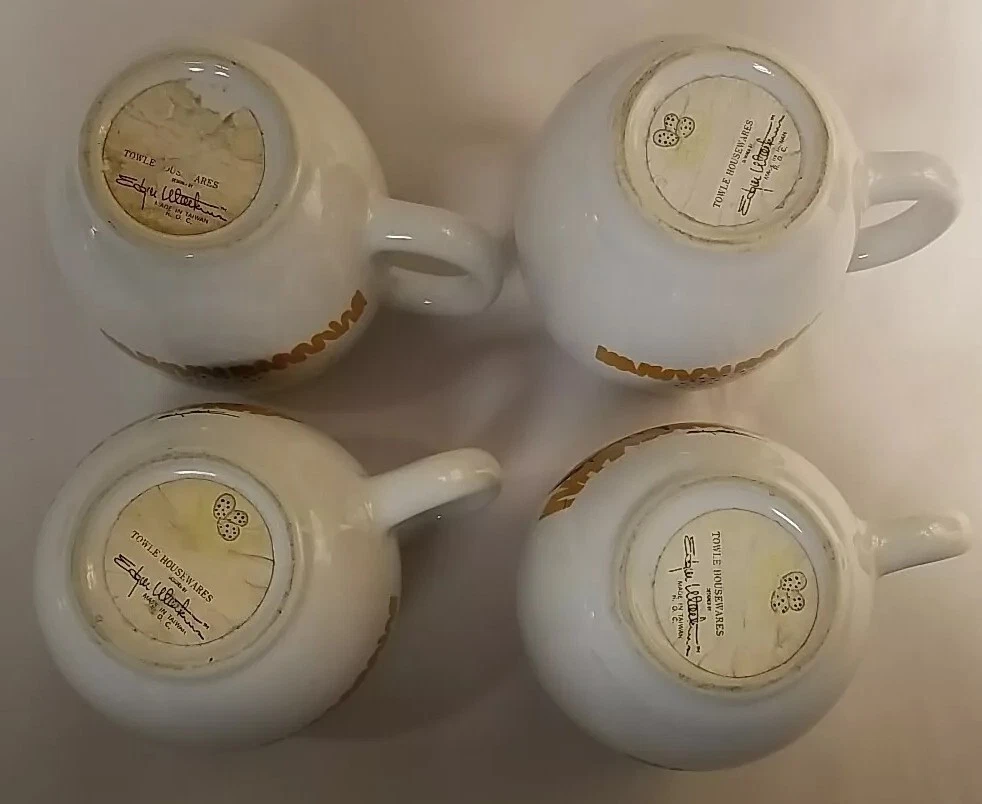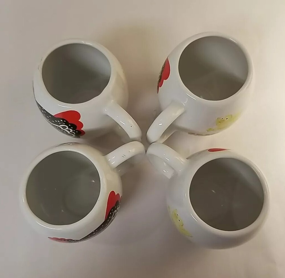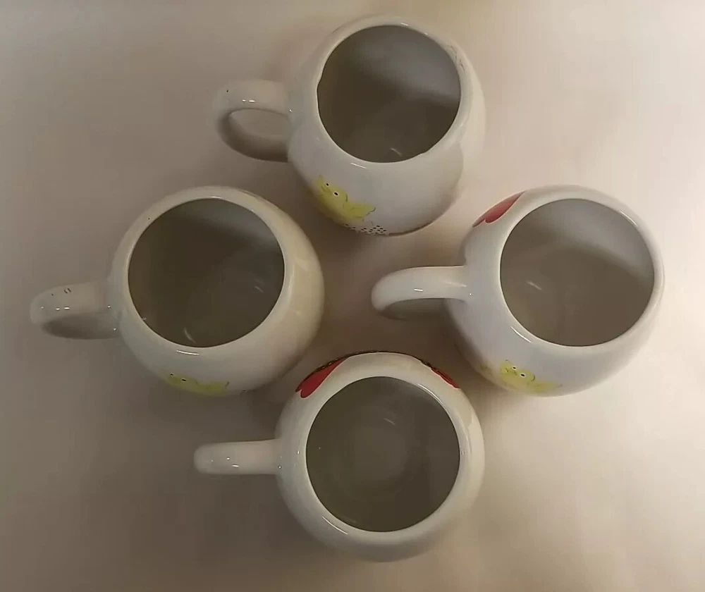 4 5/8 inches wide across the handles and 4 inches tall. Adorable and fun whimsical coffee mugs or tea cups, designed by artist Edgar Watkins. Set of four mugs show some minor scuffing and a hairline crack is visible on one cup, see photos.