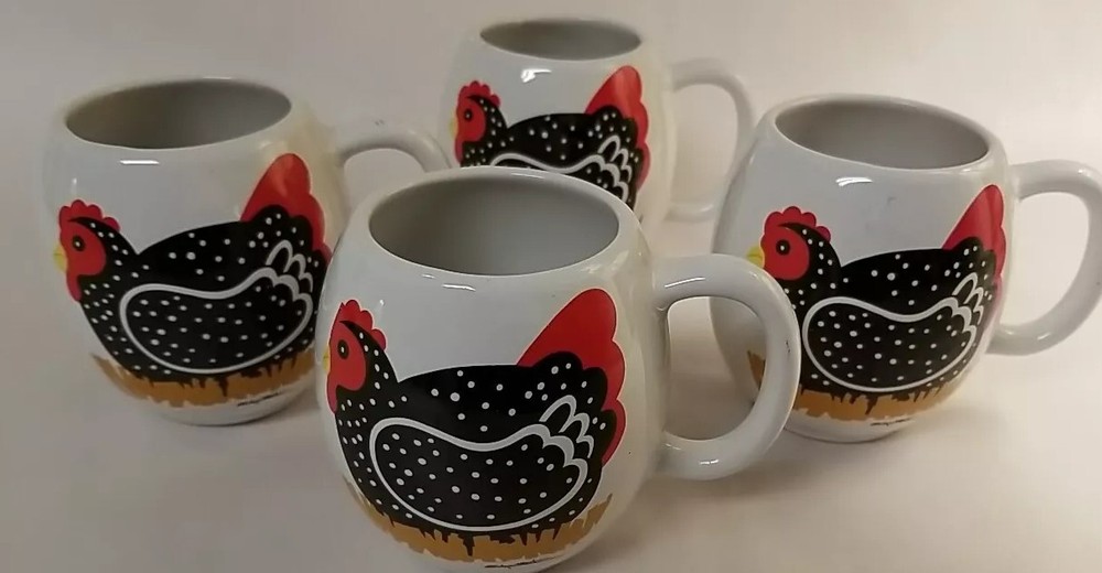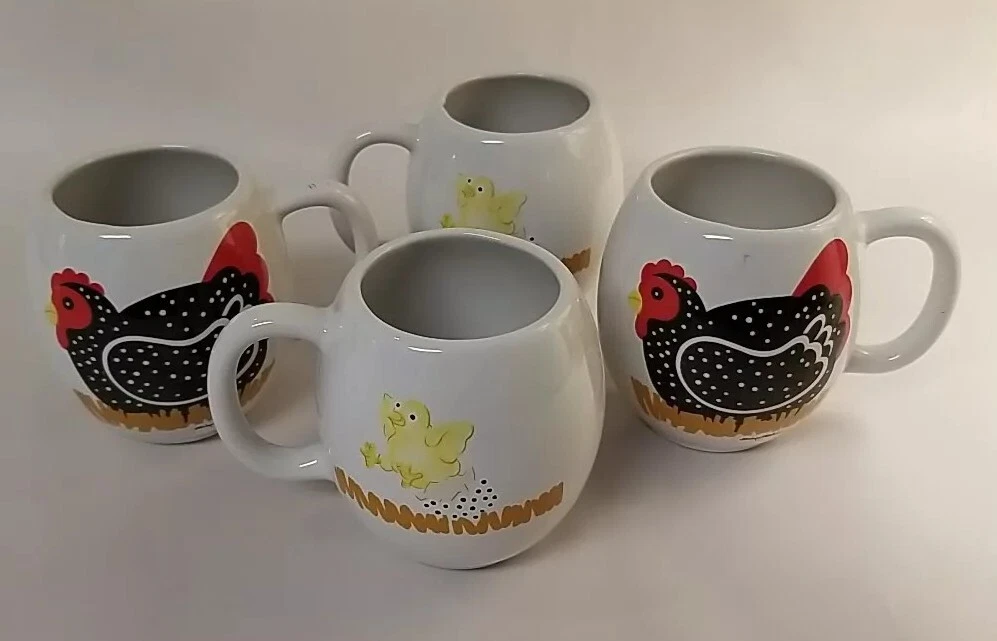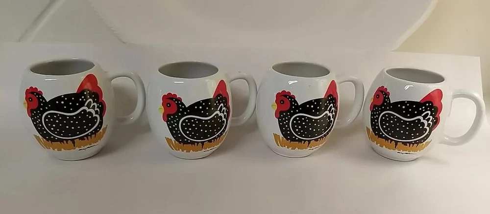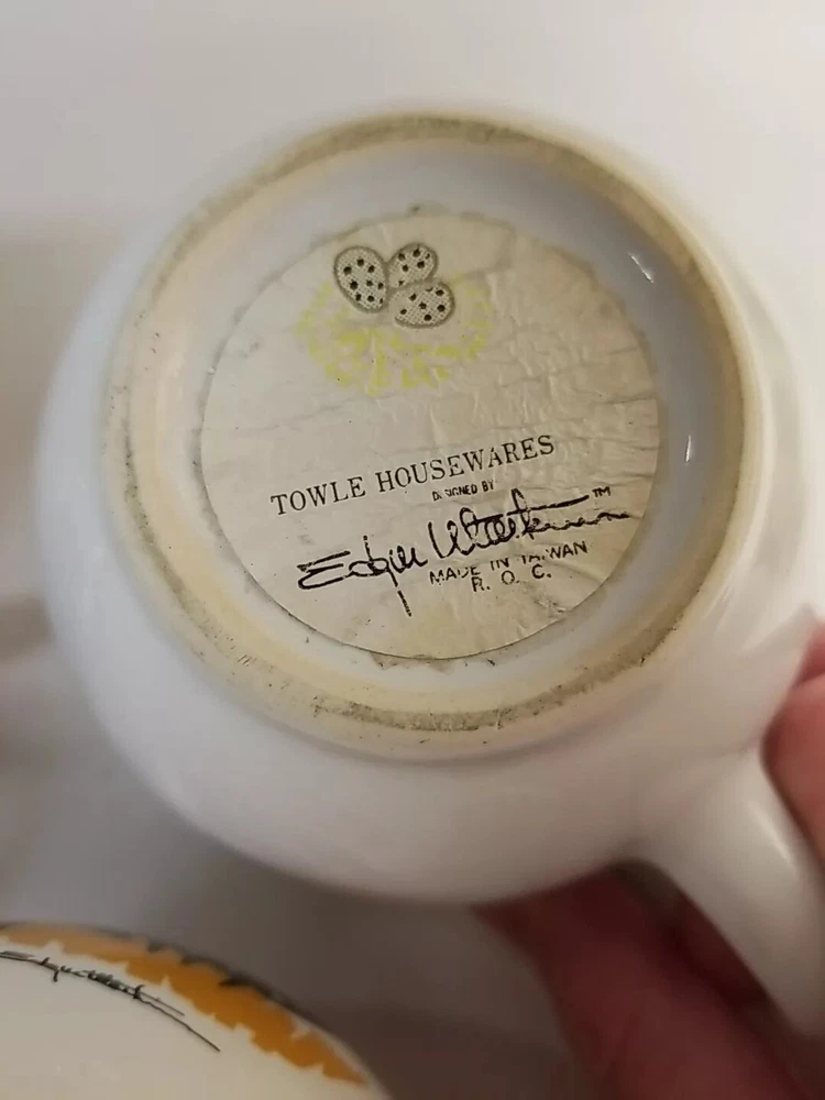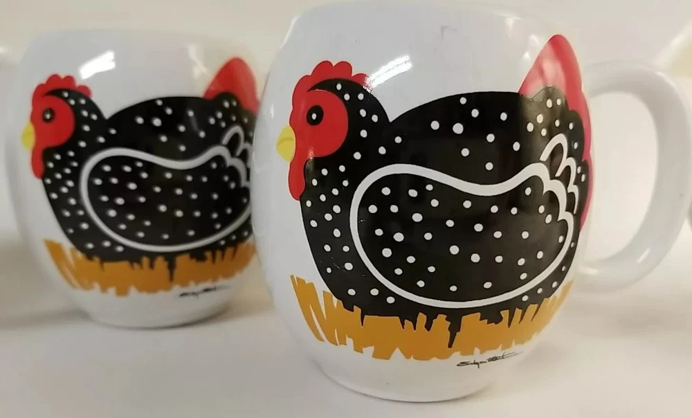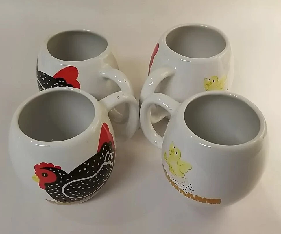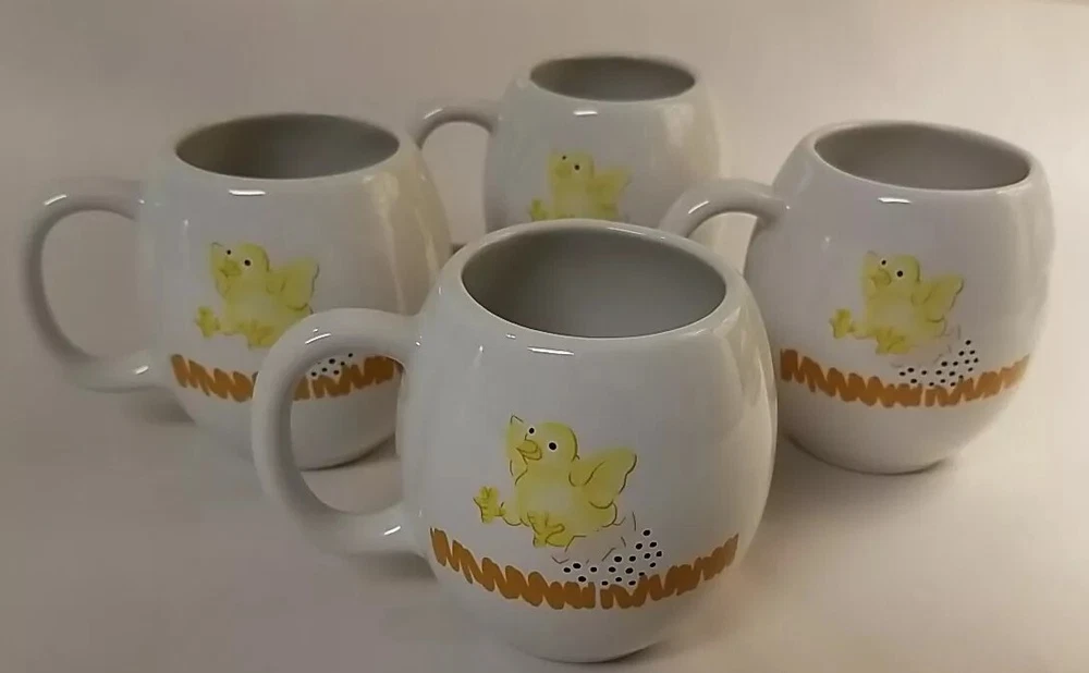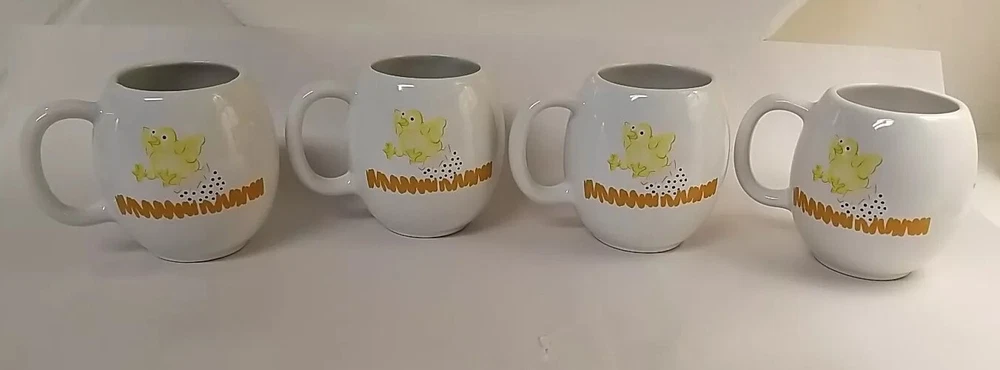 4 5/8 inches wide across the handles and 4 inches tall. Adorable and fun whimsical coffee mugs or tea cups, designed by artist Edgar Watkins. Set of four mugs show some minor scuffing and a hairline crack is visible on one cup, see photos.