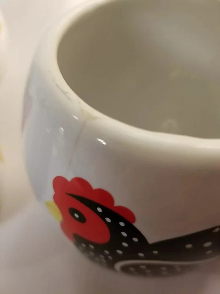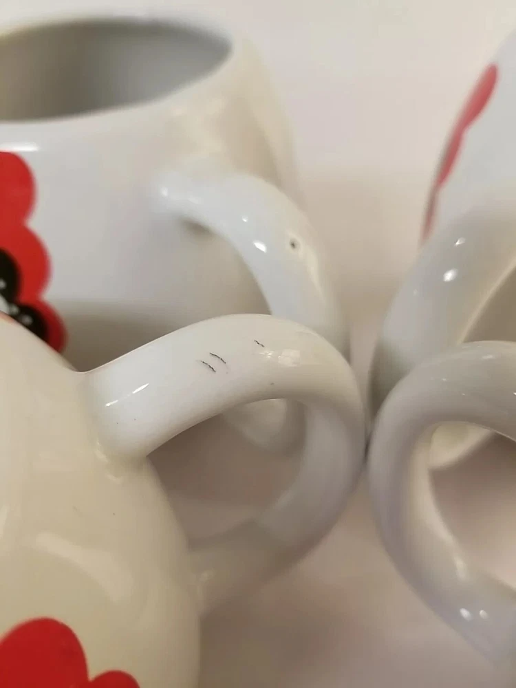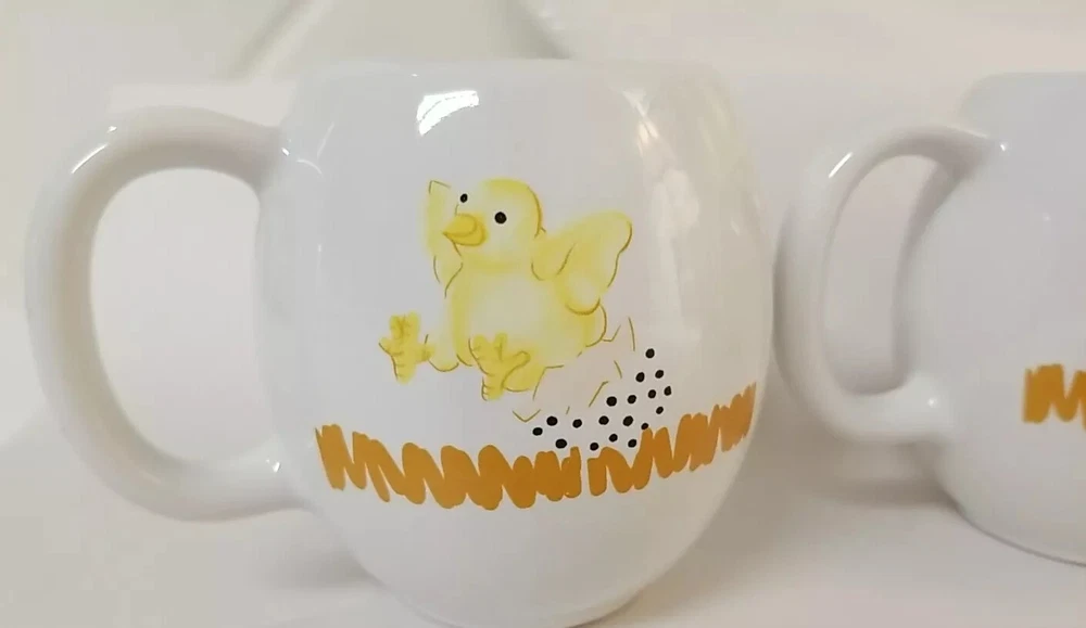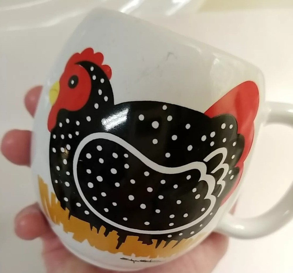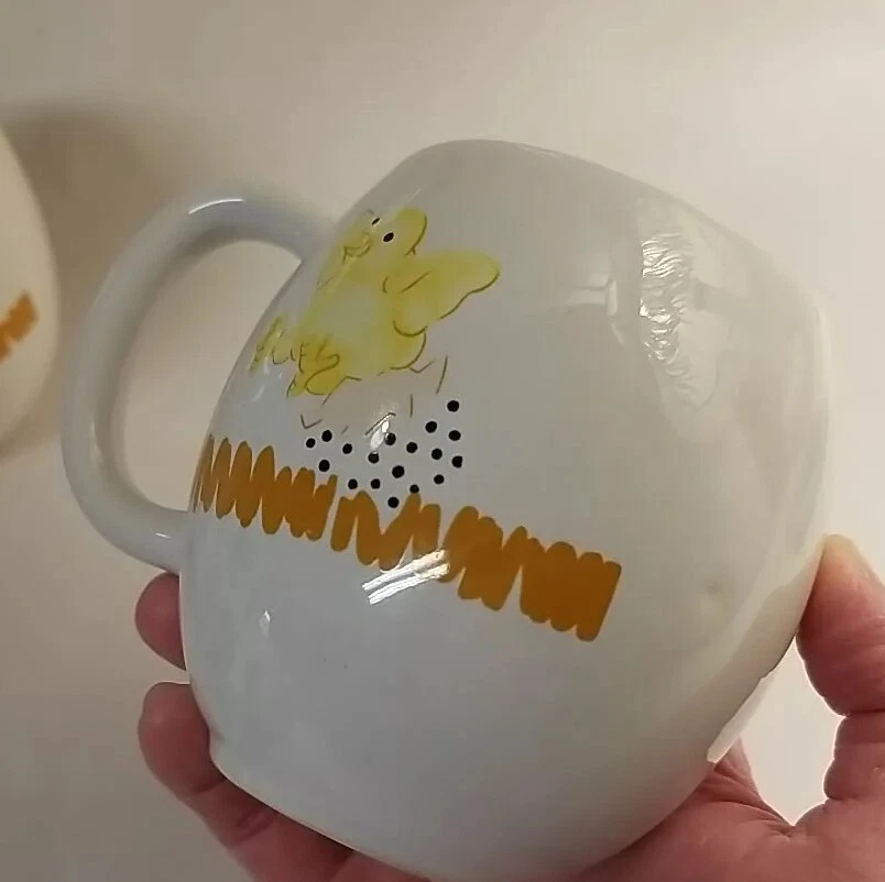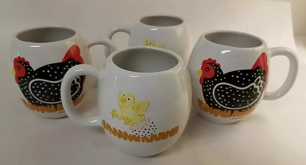 4 5/8 inches wide across the handles and 4 inches tall. Adorable and fun whimsical coffee mugs or tea cups, designed by artist Edgar Watkins. Set of four mugs show some minor scuffing and a hairline crack is visible on one cup, see photos.