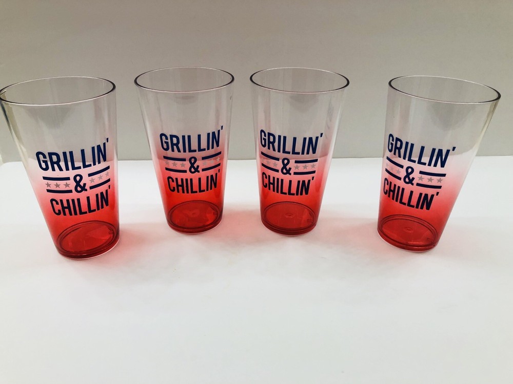 4- Tumbler 21oz / 622 ml Red, White, Blue "Grillin & Chillin" Plastic New with Tags