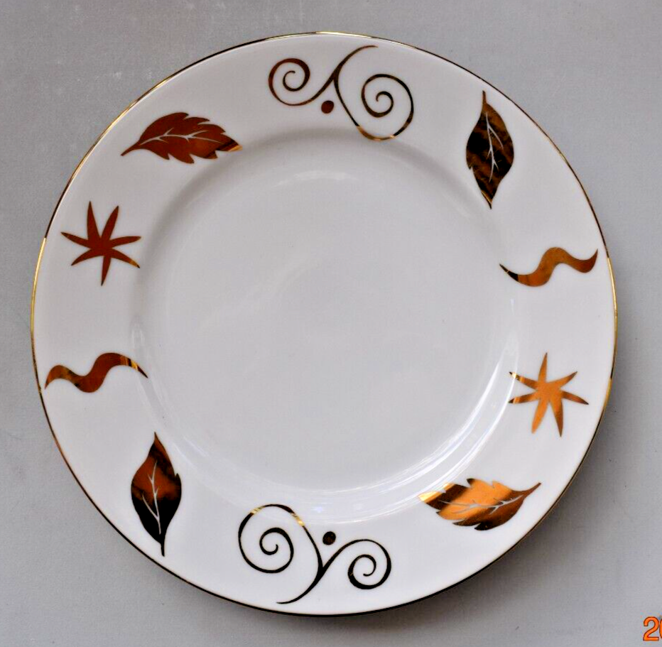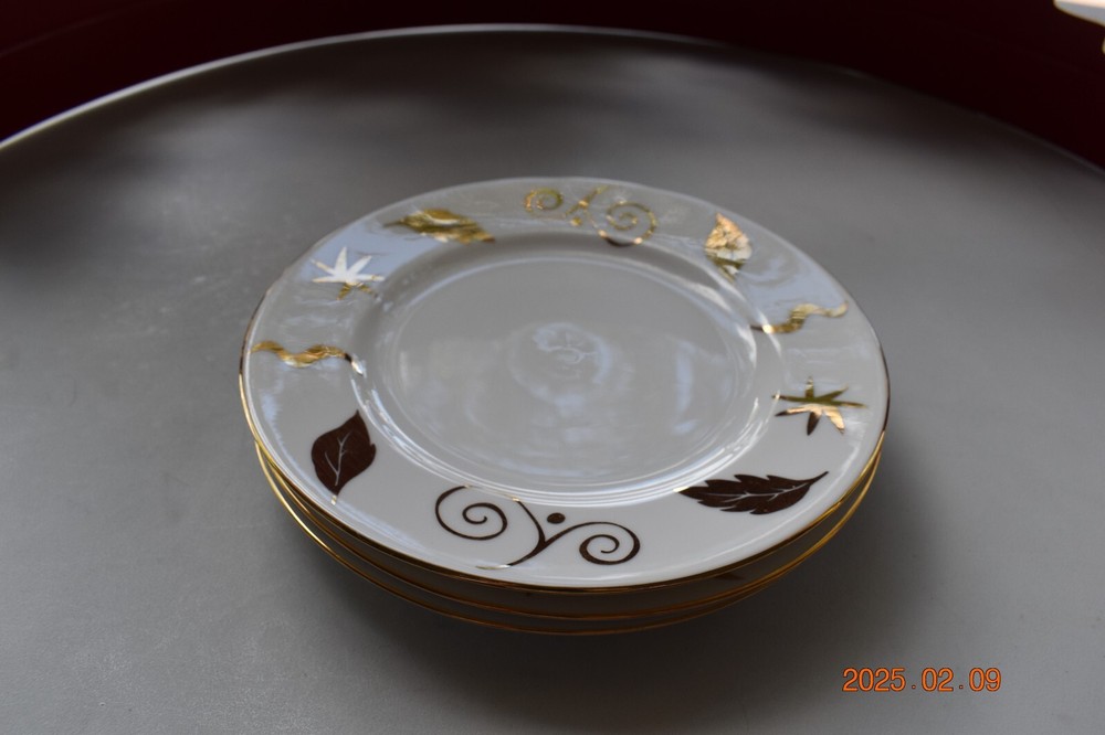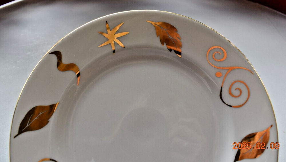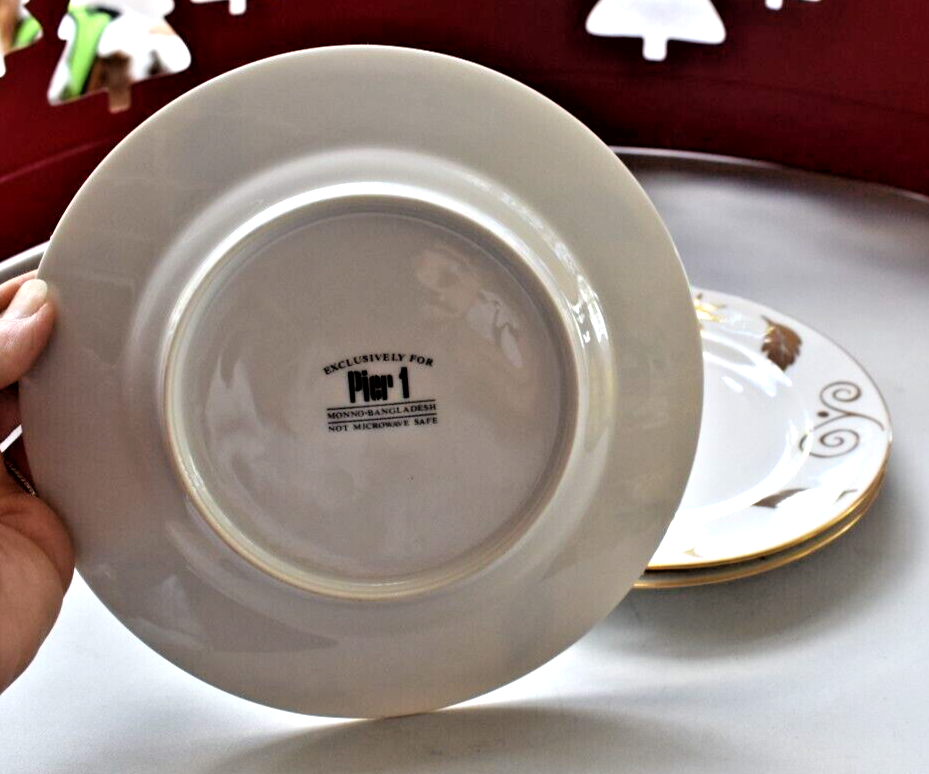 This set includes four round Pier 1 Imports dinner plates from 2005, featuring an Art Deco style with a glossy finish. The plates measure 10" in diameter and are adorned with a pattern of gold leaves, squiggles, and stars on a porcelain/ceramic material. Designed for holidays and all occasions, these vintage plates showcase a festive theme perfect for Christmas gatherings. Hand wash only, these decorative and stackable plates add a touch of elegance to any table setting.
