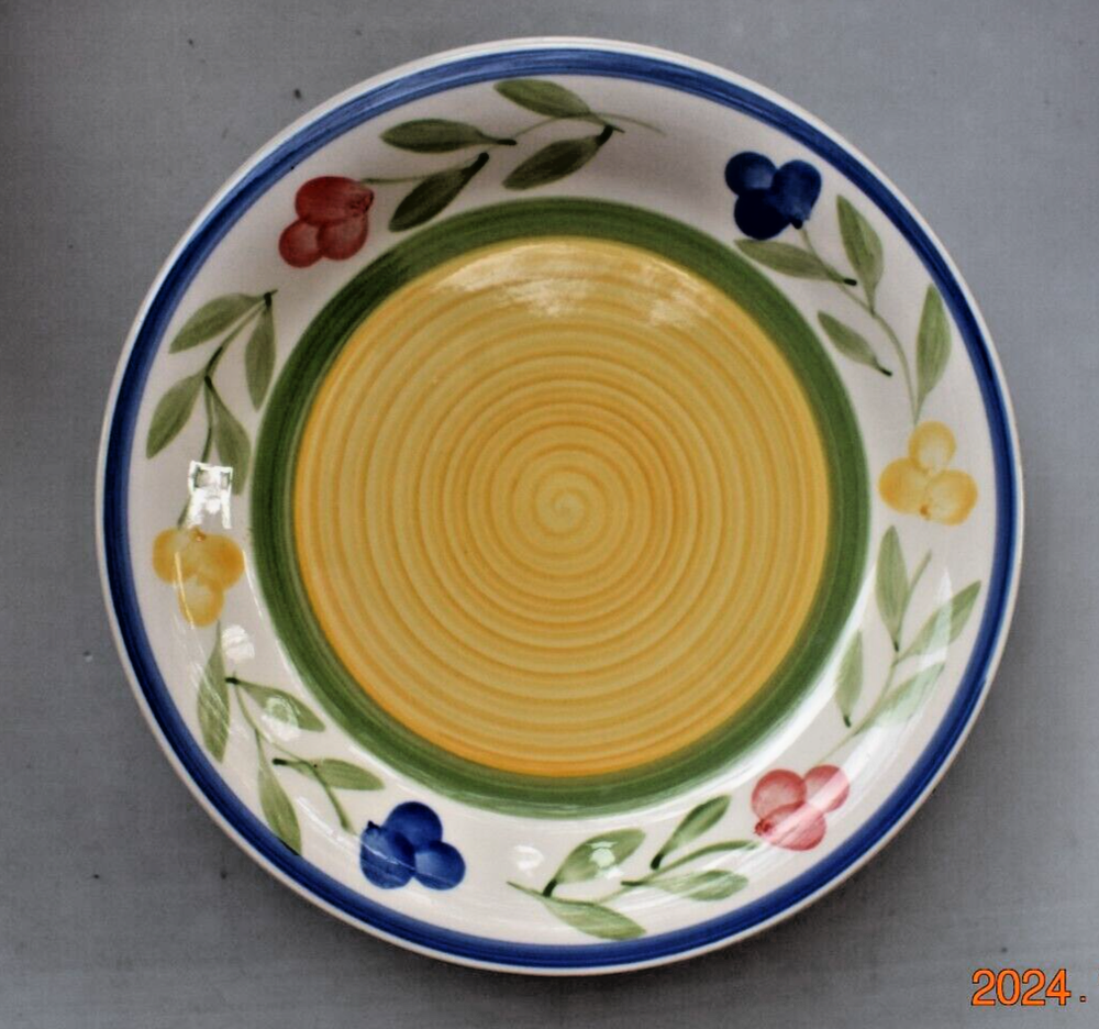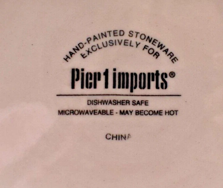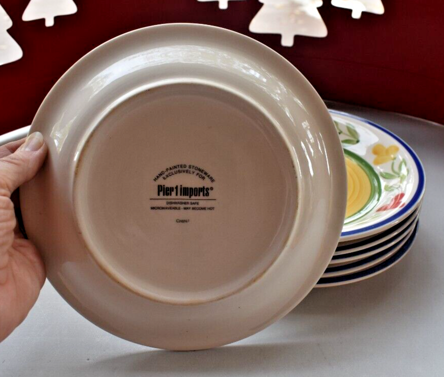 This vintage 1990 Pier 1 Imports salad plate set includes four 7.75" round plates featuring red, yellow, and blue flowers on a colorful, eclectic design. Made of ceramic, these hand-painted plates are stackable, microwave and dishwasher safe for convenience. Part of the Pier 1 Imports Eclectic & Colorful Dinnerware Collection, these glossy-finished plates add a vibrant touch to any table setting, making them suitable for all occasions in the late 20th-century era.