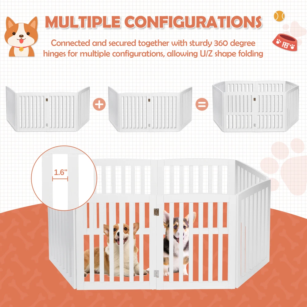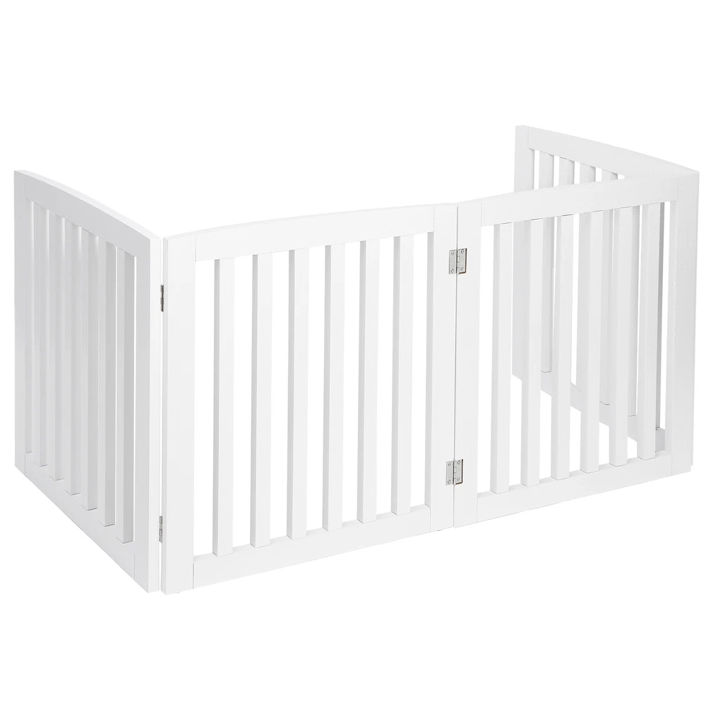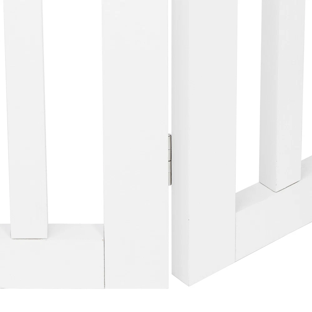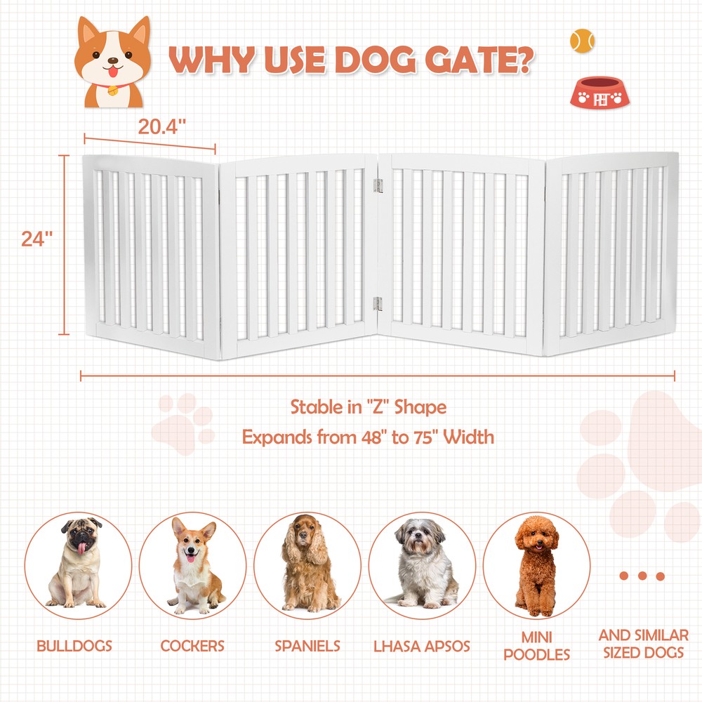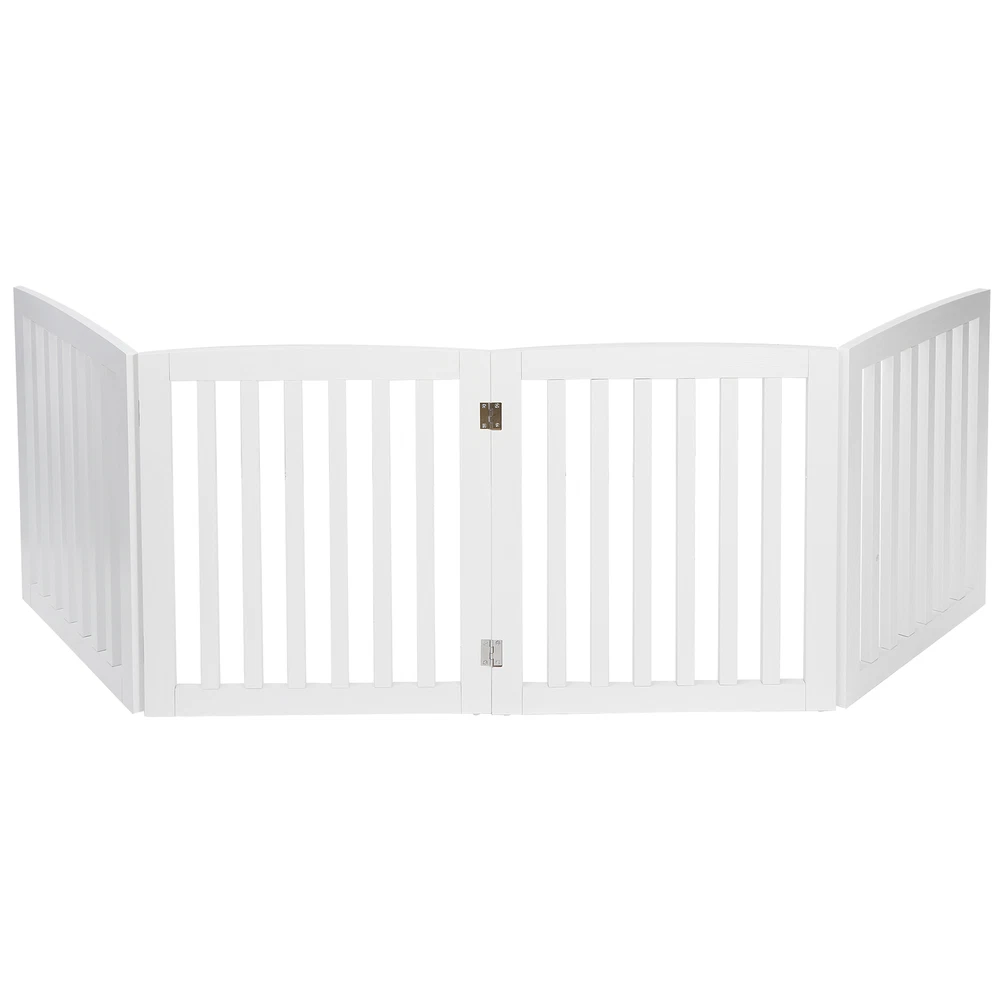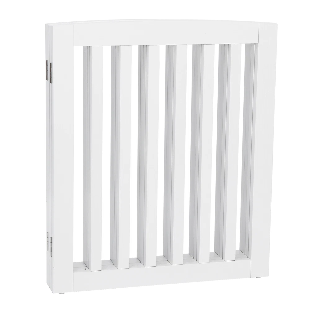 Specifications: Color:White Material:MDF Item Weight:9.1KG/20.06 LB Folded size: 52*61*7cm/20.4*24*2.7 in Maximum unfolded size: 208.5*61*1.8cm/82*24*0.7 in Single piece size: 52*61*1.8cm/20.4*24*0.7 in Features: PET ACCESSORY : The Pet Gate provides a safe and efficient way to confine your pets while offering a decorative and handsome touch to your home. This 24” height gate allows adults to step over the barrier if needed 4 PANELS: Gate is built with 4 separate panels secured together with sturdy hinges allowing the gate to fold out into a Z-shape configuration. Once folded out into the wide Z-shape, the gate is free standing and may be used in front of doorways, entryways, halls, bedrooms and staircases DURABLE: Constructed from a durable MDF and sealed with a rich White finish keeping your dog, puppy or other pets securely confined while you are away SLIM & COLLAPSIBLE: Gate folds down to 3” for ease of storing in slim and narrow areas when not in use