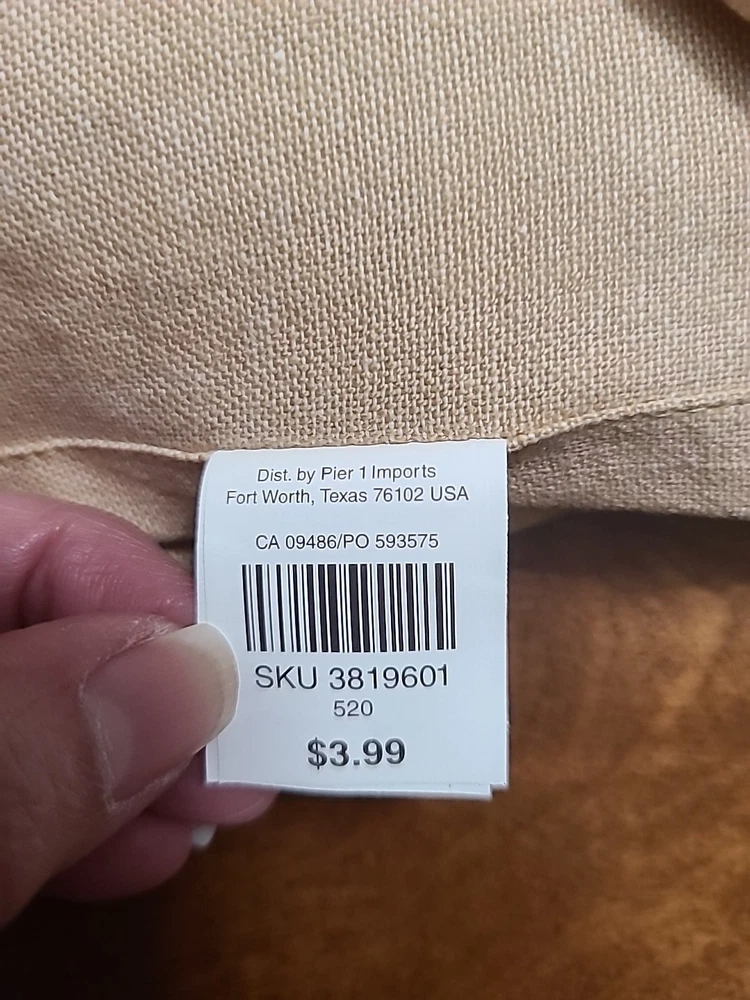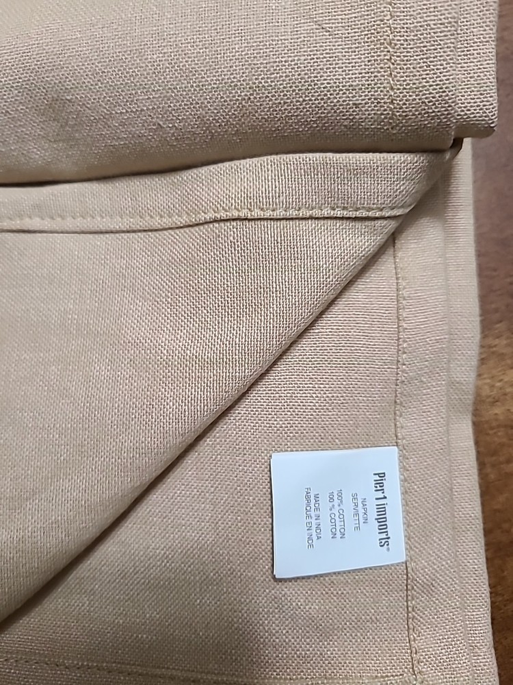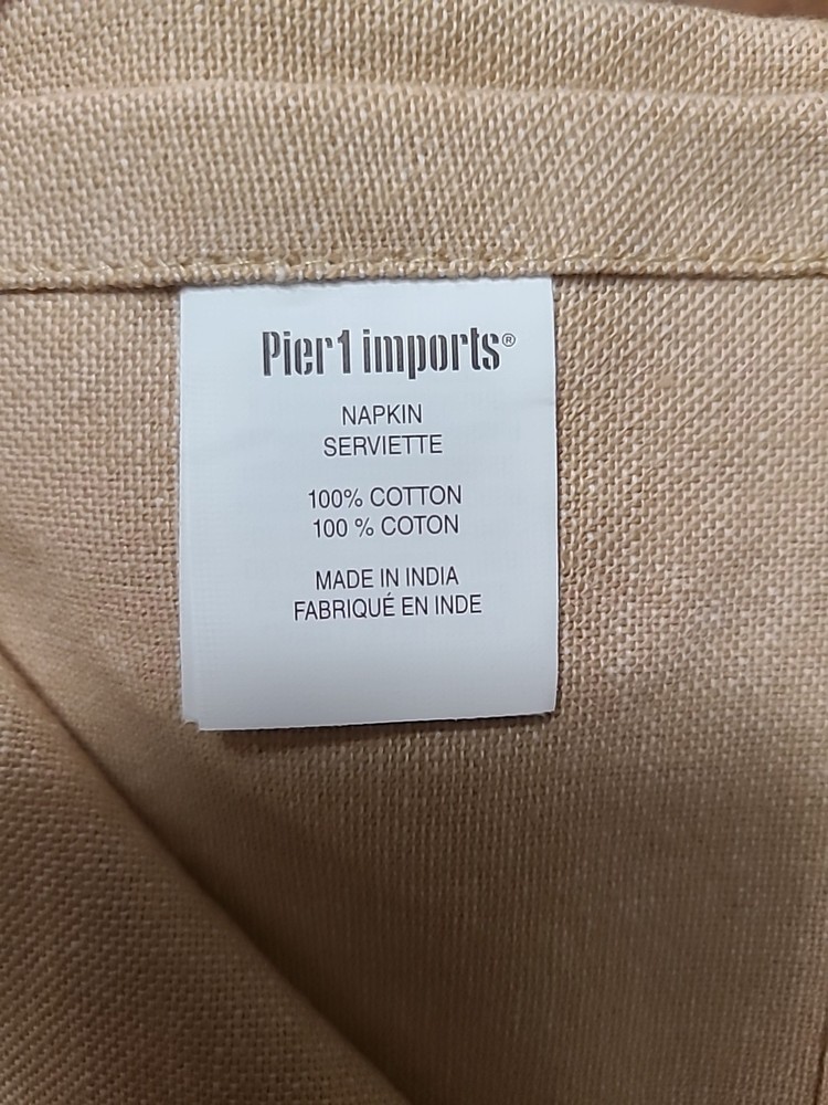 Elevate your dining experience with these high-quality cotton 20x20 napkins from Pier 1. These beige napkins are perfect for any occasion, whether it's a casual lunch or a formal dinner. With a classic solid pattern and a square shape, they are sure to complement any table setting. Made in India, these napkins are machine washable up to 85°F for easy care. They are also iron safe, so you can achieve a crisp and clean look for your table. Each pack contains four napkins, making them an ideal choice for families or those who entertain guests frequently. Add a touch of beachiness to your home with these Pier 1 cotton napkins.