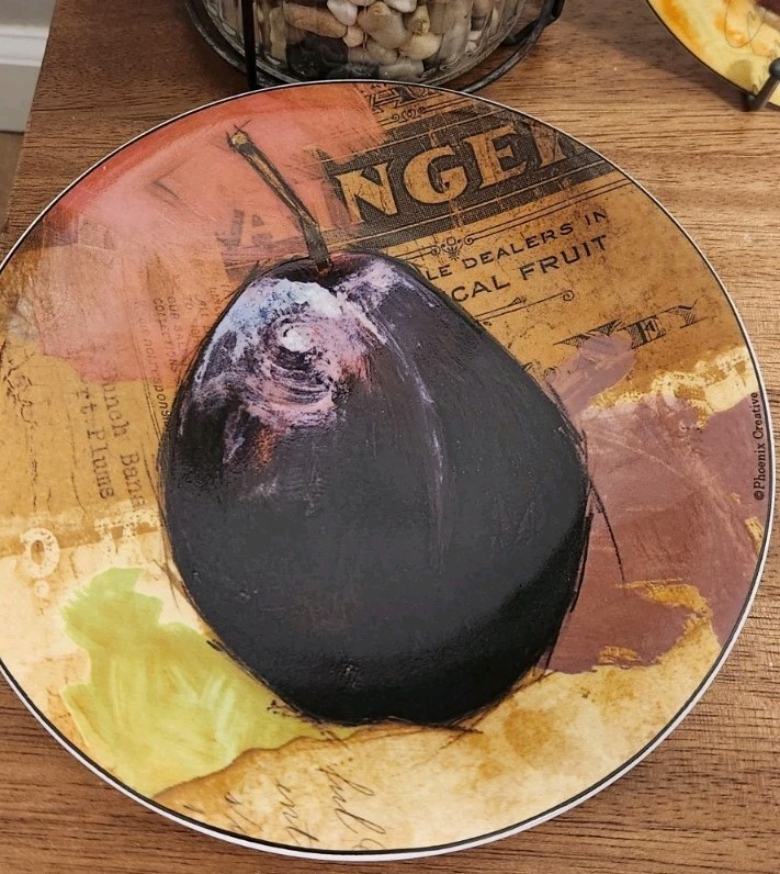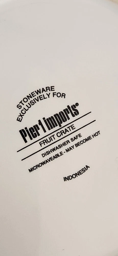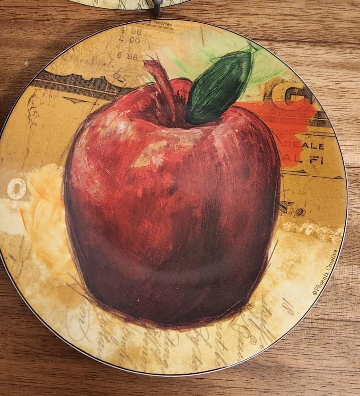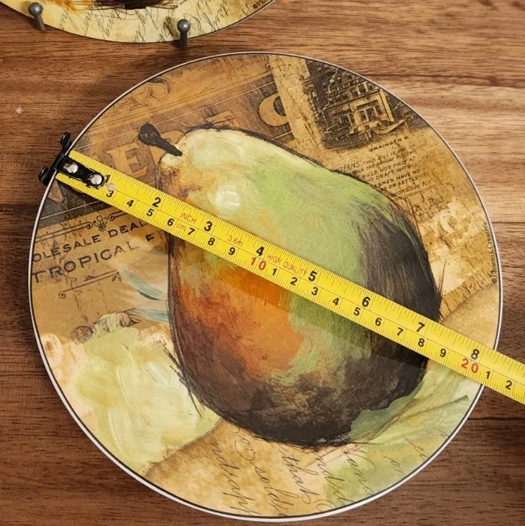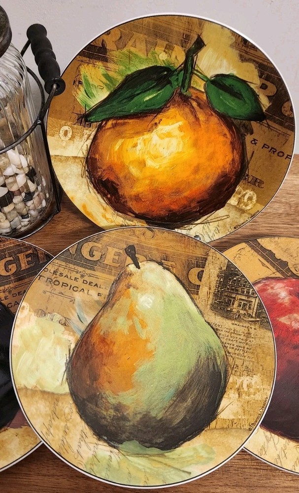 4 Pier 1 Imports 8" Salad Plates "Fruit Crate" Plum, Peach, Apple, Pear French NEW, used for display only. I will not separate & I'm not taking offers....
