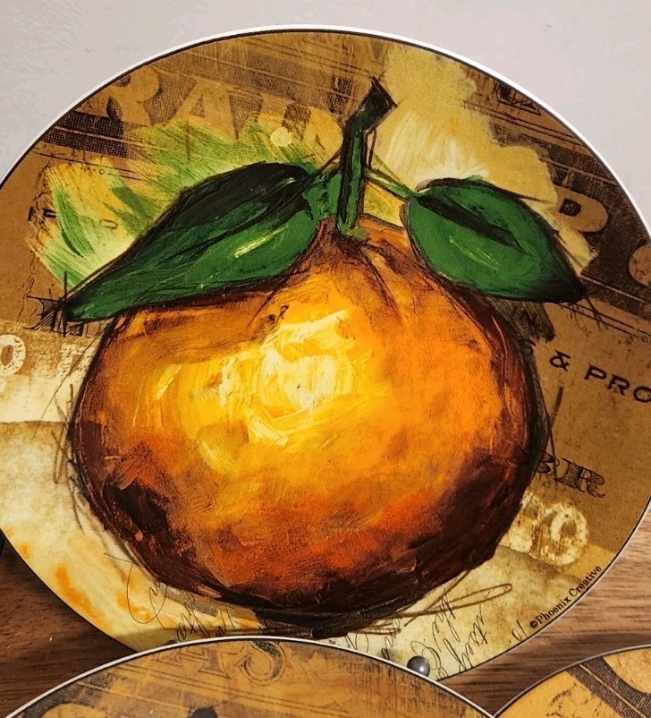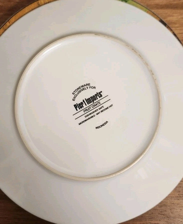 4 Pier 1 Imports 8" Salad Plates "Fruit Crate" Plum, Peach, Apple, Pear French NEW, used for display only. I will not separate & I'm not taking offers.