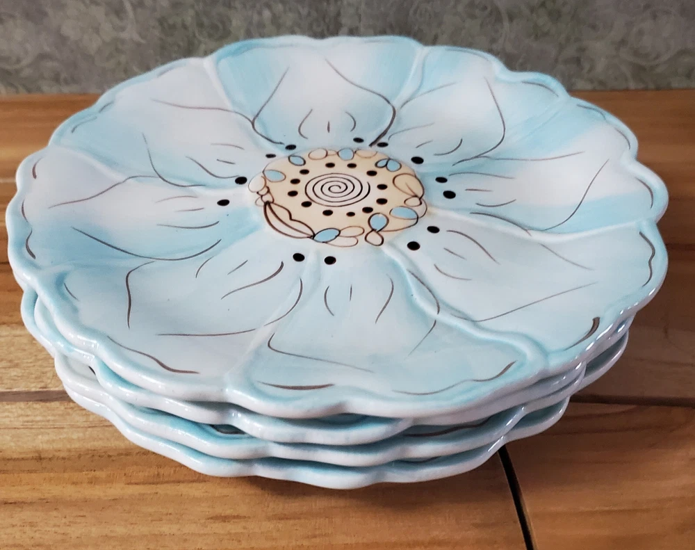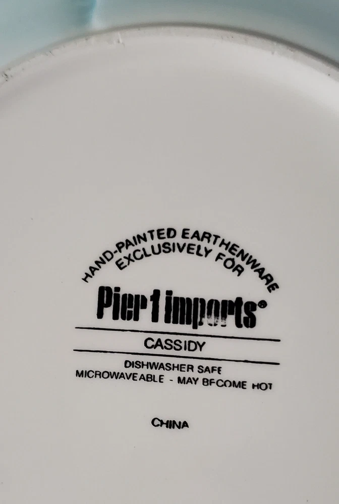 Add a touch of elegance to your table setting with this four-piece set of Pier 1 Imports Cassidy Figural Appetizer Salad Dessert Plates. The round earthenware plates are hand-painted with a beautiful blue and cream flower theme, featuring a glossy finish. These original production style plates are perfect for all occasions and can be used as starter plates or snack plates. The plates have a printed backstamp and belong to the Cassidy product line. They were manufactured in China between 2010 and 2019 and are not antique. The set includes a snack plate and is great for decorative cookware, dinnerware, and serveware. Previously Owned - Never Used - Excellent Condition - NO chips - NO cracks!