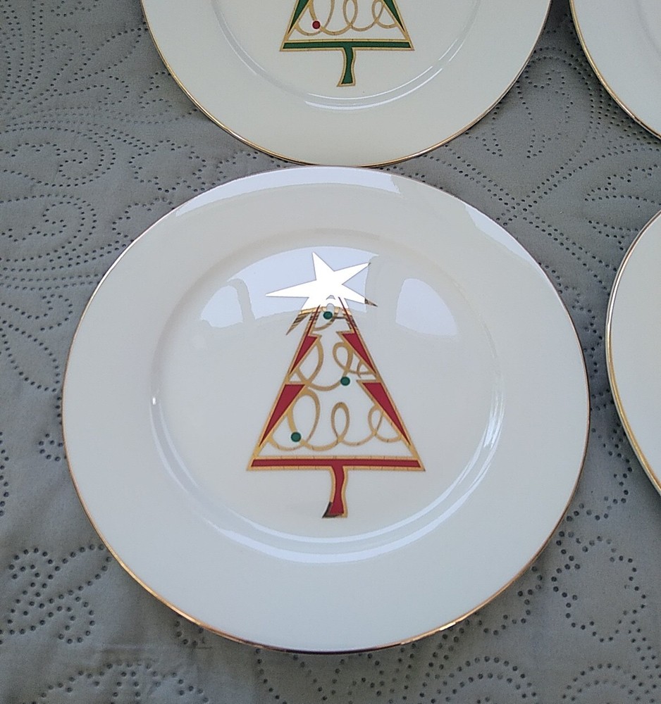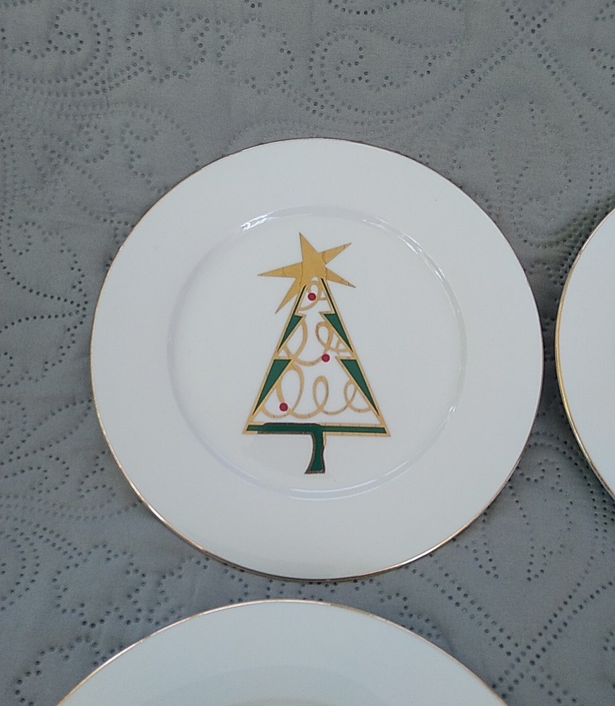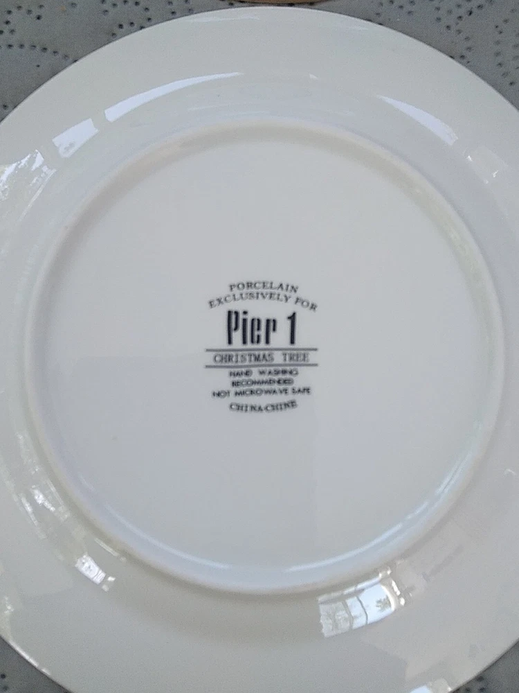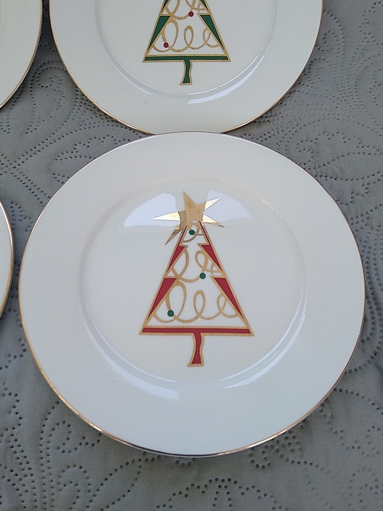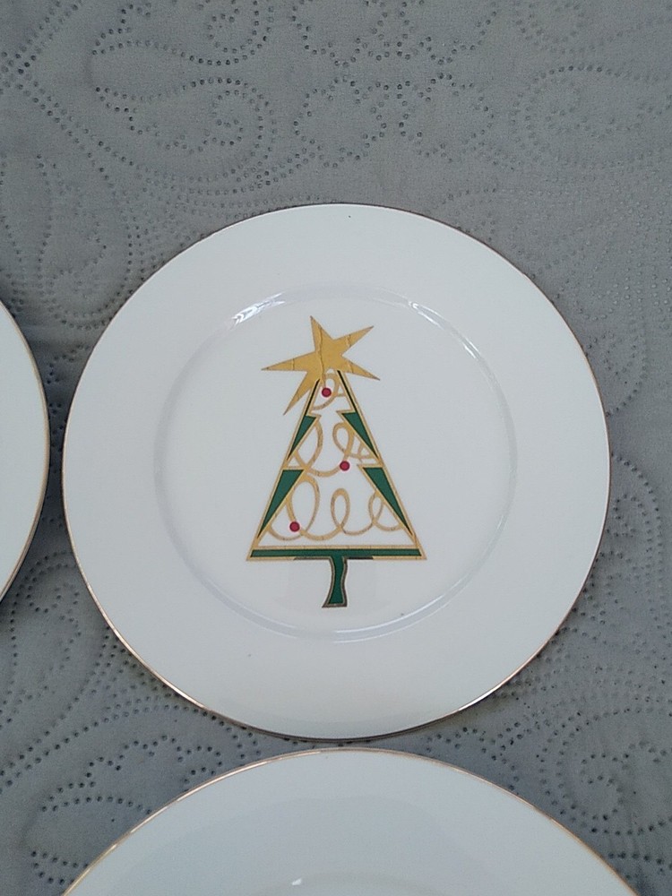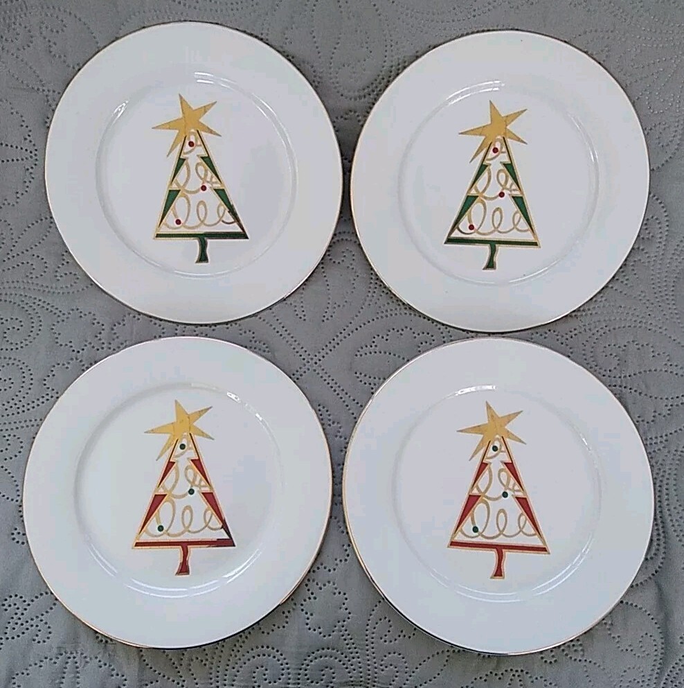 4 Pier 1 Imports Christmas Tree Holiday Party Dessert Plates Set Red Green Gold. 7 1/2"...