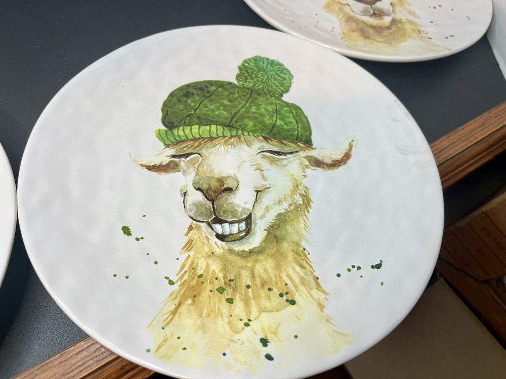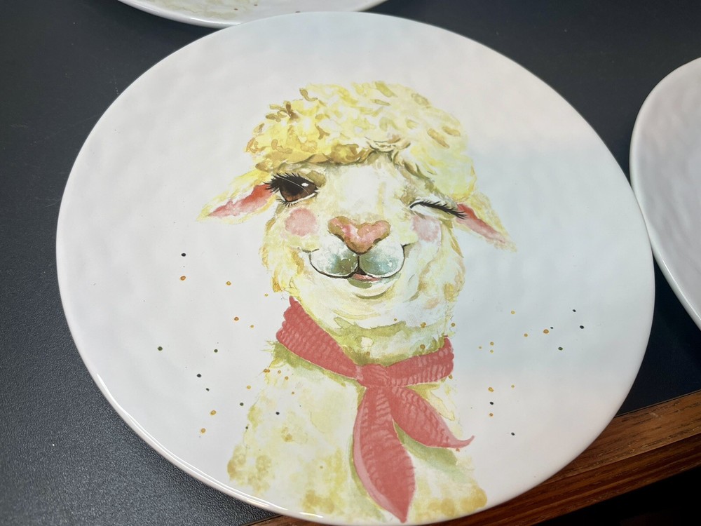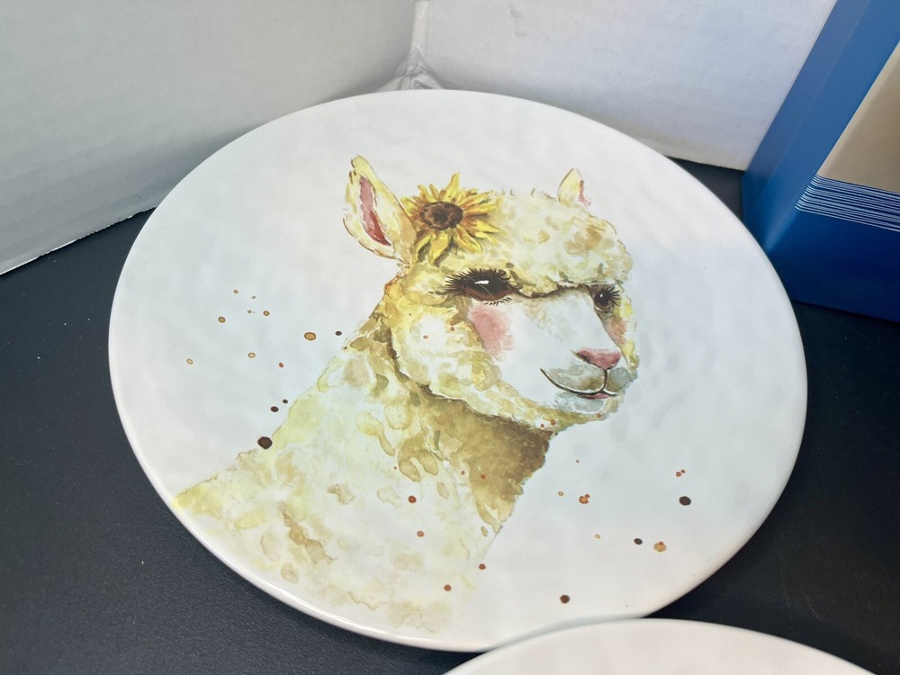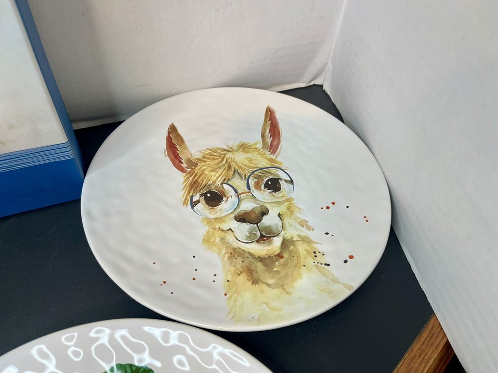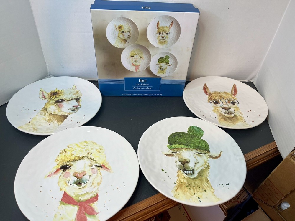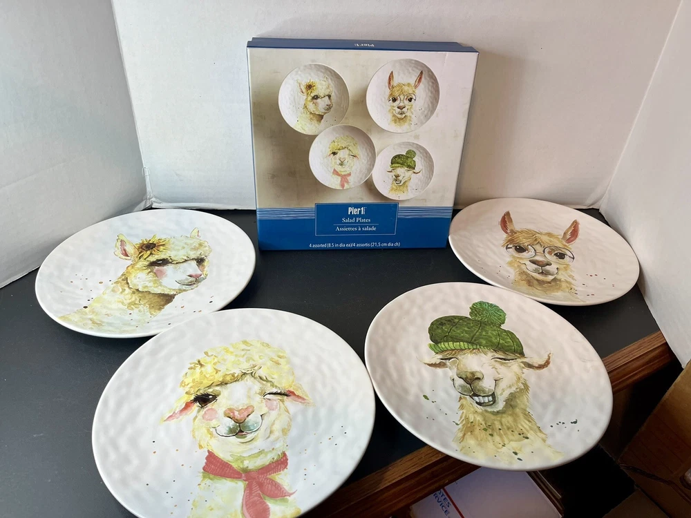 Set of 4 - Pier 1 Imports Earthenware Alpaca Llama Salad Dessert Plates NEW in Box. Have 3 sets available. Price is for one. Add a touch of exotic charm to your dining table with these 4 Pier 1 Imports earthenware salad dessert plates. Crafted from high-quality stoneware, these round plates measure 8.5 inches in diameter and feature a vibrant multicolor design that is sure to impress your guests. They are perfect for serving your favorite desserts and salads, and they are sure to add a touch of elegance to your table setting. Whether you're hosting a dinner party or enjoying a casual meal with your family, these plates are a must-have. New. Please see photos for more details on condition. Packaged with care and shipped quickly from our smoke-free home. Always happy to combine/reduce shipping for multiple purchases. Local pickup in Hoosick Falls NY or safely shipped to your front door. I also have a store is under www.ebay.com/str/Chromekingz , with over 900 items, simply click above… Please check it out.