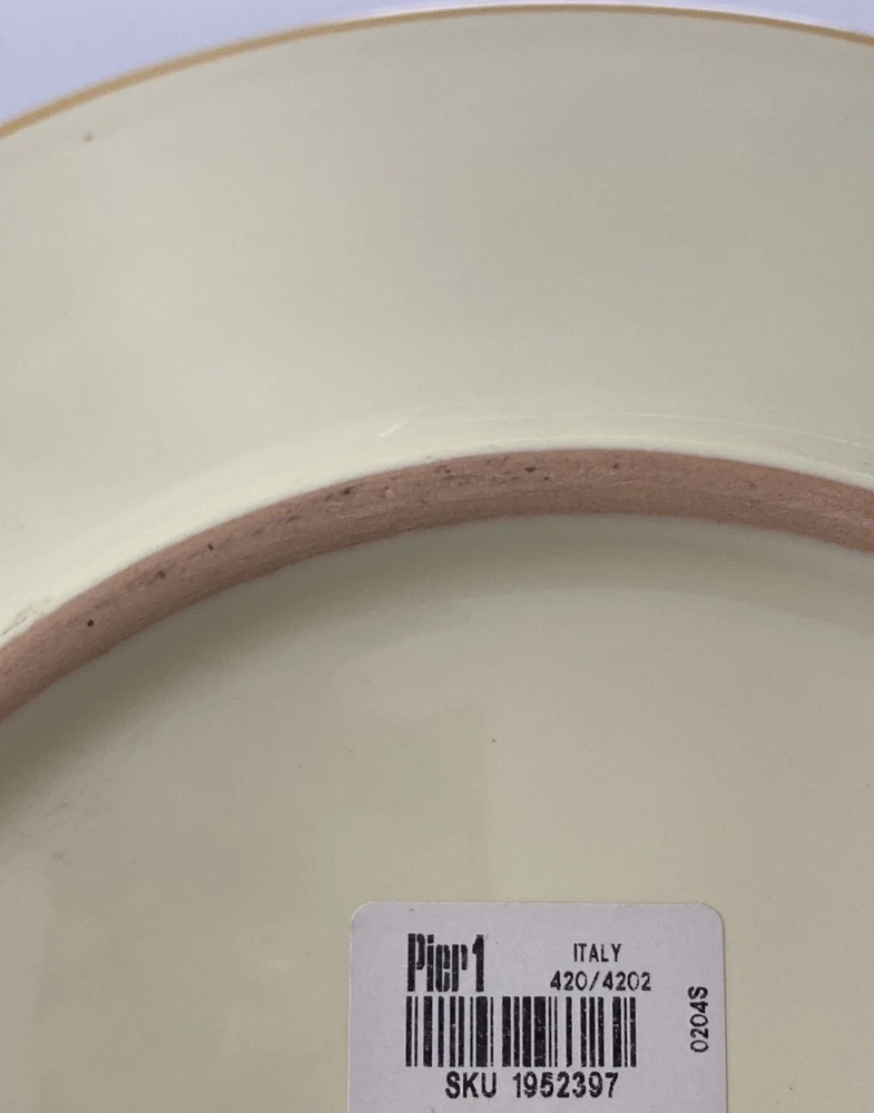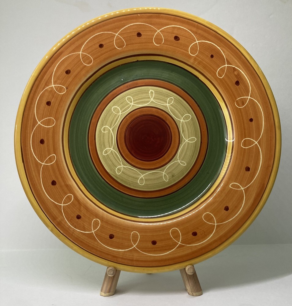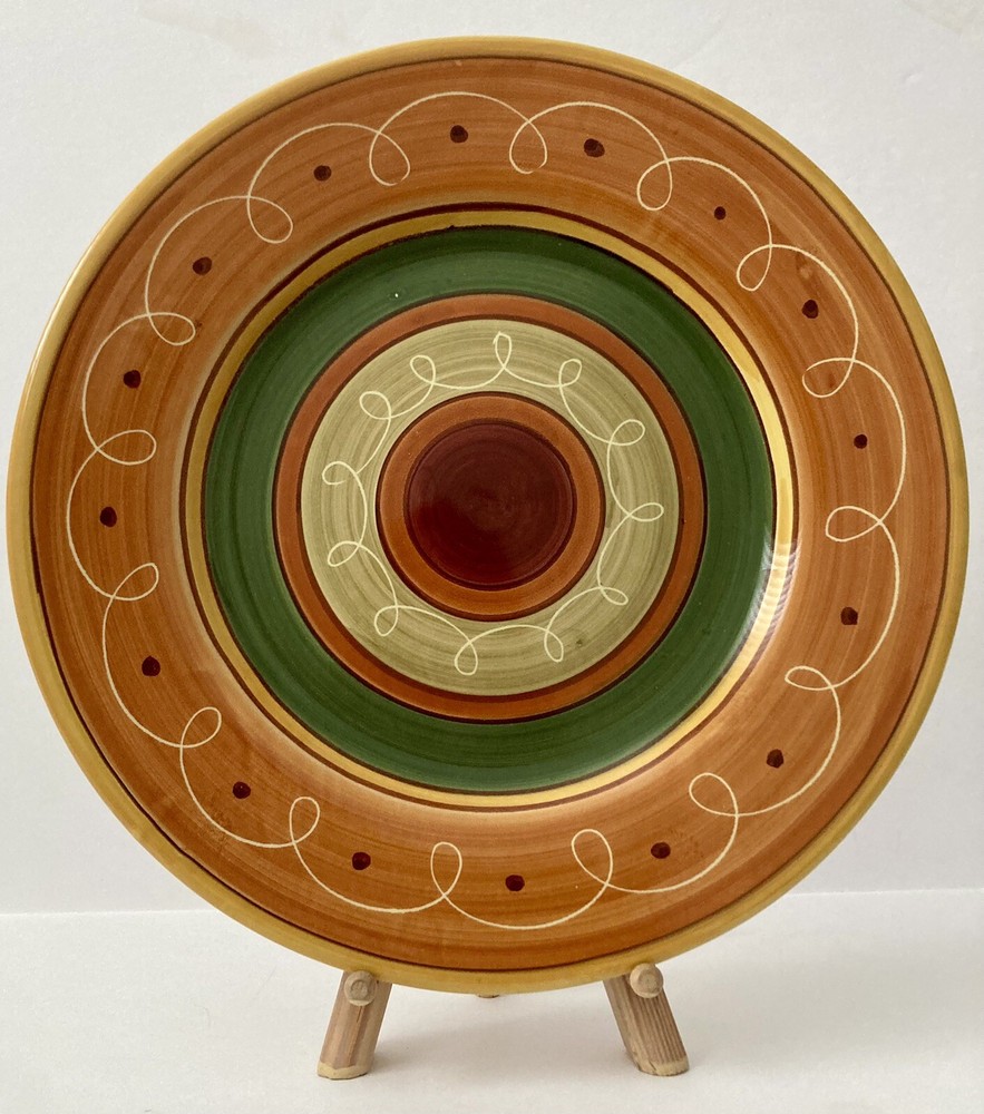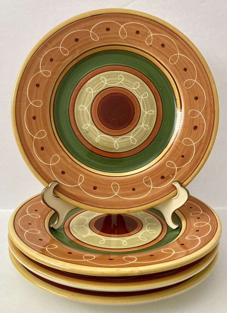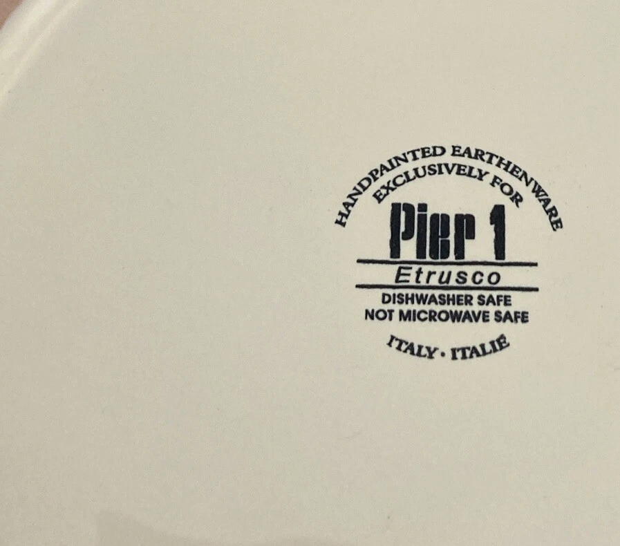 Set of 4 hand-painted Pier 1 Imports Etrusco dinner plates. Measuring 11.5 inches in diameter, these earthenware plates feature a colorful and intricate Italian design, perfect for any meal. The backstamp is printed, indicating authenticity, and they are dishwasher safe , not microwave safe ( please check the stamp photo) New with stickers on.