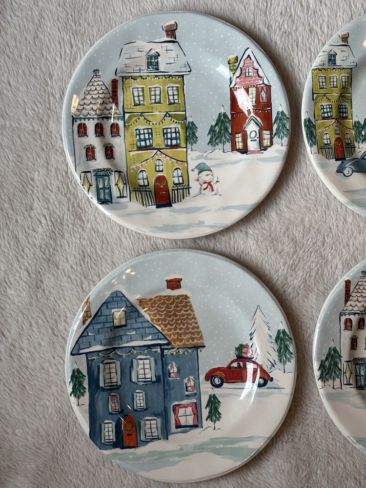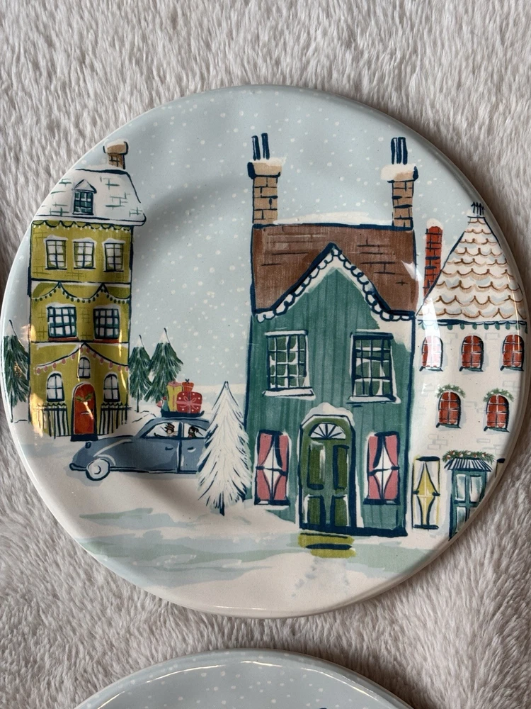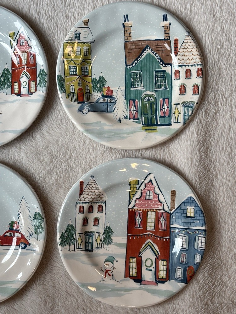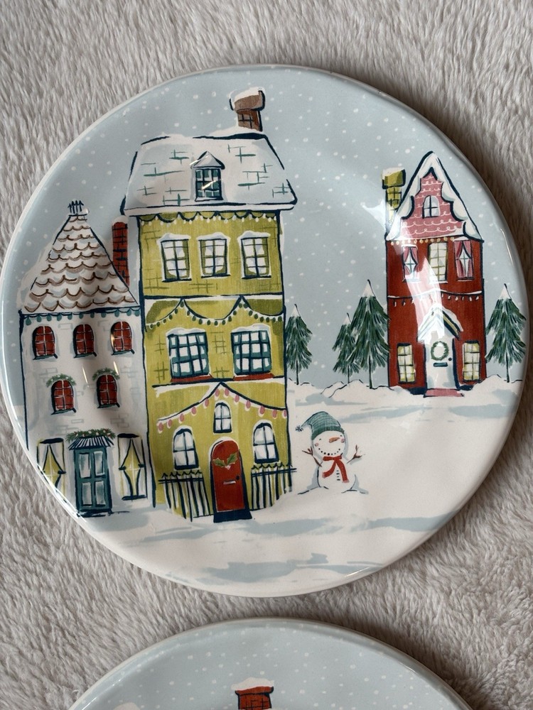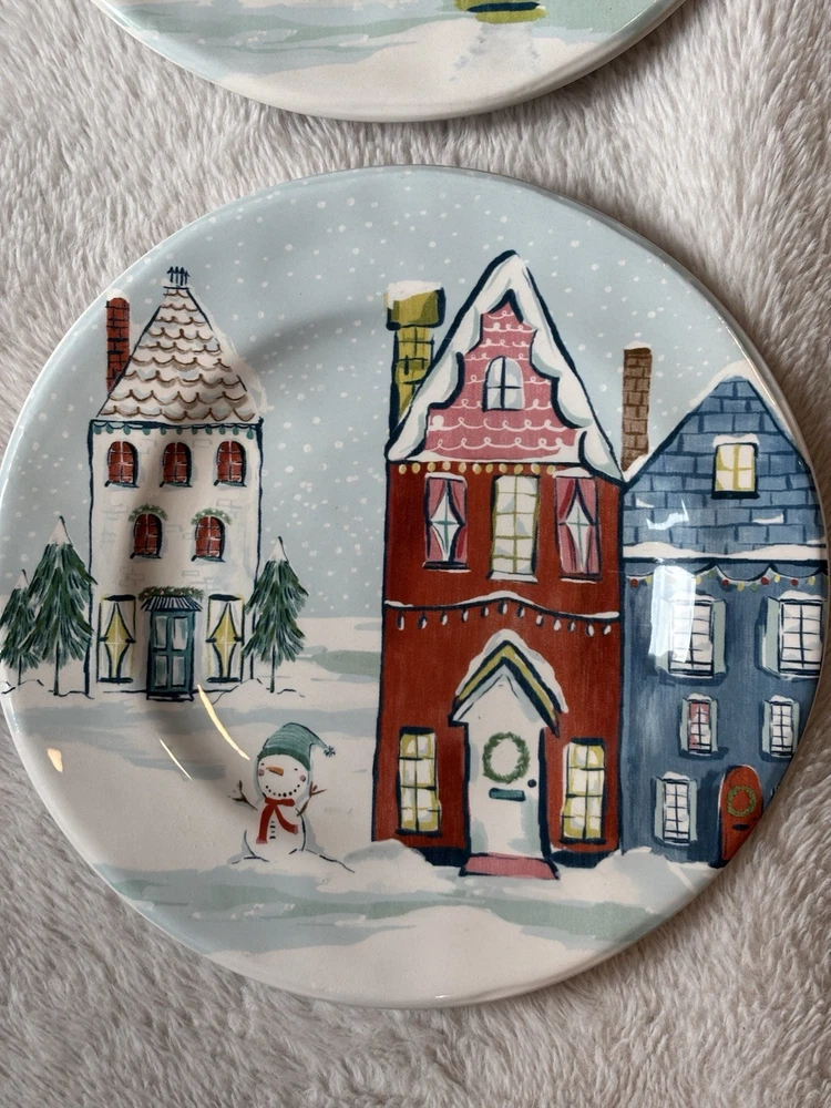 This set of four Pier 1 Imports Ironstone Winter Christmas Village Salad Dessert Plates is a festive and decorative addition to any holiday table setting. With a round shape and a glossy finish, these plates feature a winter Christmas pattern in multicolor. Made of stoneware and dishwasher/microwave safe, these plates are both functional and stylish. The contemporary design and original production make them a unique and eye-catching choice for your festive holiday gatherings.