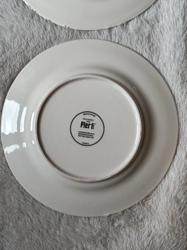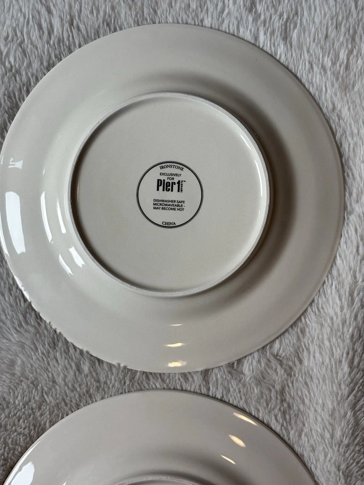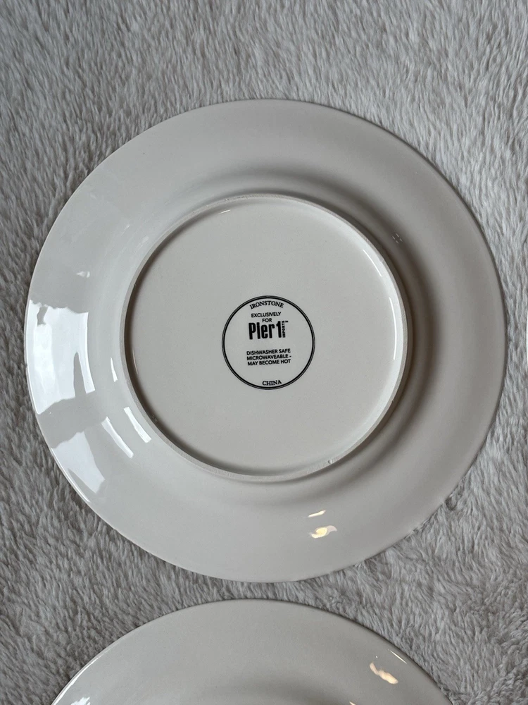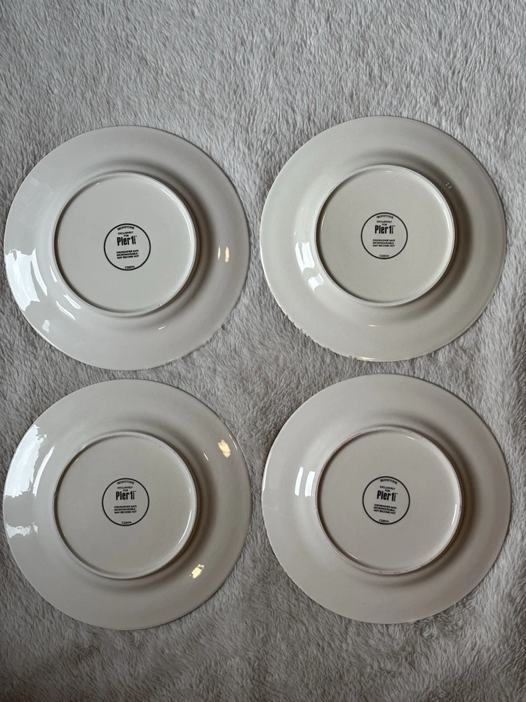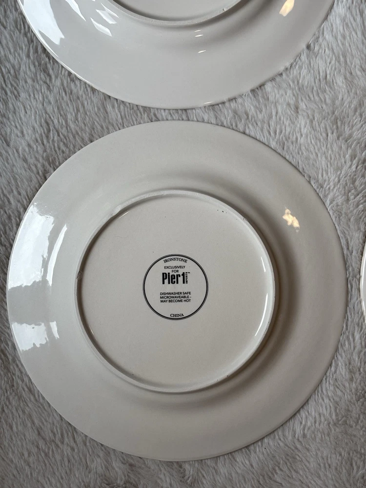This set of four Pier 1 Imports Ironstone Winter Christmas Village Salad Dessert Plates is a festive and decorative addition to any holiday table setting. With a round shape and a glossy finish, these plates feature a winter Christmas pattern in multicolor. Made of stoneware and dishwasher/microwave safe, these plates are both functional and stylish. The contemporary design and original production make them a unique and eye-catching choice for your festive holiday gatherings.