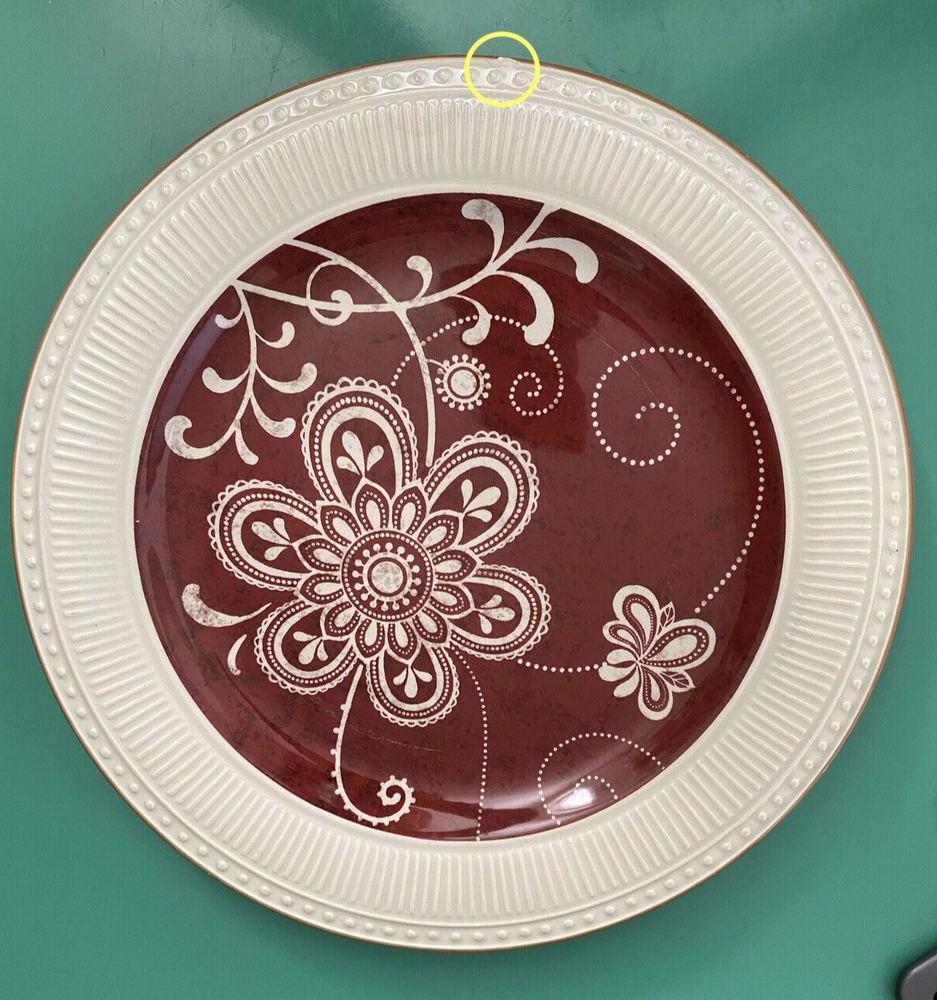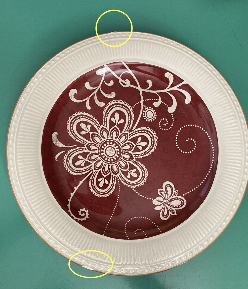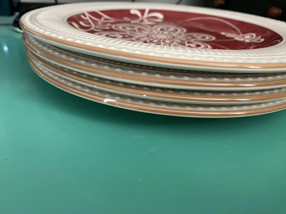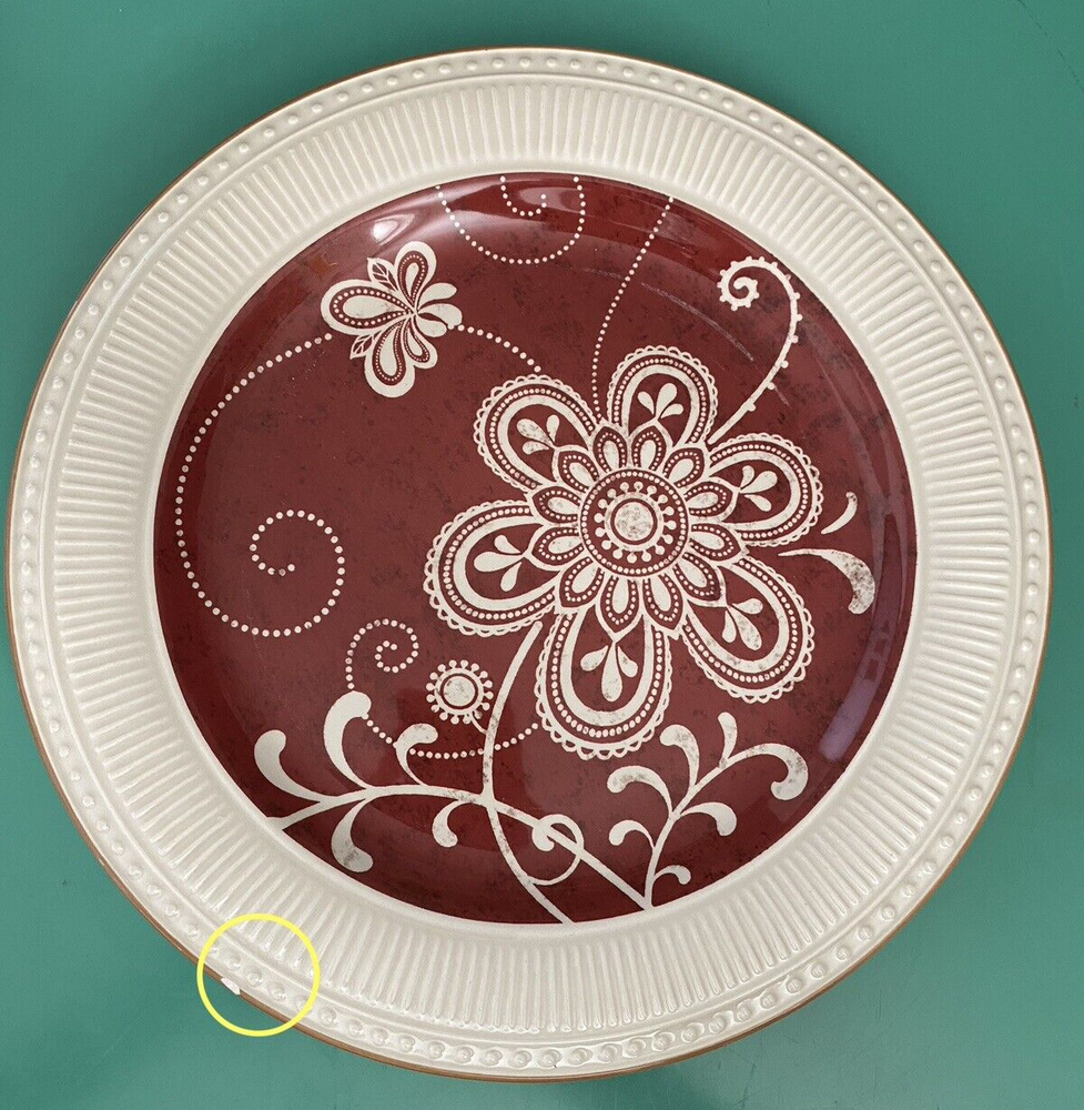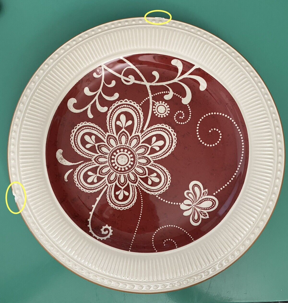 Set of 4 Plates by Pier 1 Imports - 11 in diameter dinner plates Each plate has some type of chip on the edge - I have circled them in yellow on the photos You will see a photo for each plate with yellow circles. Price is discounted because of the chips - still a very nice set to own - no cracks and minimal if any signs of usage. Actual item shown in photos Please use all photos as part of the description and please ask questions prior to purchase. Thank you for looking. Please check out the other items in my store.