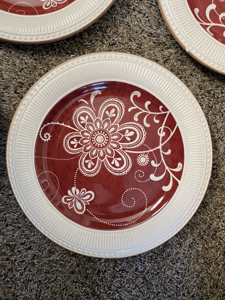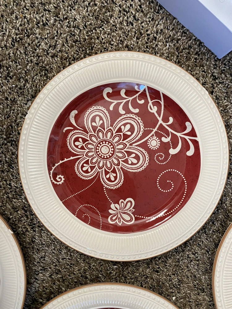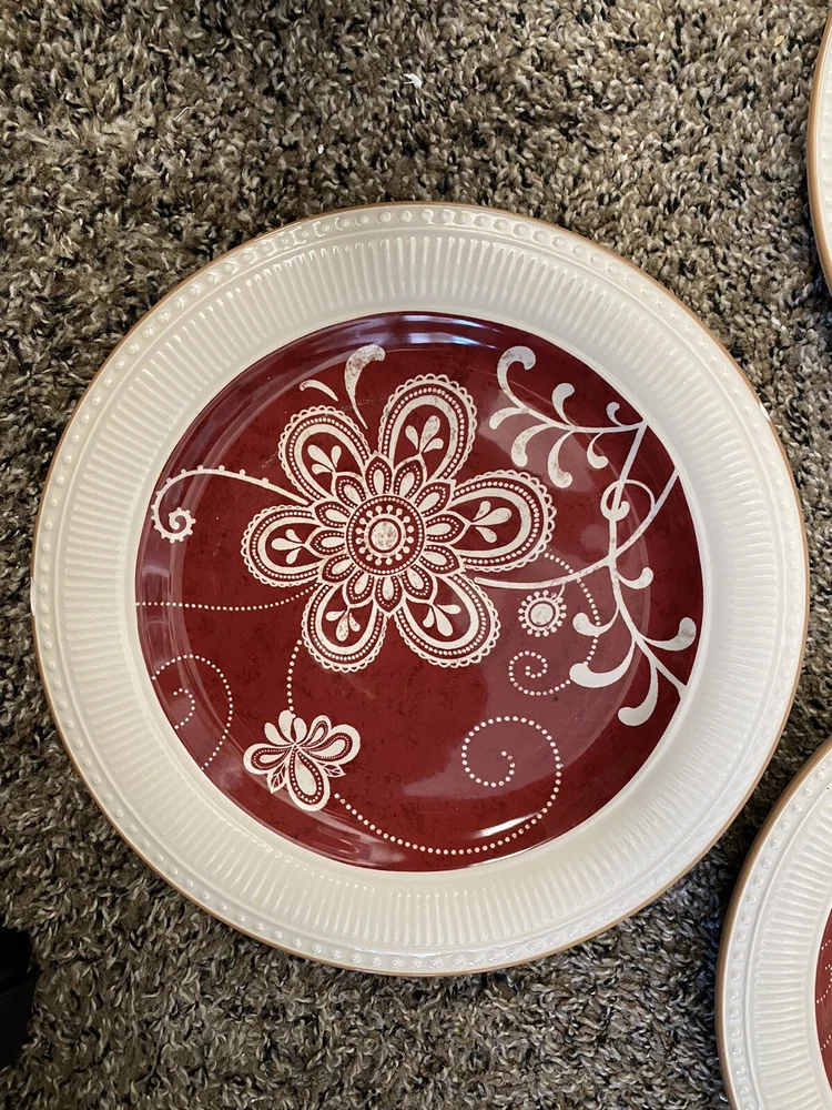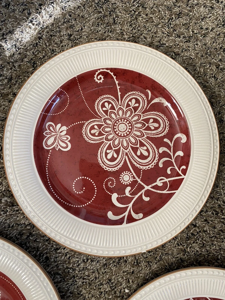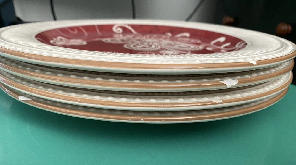 Set of 4 Plates by Pier 1 Imports - 11 in diameter dinner plates Each plate has some type of chip on the edge - I have circled them in yellow on the photos You will see a photo for each plate with yellow circles. Price is discounted because of the chips - still a very nice set to own - no cracks and minimal if any signs of usage. Actual item shown in photos Please use all photos as part of the description and please ask questions prior to purchase. Thank you for looking. Please check out the other items in my store.