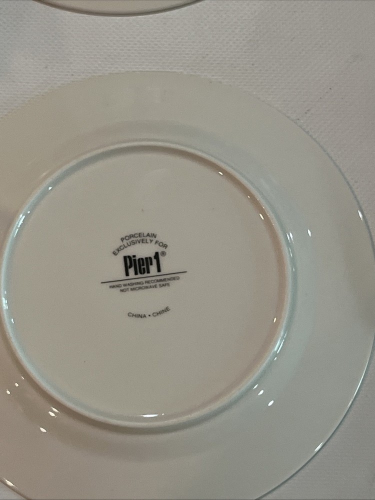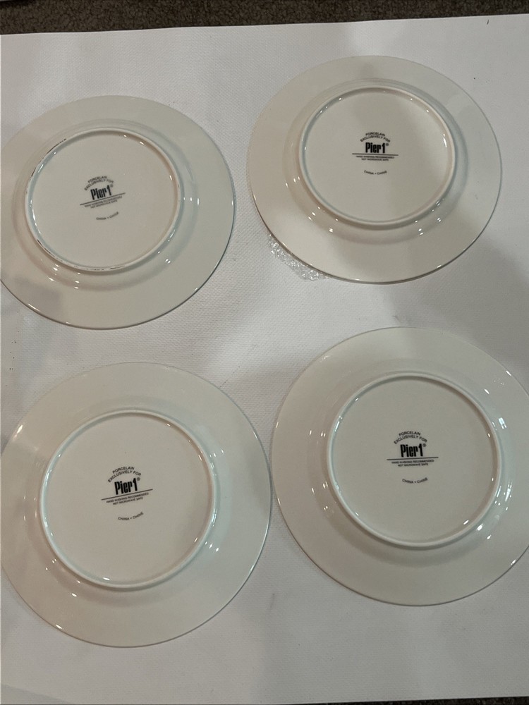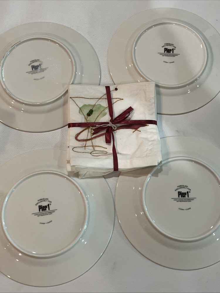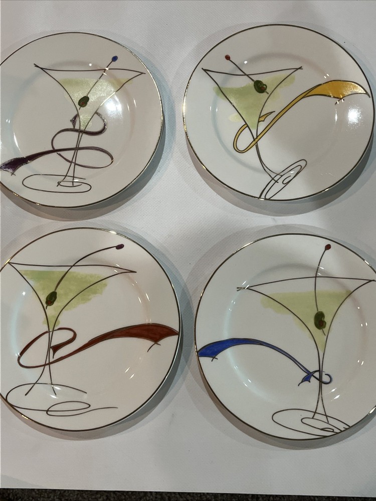 The product is a set of four Pier 1 Imports Martini appetizer plates, measuring 7.5 inches in diameter, perfect for serving cocktail party snacks. The plates feature a cocktail-themed pattern with a multicolor design and gold trim, adding a touch of elegance to your table setting. Made of porcelain with a stackable and decorative design, these round plates are ideal for entertaining guests and adding a festive touch to your dining area.