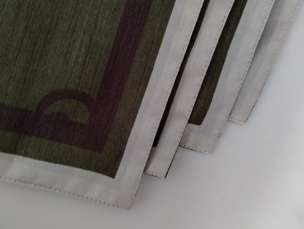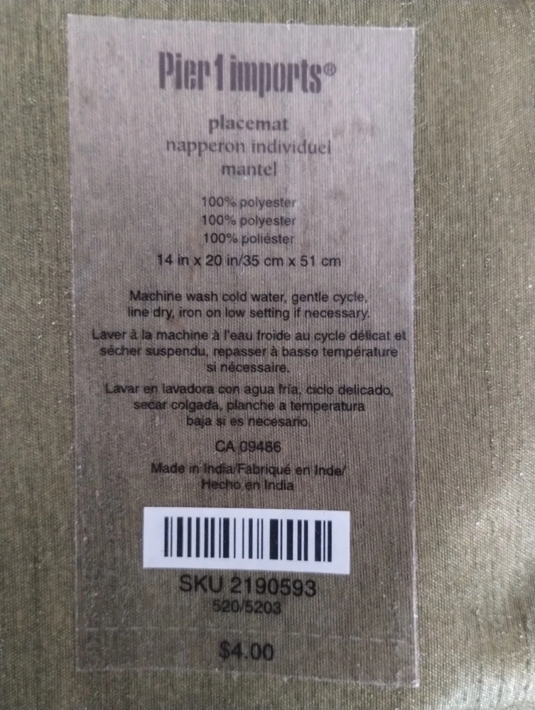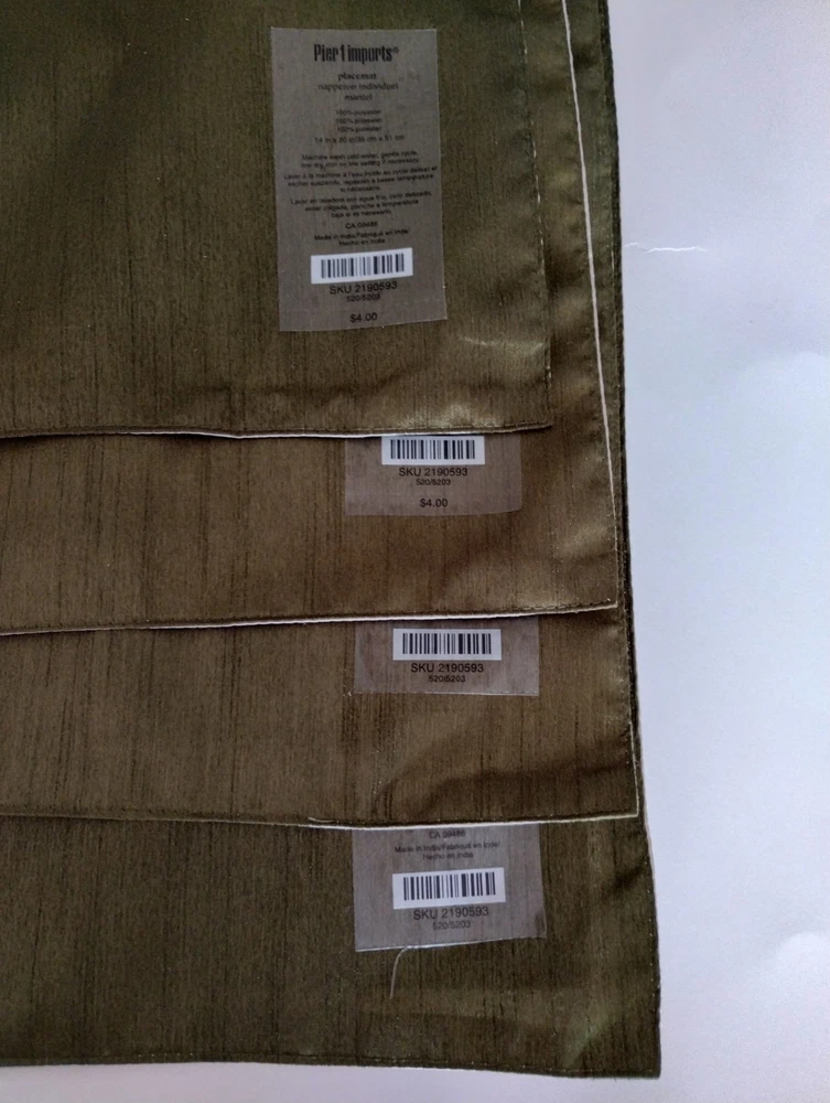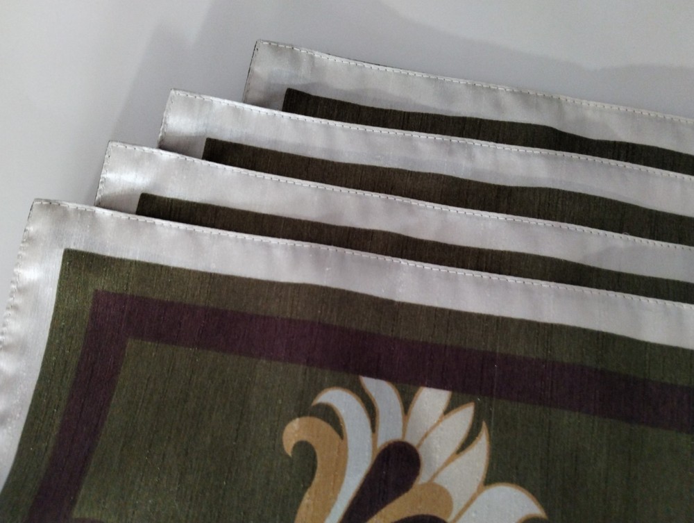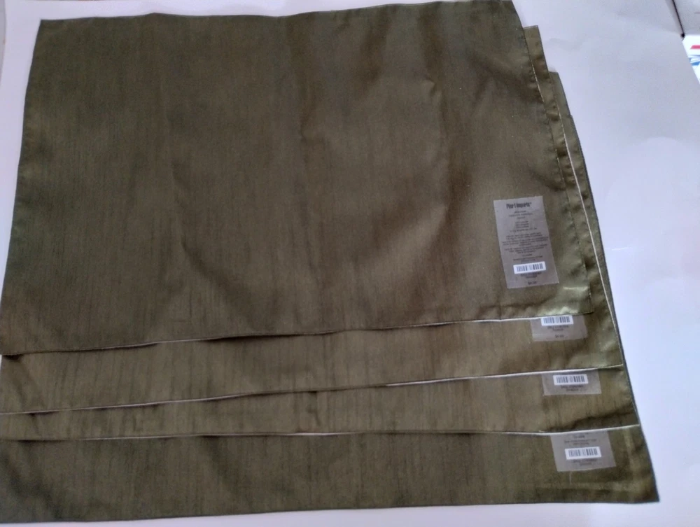 Lovely Pier 1 Imports placemats. They have a silk satin sheen to them in a dark olive green background. These are new with tags and have never been used before. Thank you for looking!