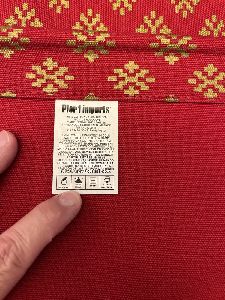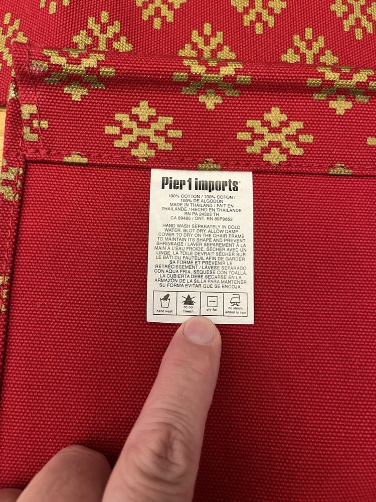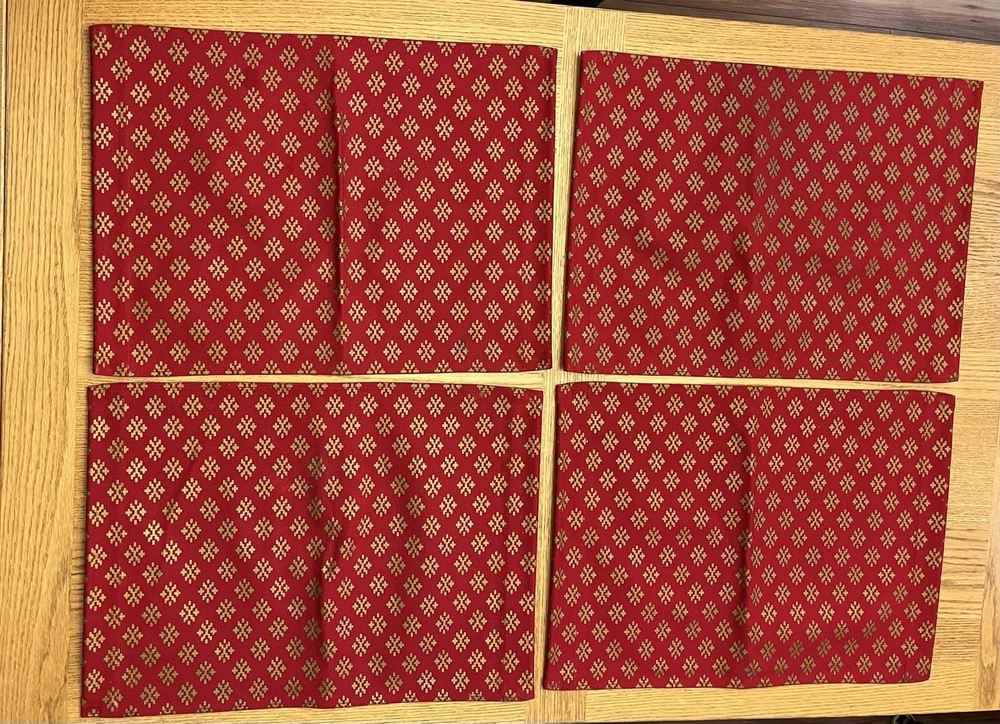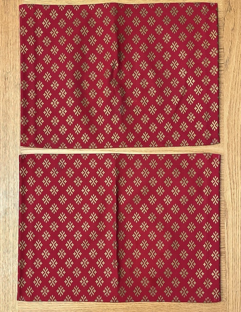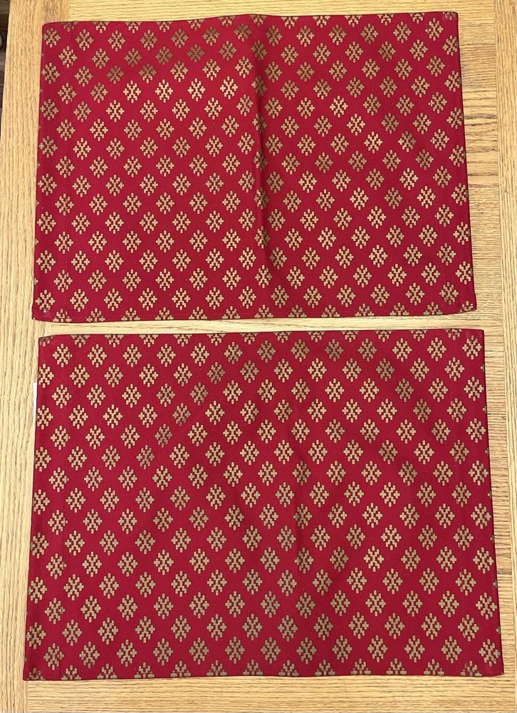 These Pier 1 Imports placemats are red/burgundy and feature a gold design, perfect for adding a touch of elegance to your dining table. Made of durable cotton material, these rectangular placemats measure 22x15.5 inches and have removable ‘spines’ as seen in the pictures. They are machine washable for easy cleaning. The set includes 4 placemats. Imported from India, these placemats are sure to enhance your dining experience with their stylish and versatile design. No stains, rips or repairs.