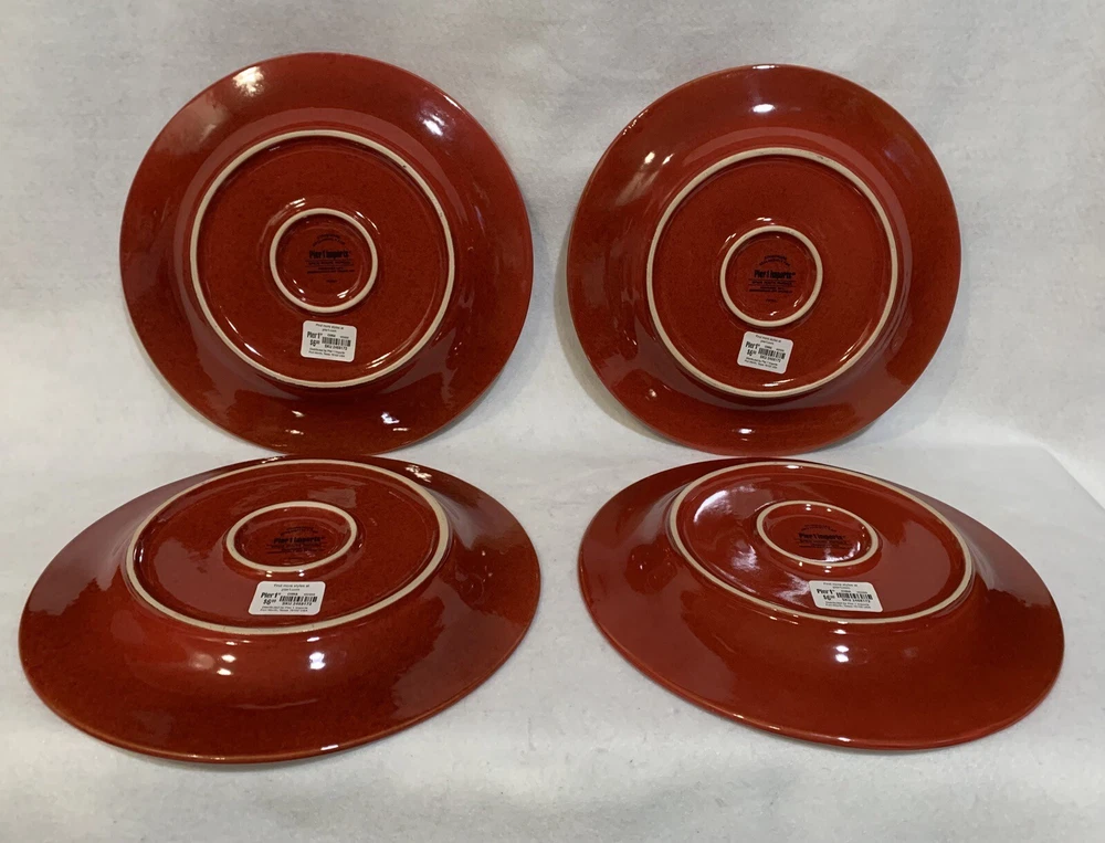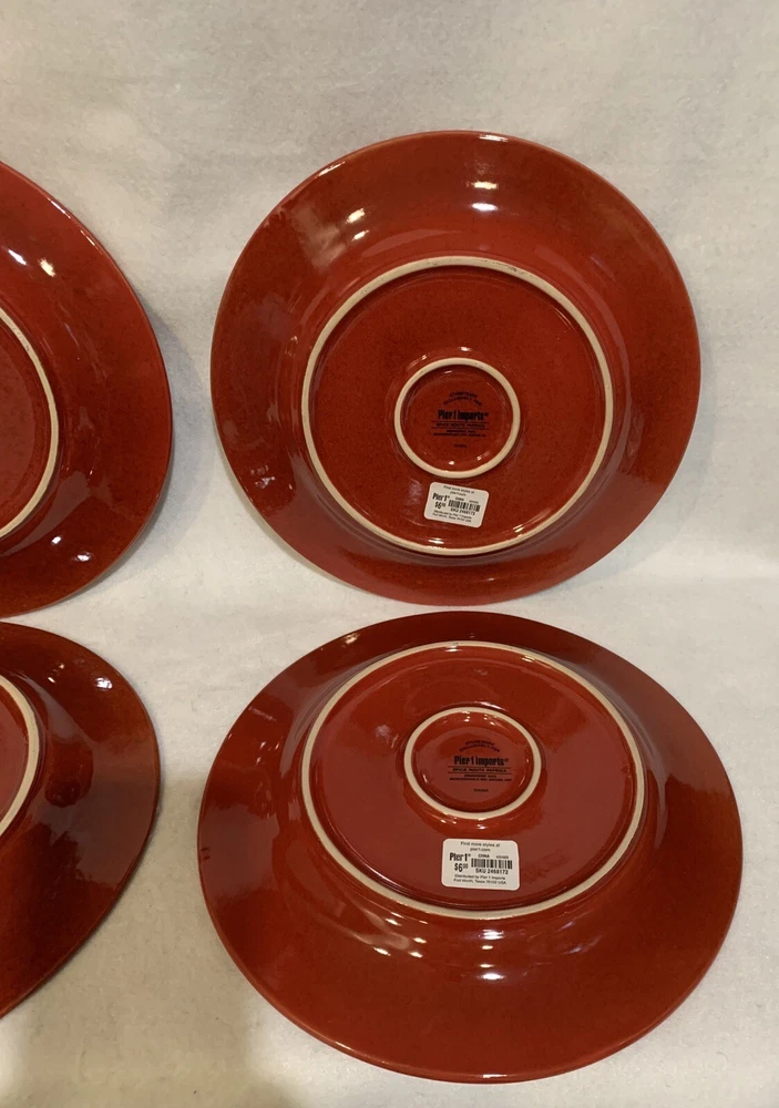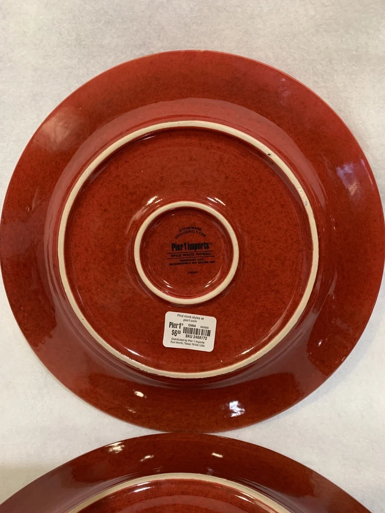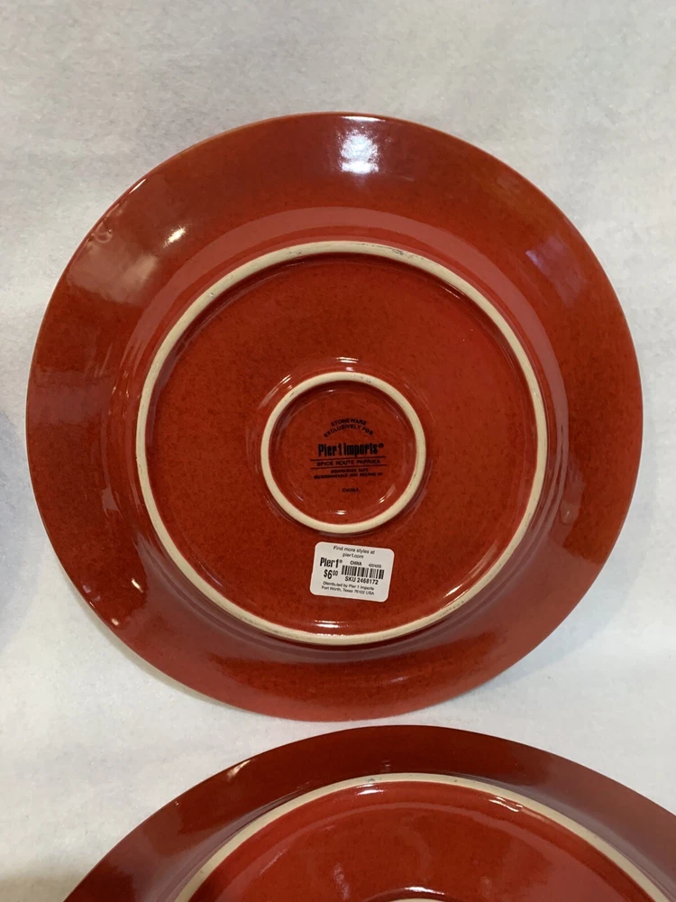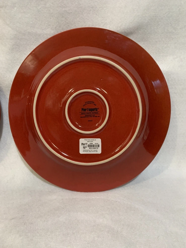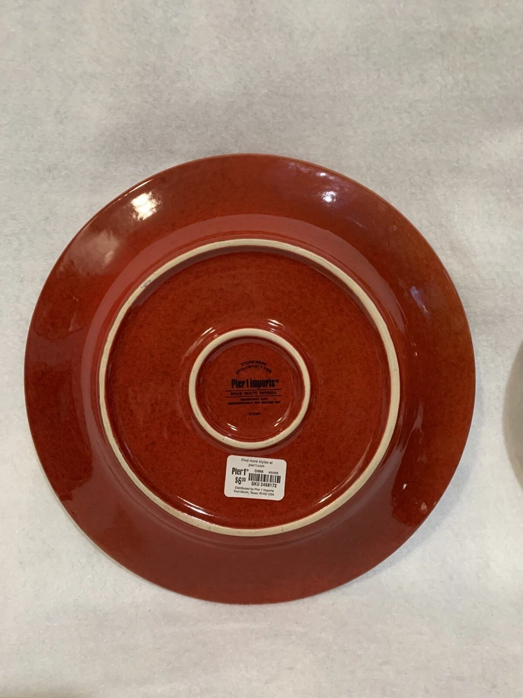 This listing is for a set of four 10-3/4 inch round dinner plates from Pier 1 Imports in the Spice Route pattern. The paprika colored stoneware plates still have their original Pier 1 sticker on the back. The plates have some scuff lines in their surface. They show up in a bright light but are difficult to photograph. The very first plate in the photos has a cut line in it and scuffs around the interior edges and is in the worst condition. They have no chips, cracks or crazing. They really are nice plates. Thank you for looking! POP360