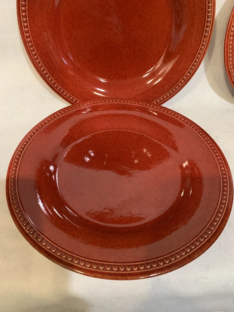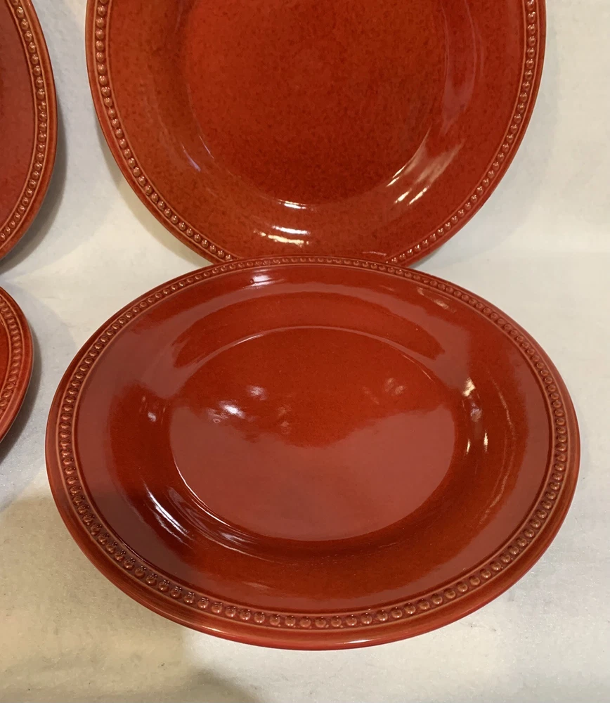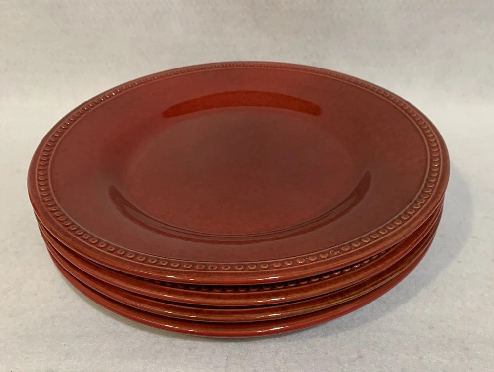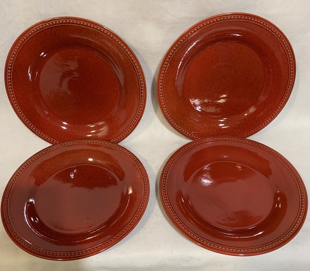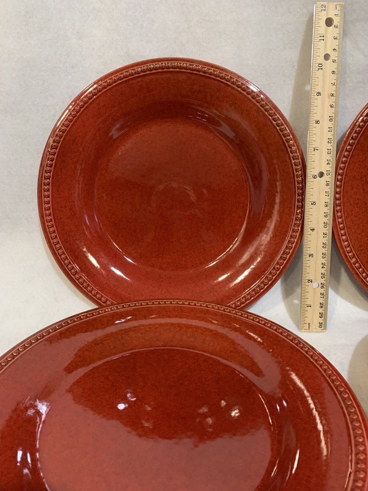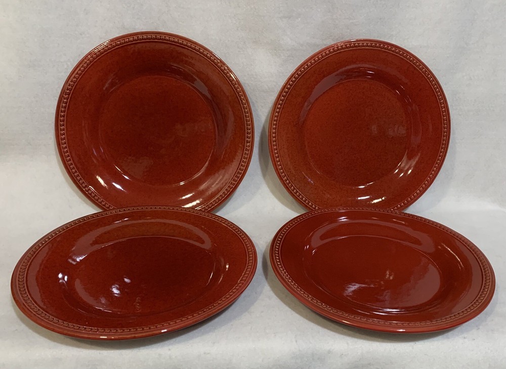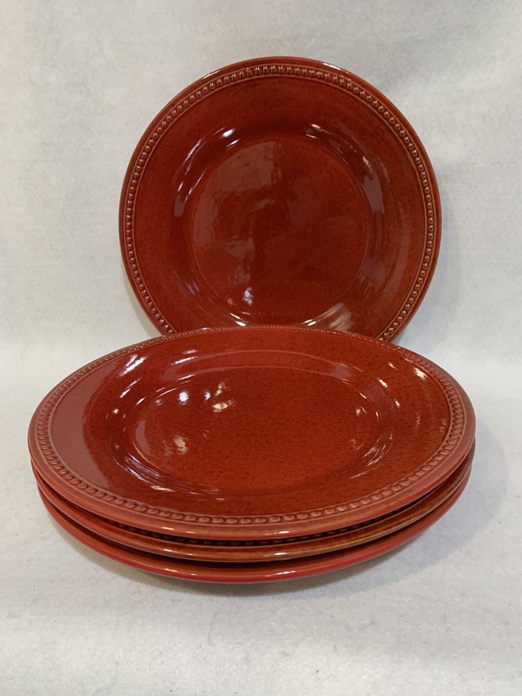 This listing is for a set of four 10-3/4 inch round dinner plates from Pier 1 Imports in the Spice Route pattern. The paprika colored stoneware plates still have their original Pier 1 sticker on the back. The plates have some scuff lines in their surface. They show up in a bright light but are difficult to photograph. The very first plate in the photos has a cut line in it and scuffs around the interior edges and is in the worst condition. They have no chips, cracks or crazing. They really are nice plates. Thank you for looking! POP360