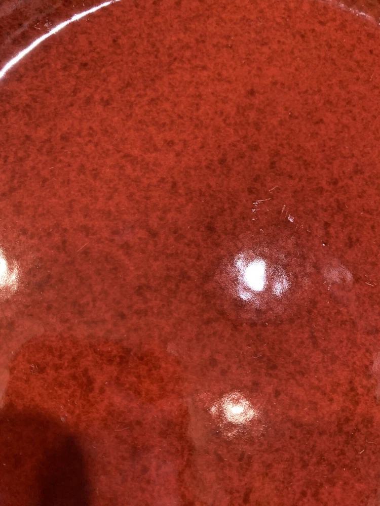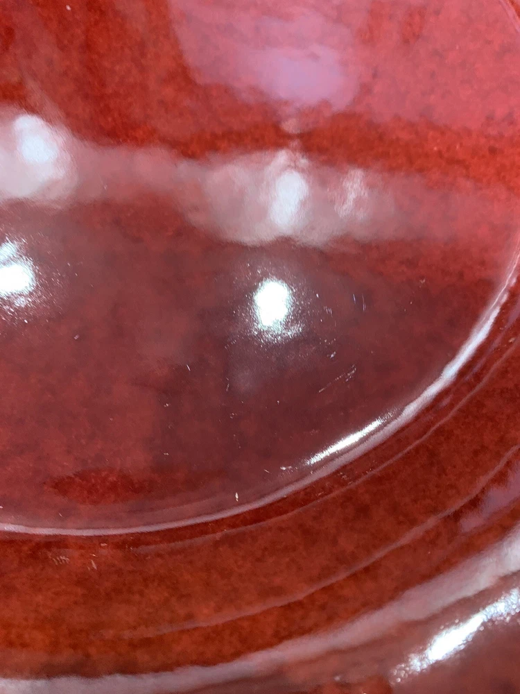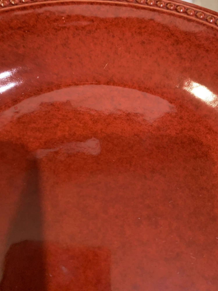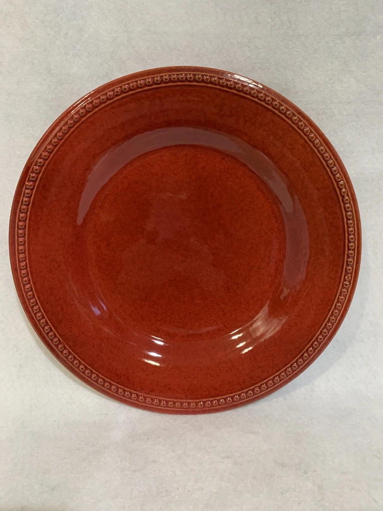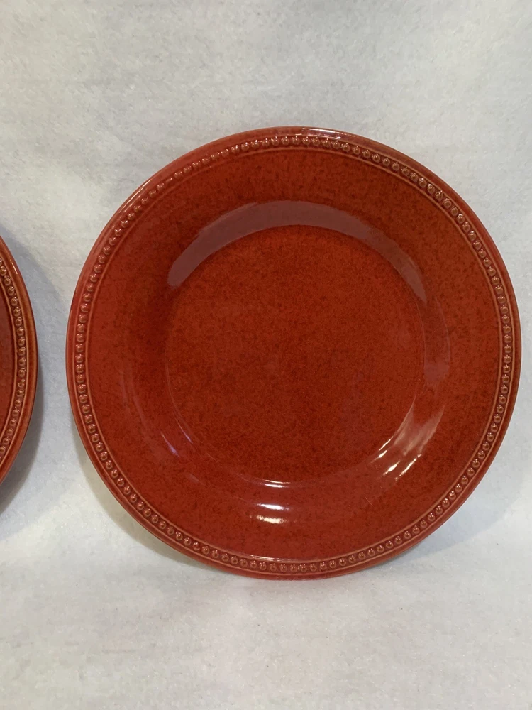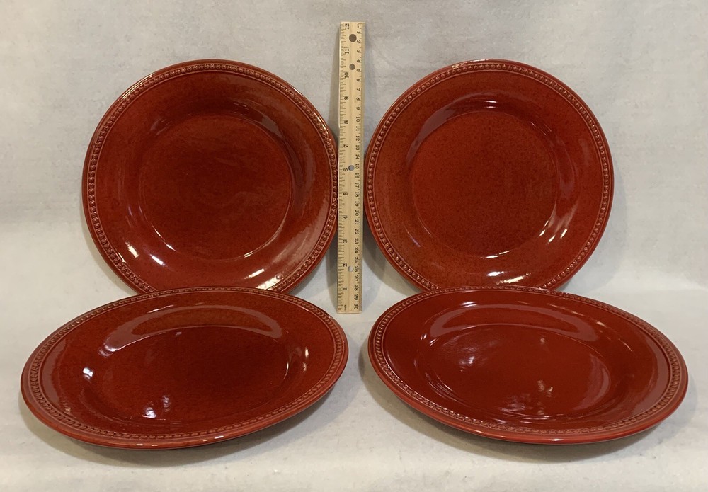 This listing is for a set of four 10-3/4 inch round dinner plates from Pier 1 Imports in the Spice Route pattern. The paprika colored stoneware plates still have their original Pier 1 sticker on the back. The plates have some scuff lines in their surface. They show up in a bright light but are difficult to photograph. The very first plate in the photos has a cut line in it and scuffs around the interior edges and is in the worst condition. They have no chips, cracks or crazing. They really are nice plates. Thank you for looking! POP360