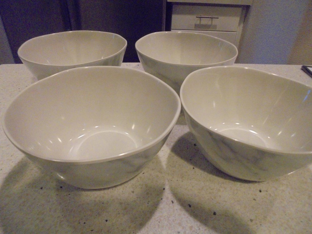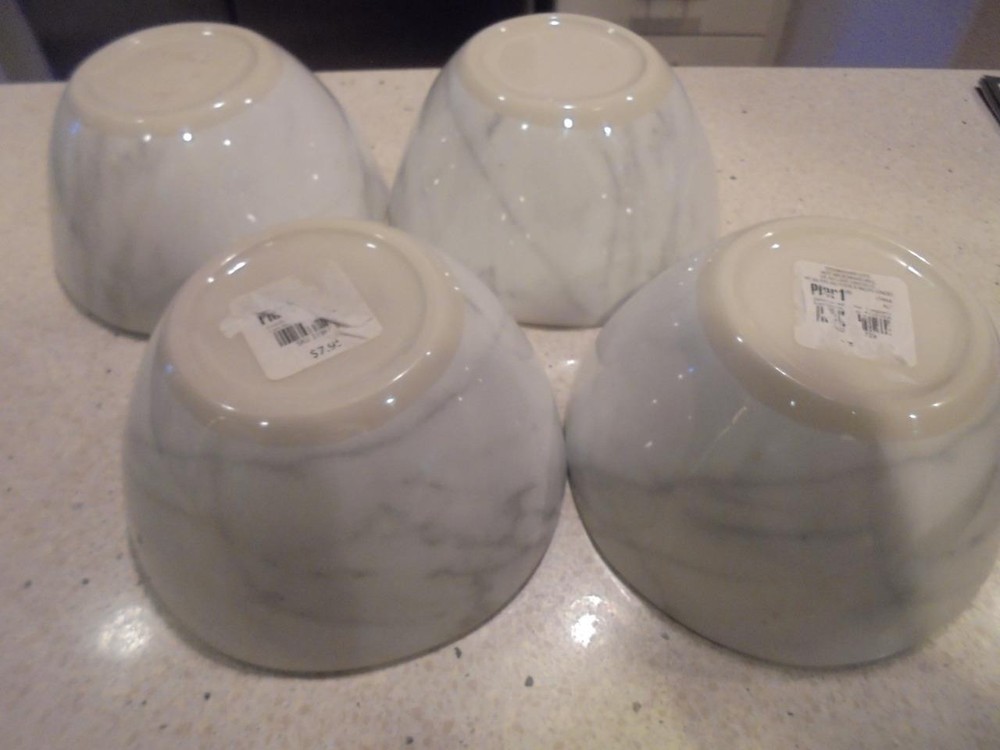 4 white/gray Pier 1 Imports melamine all purpose bowls perfect condition ~ low fast shipping! 4 white/gray Pier 1 Imports melamine all purpose bowls perfect condition ~ low fast shipping! Click images to enlarge Description For sale are four white/gray all-purpose melamine (plastic) bowls plates from Pier 1 Imports. They measure 6" in diameter and 2 7/8" deep. They are not brand-new, but are in perfect condition. They are dishwasher safe (on the top rack), but not safe in the microwave. I have a smoke-free home. These are really nice bowls! Please be sure you want these bowls before bidding or buying, please check out the supersized photos. I am happy to answer questions, just ask. Please do not bid or buy if you do not intend to or cannot pay; I contact eBay to report non-paying bidders and buyers. I need to have payment within three days for my items sold in auction format and immediate payment for my buy it now items; please do not bid or buy if you do not accept my terms. I will ship these bowls anywhere in the U.S. by USPS ground advantage mail for $15.00. This also includes insurance for loss or damage, a tracking number and delivery confirmation. I go to the post office every day and ship all items that I have received payment for. Thanks for looking and happy eBaying! 050824 Get images that make Supersized seem small. Showcase your items with Auctiva's Listing Templates! THE simple solution for eBay sellers. Track Page Views With Auctiva's Counter