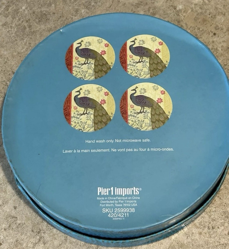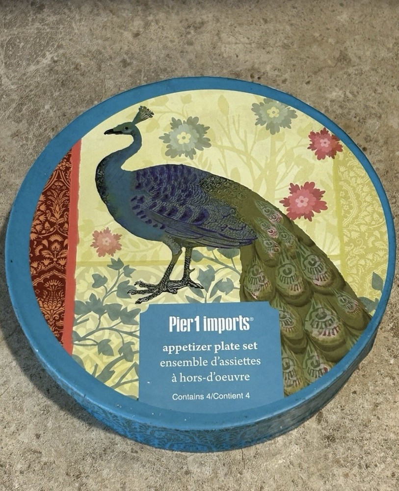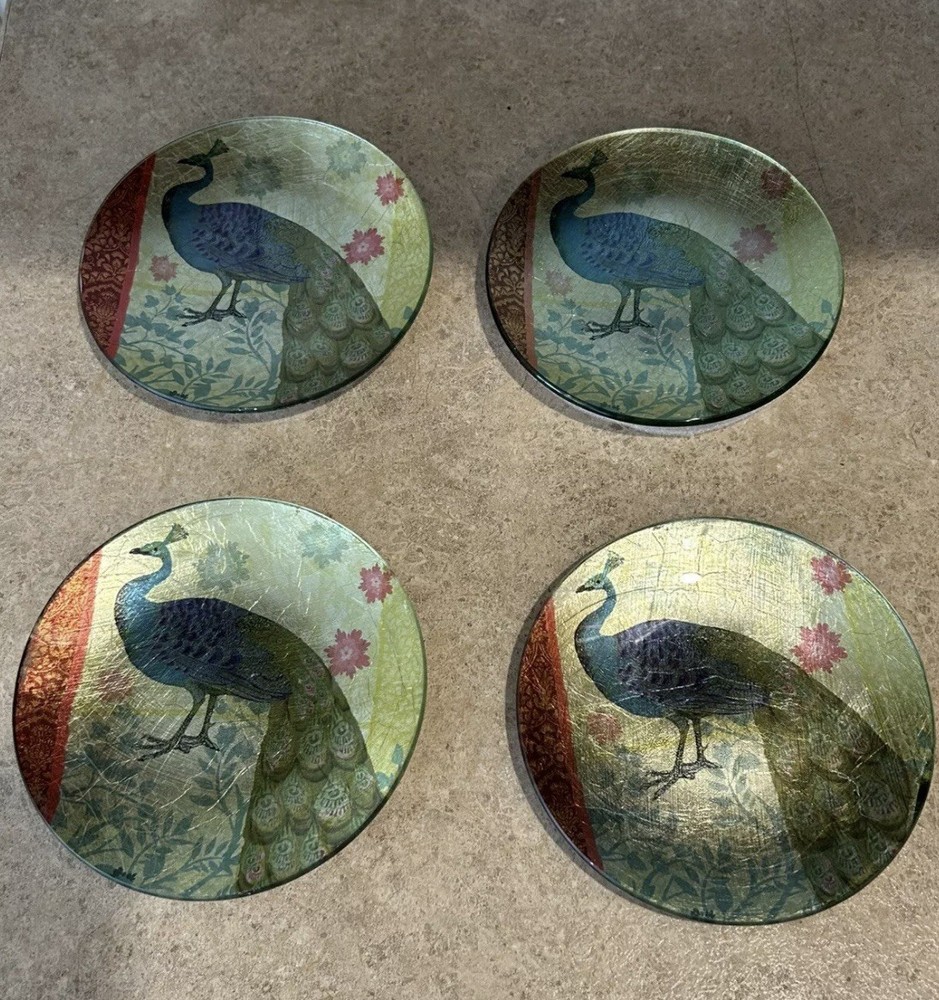 Beautiful Pier 1 Imports Peacock Appetizer Plate~Set of 4~Glass, Foil and Metallic. New in the Box! These are in excellent condition. However, they do have very minor flaws that appear to be in the making. New in the box! Never used! These are hand wash only and are not microwaveable. See my 100% positive feedback and buy with confidence!