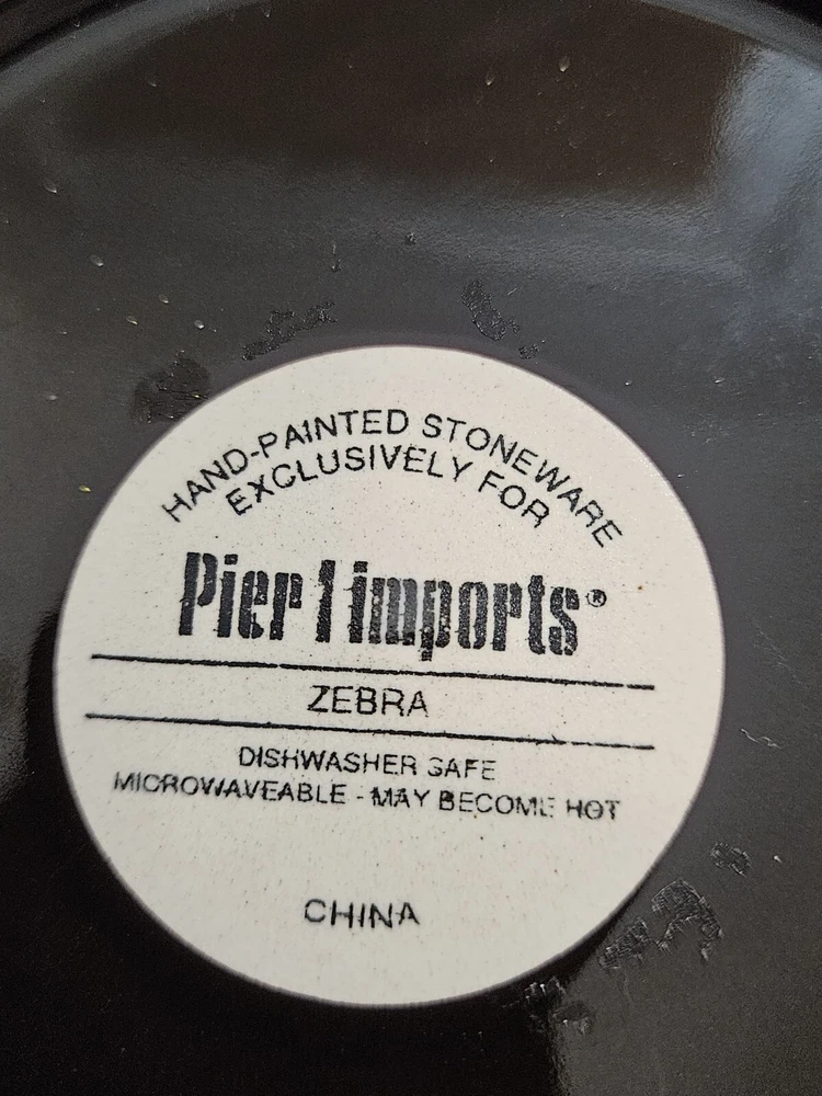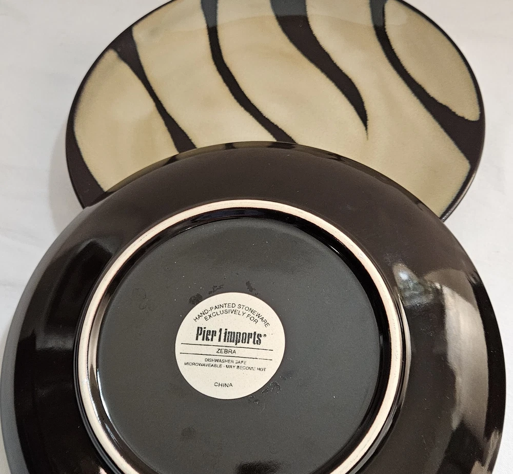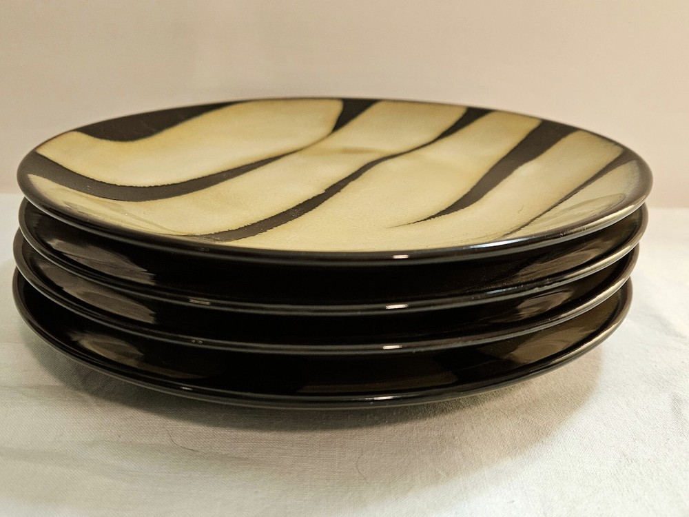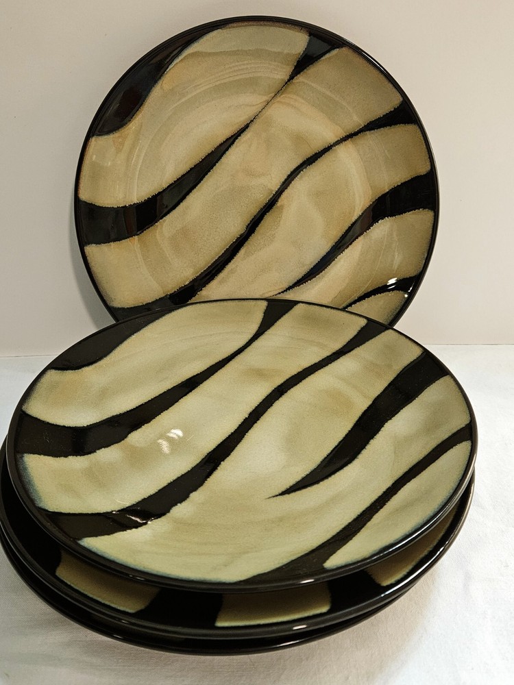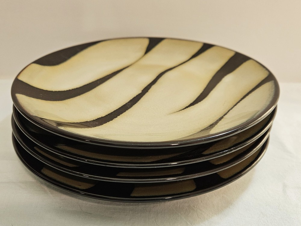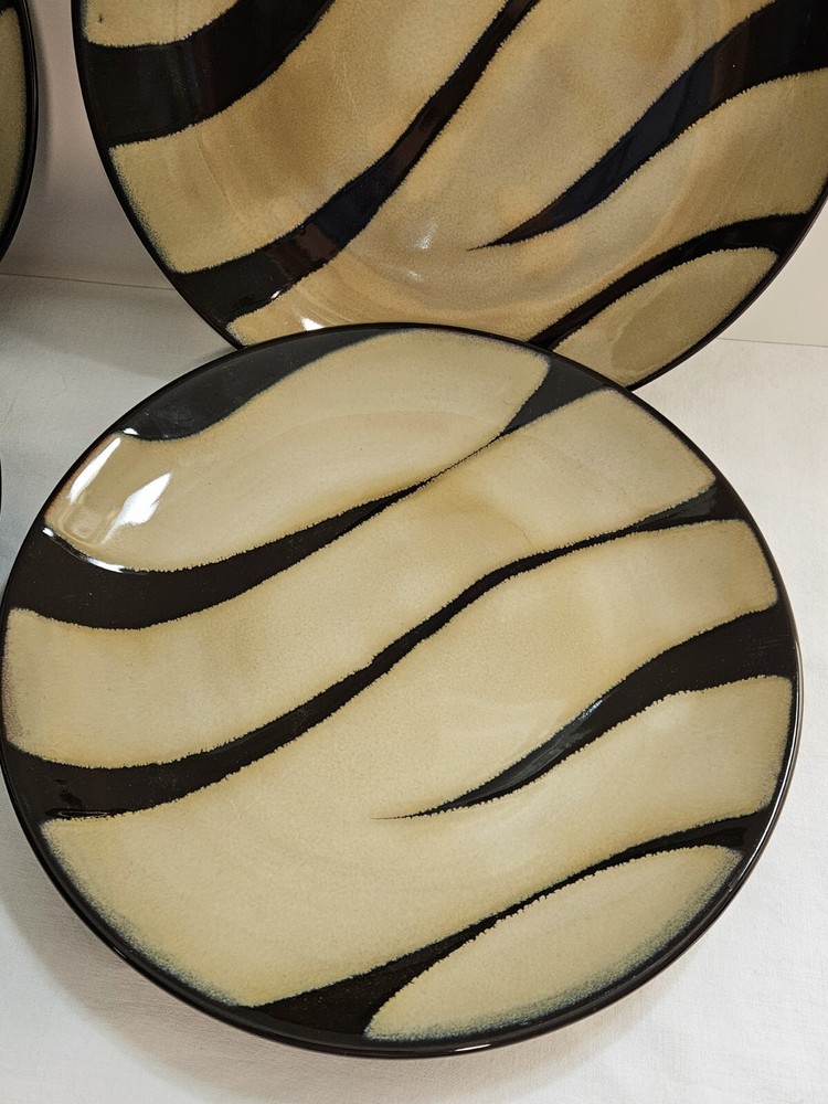 Hand-Painted Previously Owned. No Chips, Cracks, Breaks or Repairs. No Crazing. No Utensil Marks. Nice and Shiny with a Glossy finish. Beautiful 4-piece salad plate set from Pier 1 Imports. The 4 plates have a matching zebra print pattern in black and tan that will complement any safari-themed decor. Each plate is made of stoneware with a beautiful glaze. Nice and sturdy, each place weighs an amazing 15 ounces each. These plates are stackable and can be washed in the dishwasher and also used in the microwave. The plates are 8 inches in diameter and have a printed backstamp. Packaged by professionals.