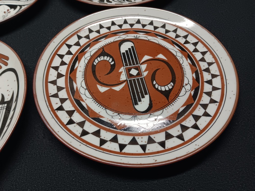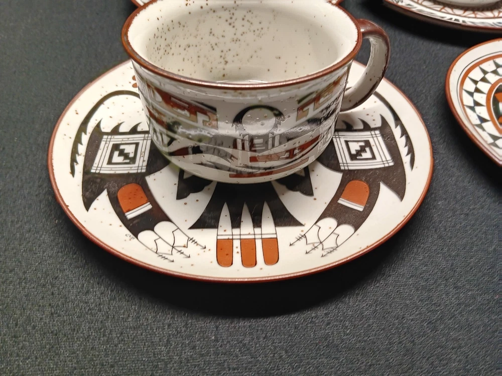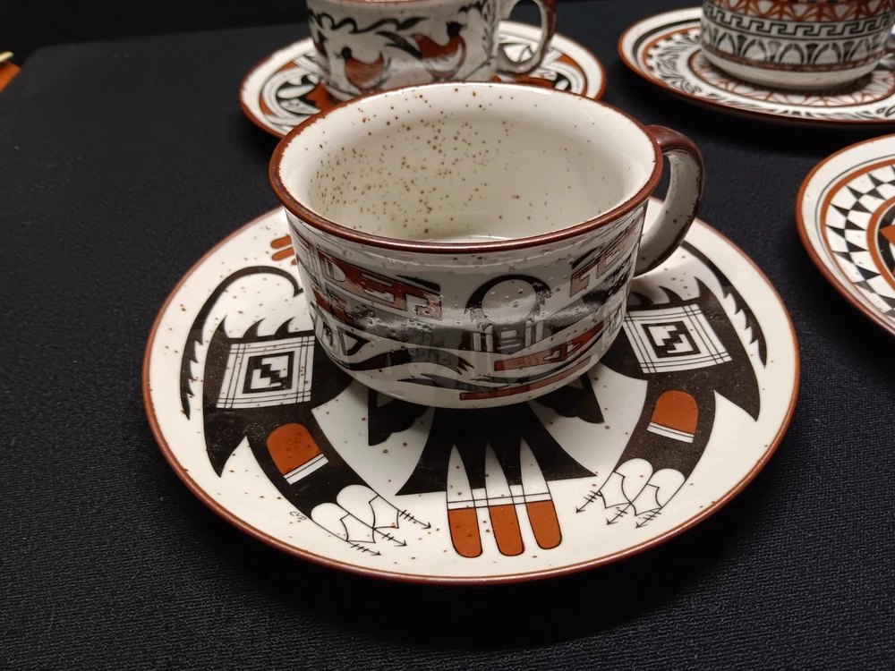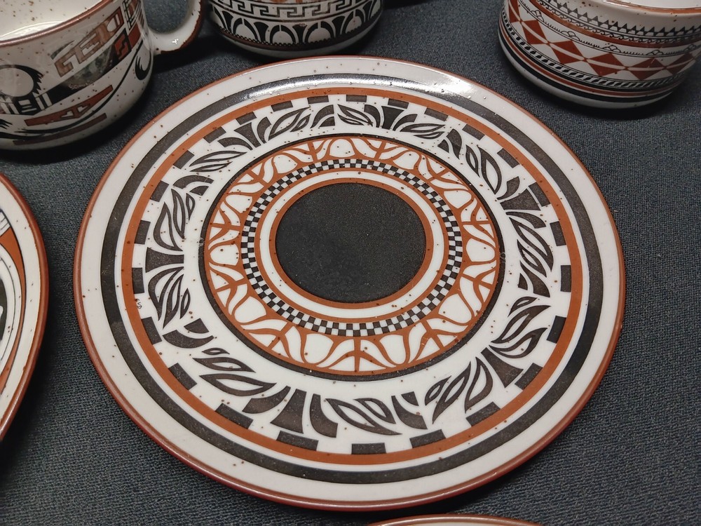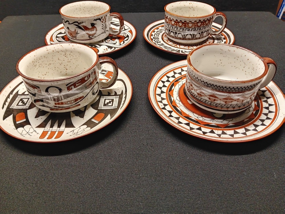 This listing is for a hard to find set made by Vandor imports. There are 4 different 8 1/8" plate designs with matching 4 1/4" wide cups. We found other items online with paper labels. These have no markings. They are in very good condition with no chips nicks or cracks. We really haven't found signs of use. The designs are taken from Native American pottery and the initials CVD are on some of the pieces. These could be a great addition to your party or dinnerware setting, thank you for looking.